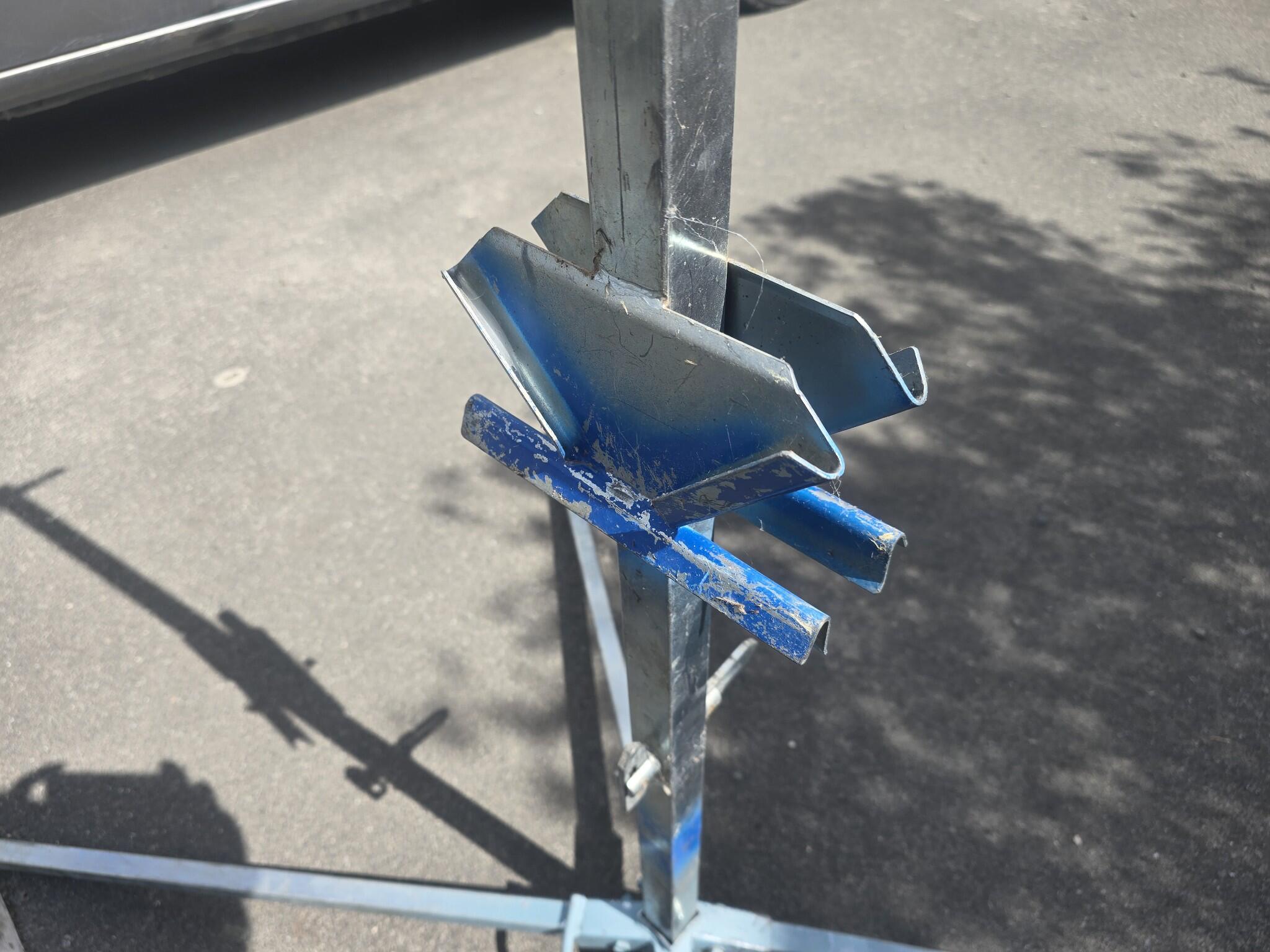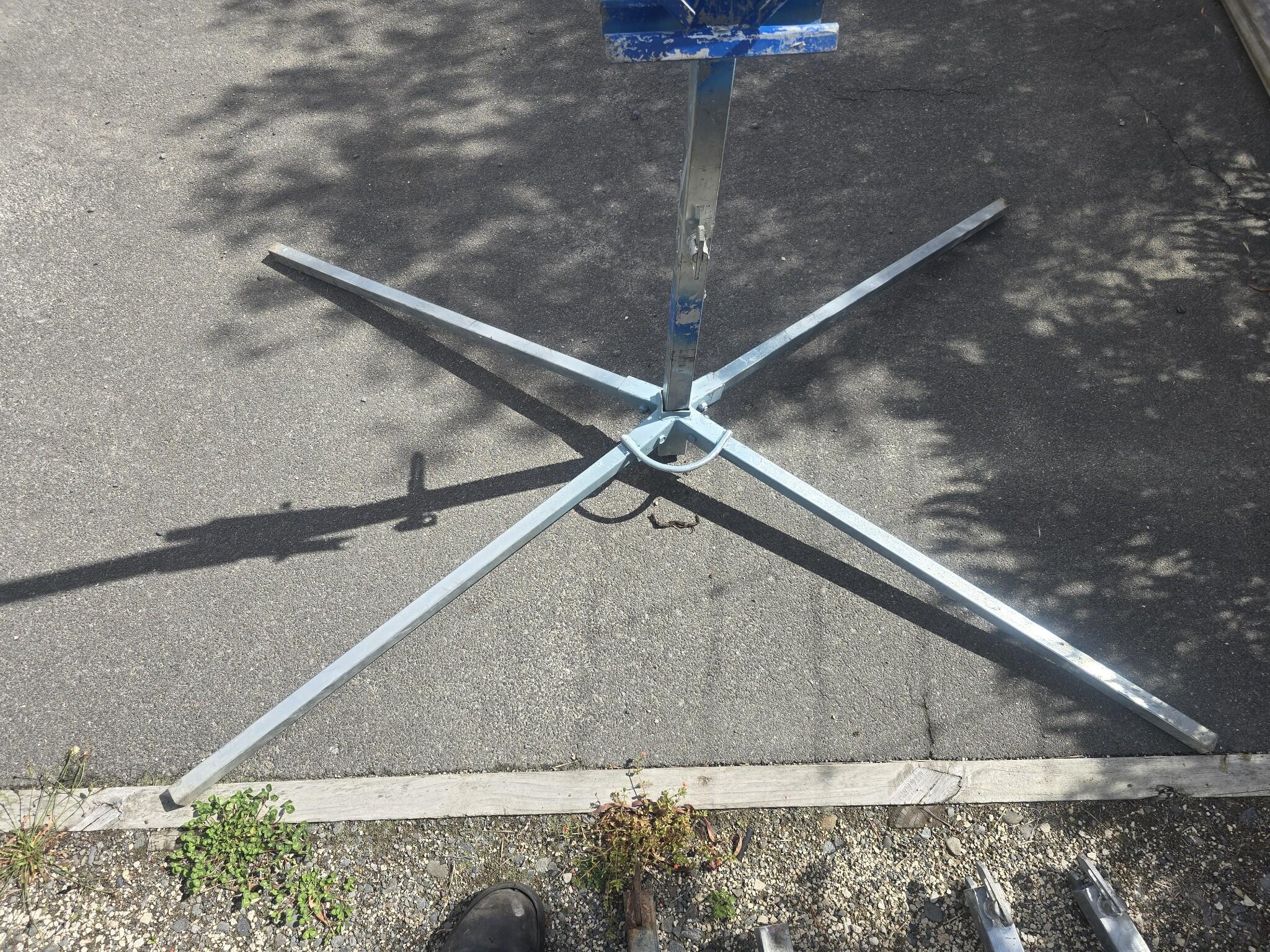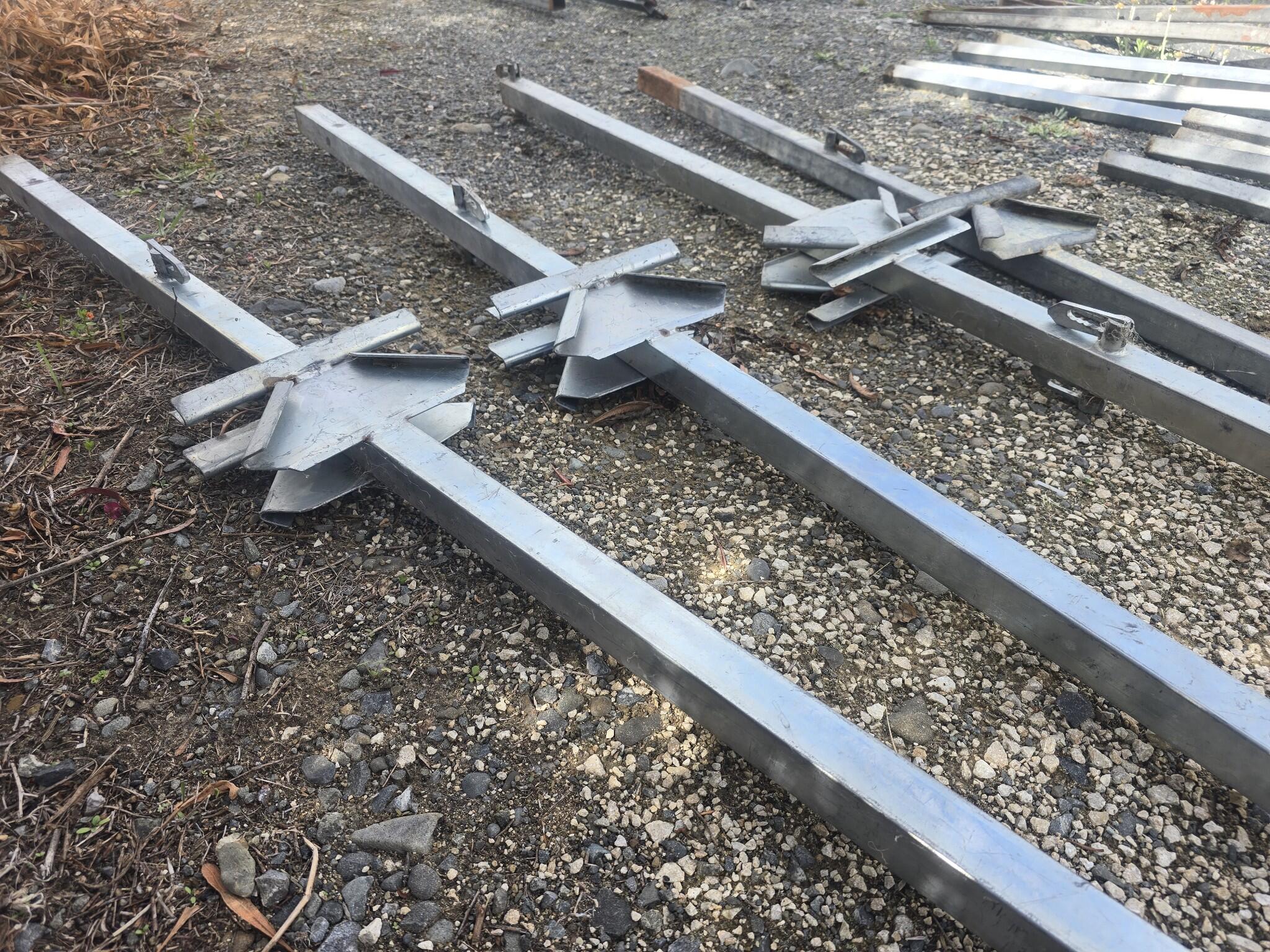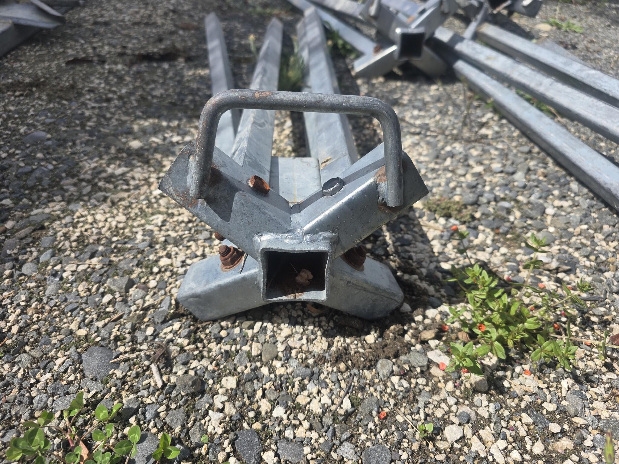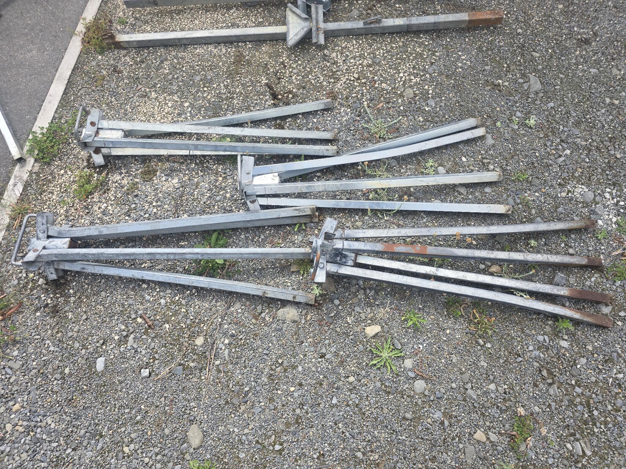 Lot of steel stands and steel uprights. Tripod stands are made from square hollow section steel. Each tripod stand has three folding legs. Tripod heads have welded sockets for vertical uprights. Road sign stands