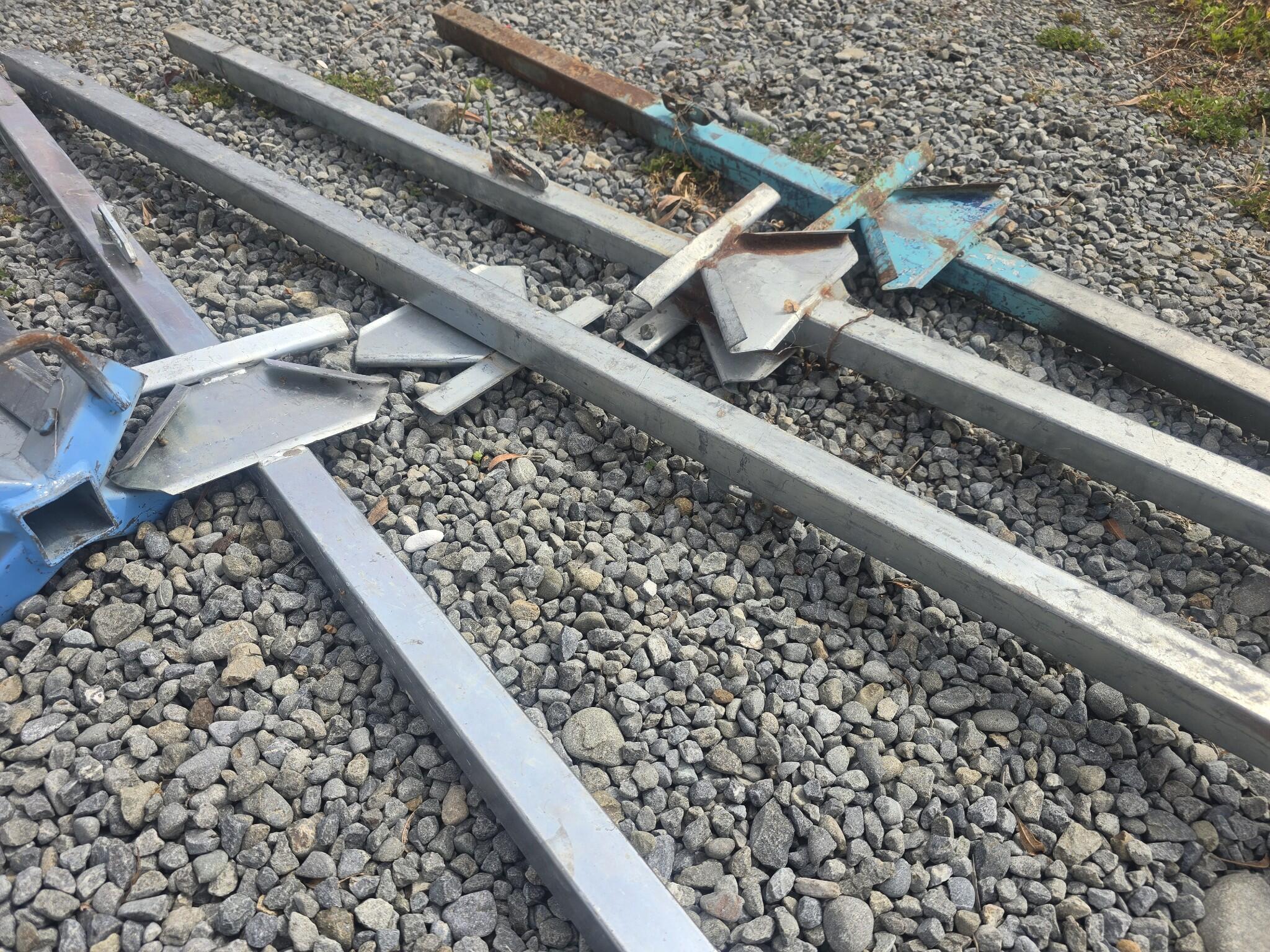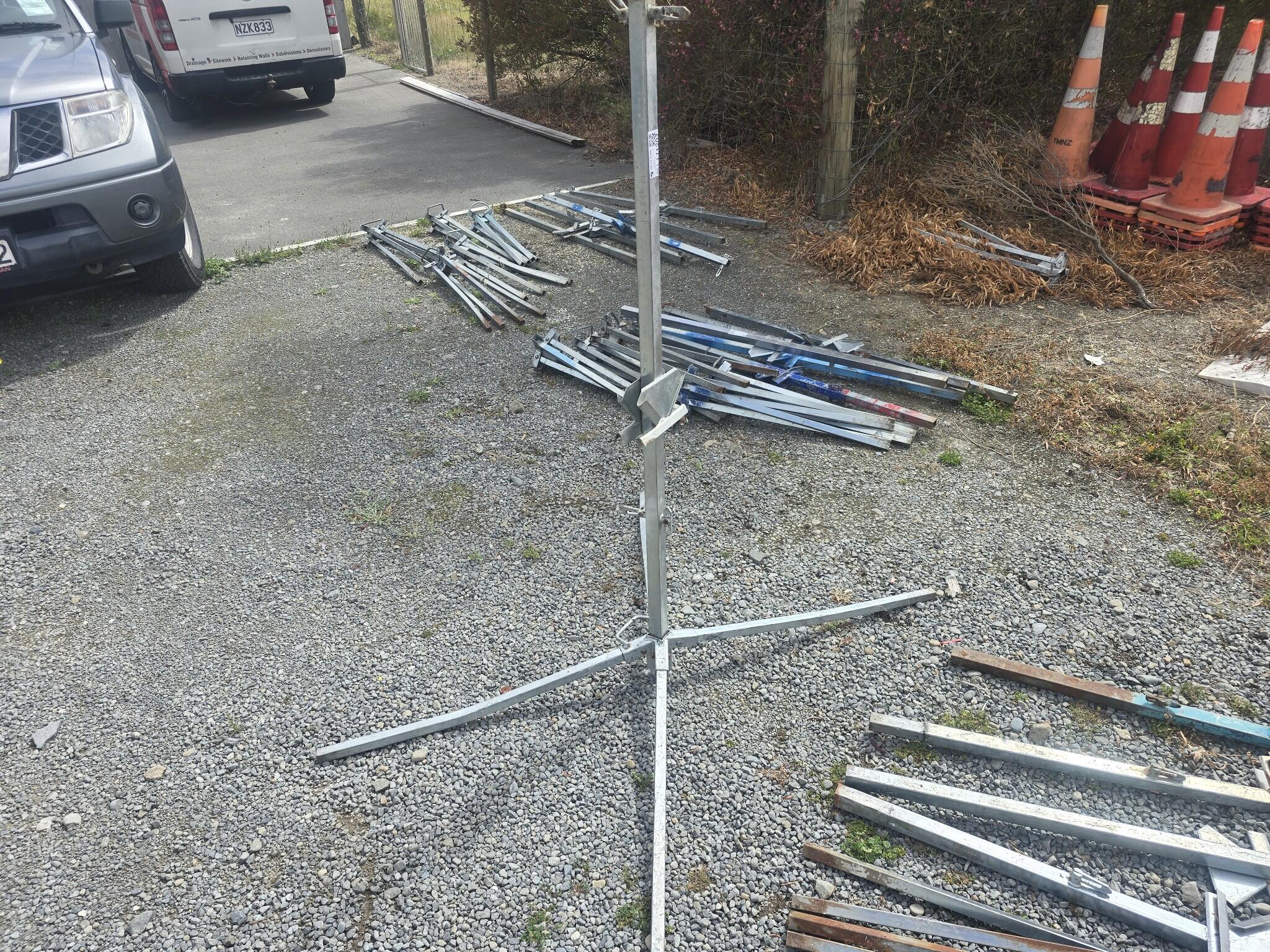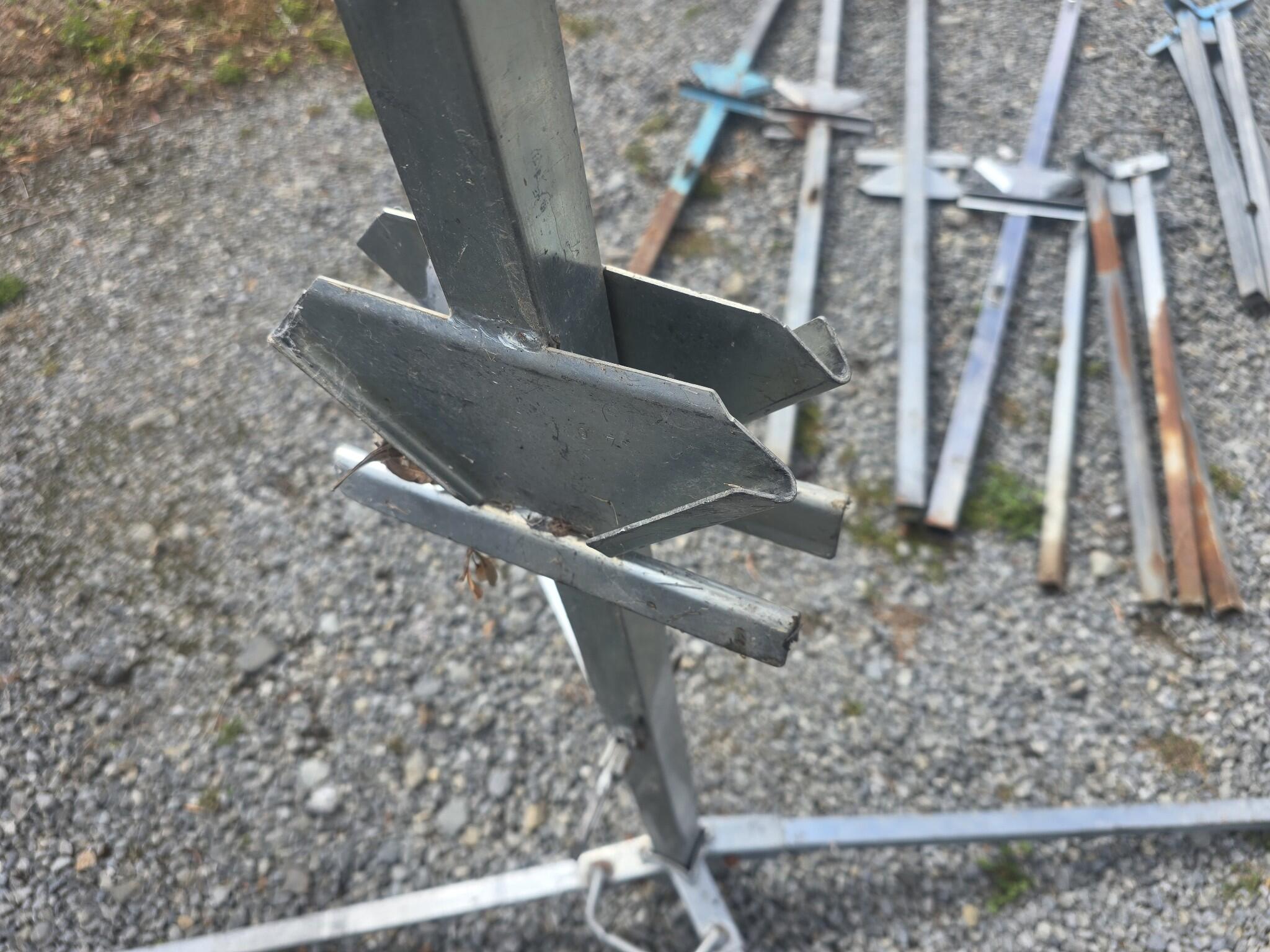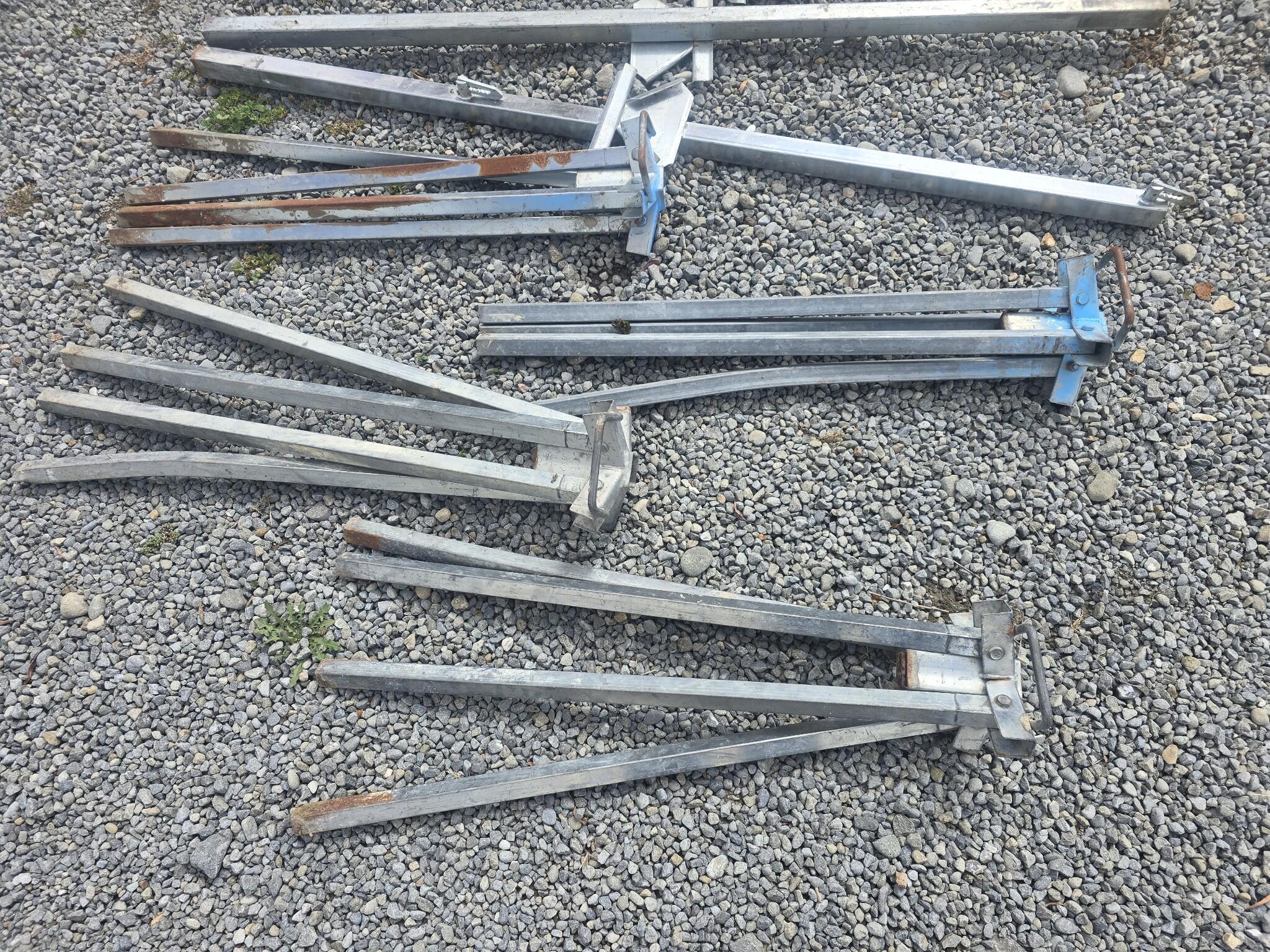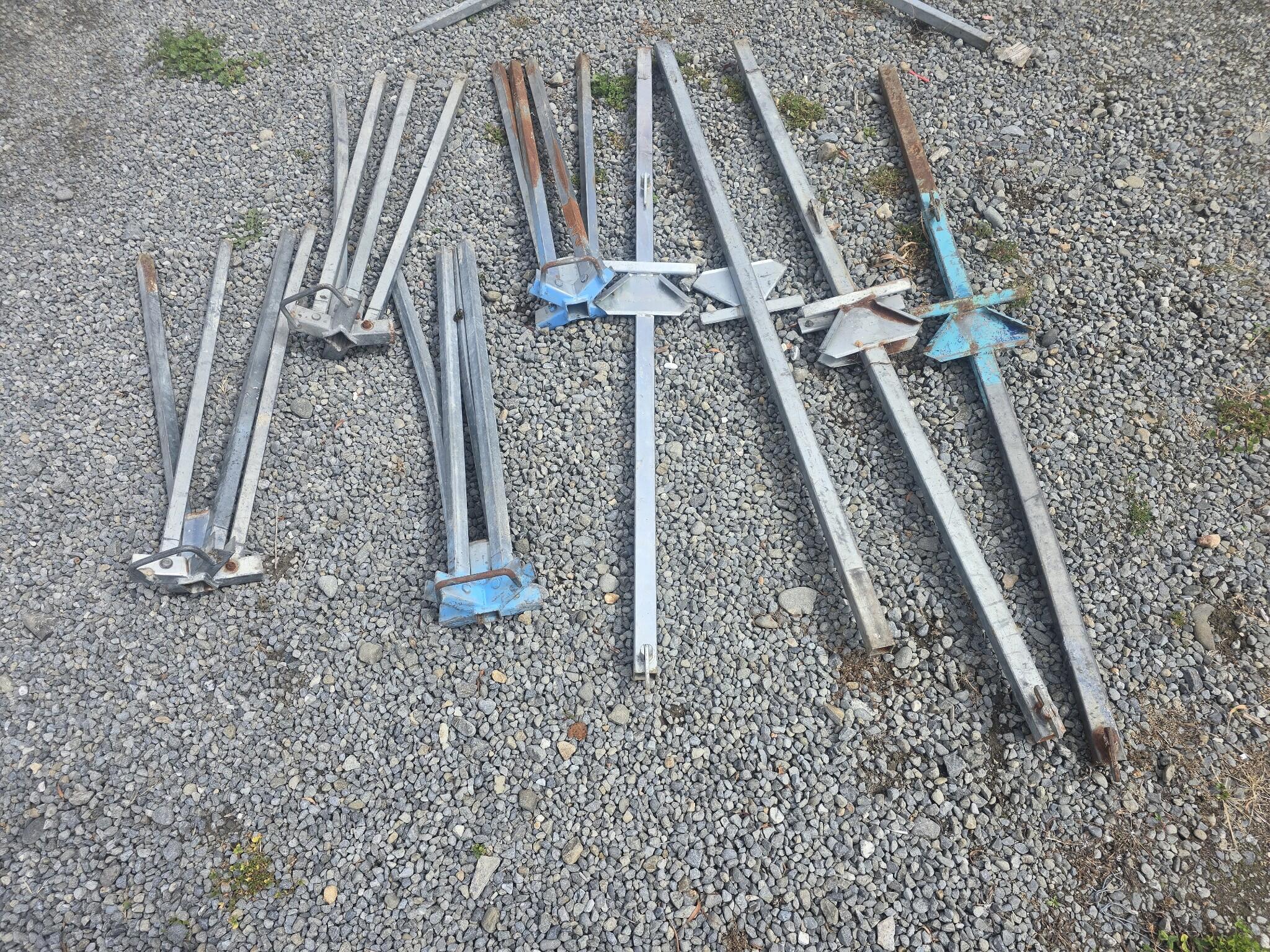 Lot of steel stands and steel uprights. Tripod stands are made from square hollow section steel. Each tripod stand has three folding legs. Tripod heads have welded sockets for vertical uprights. Road sign stands