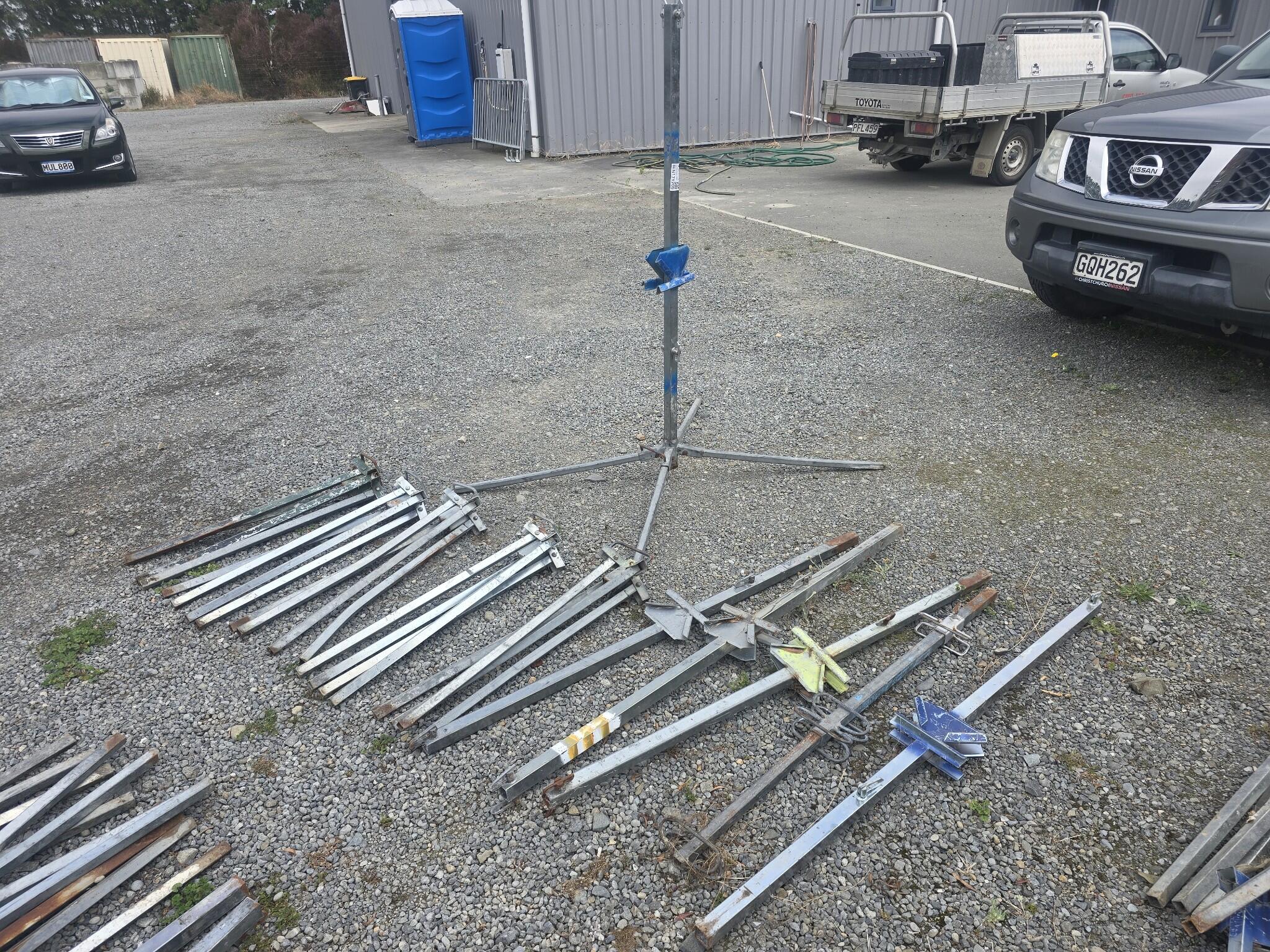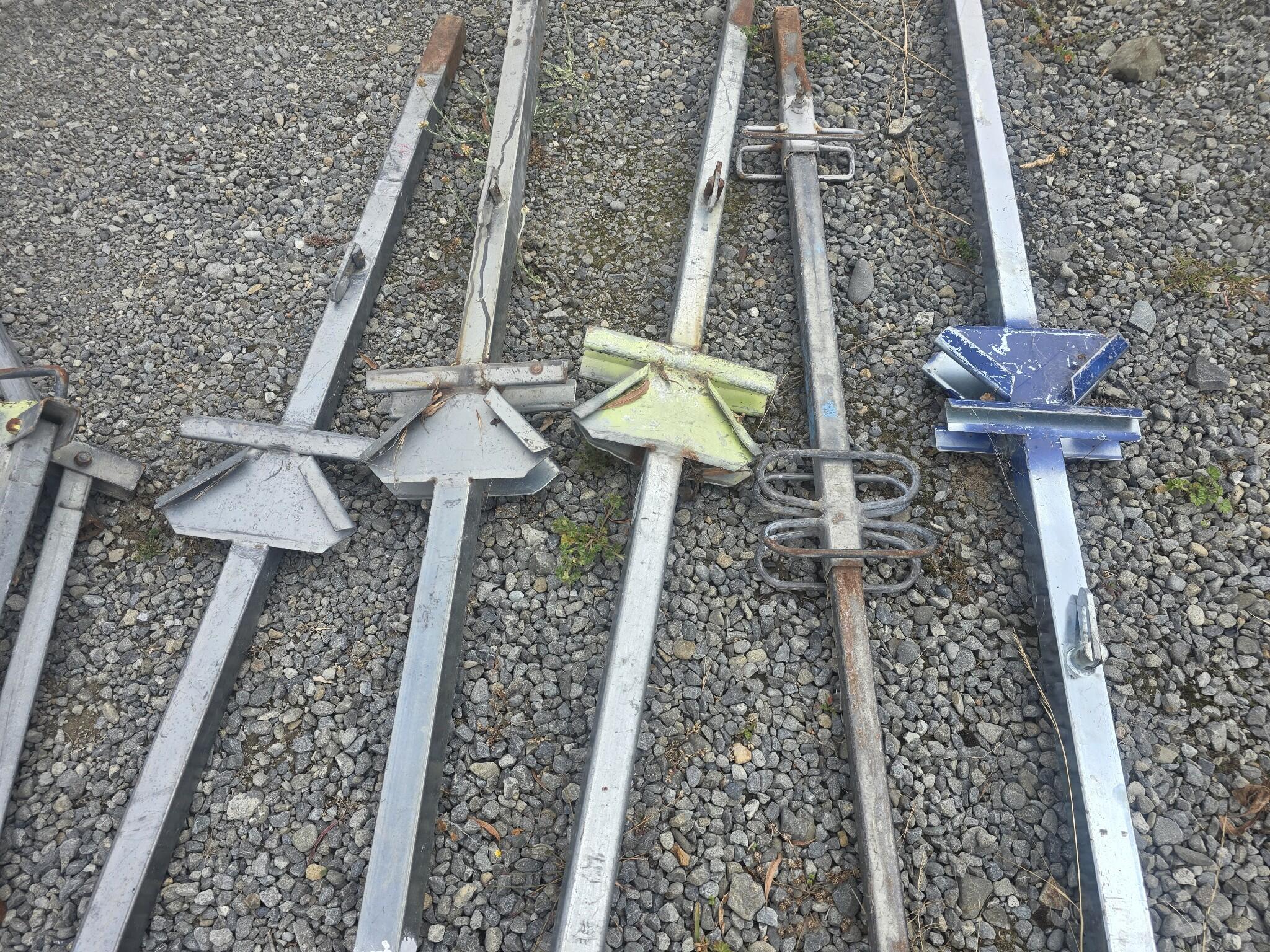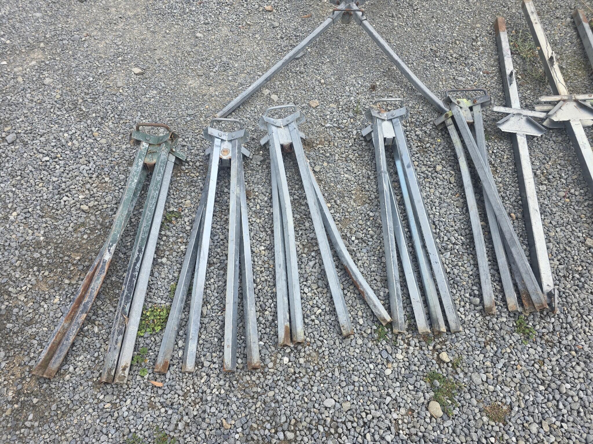 Lot of steel stands and steel uprights. Tripod stands are made from square hollow section steel. Each tripod stand has three folding legs. Tripod heads have welded sockets for vertical uprights. Road sign stands