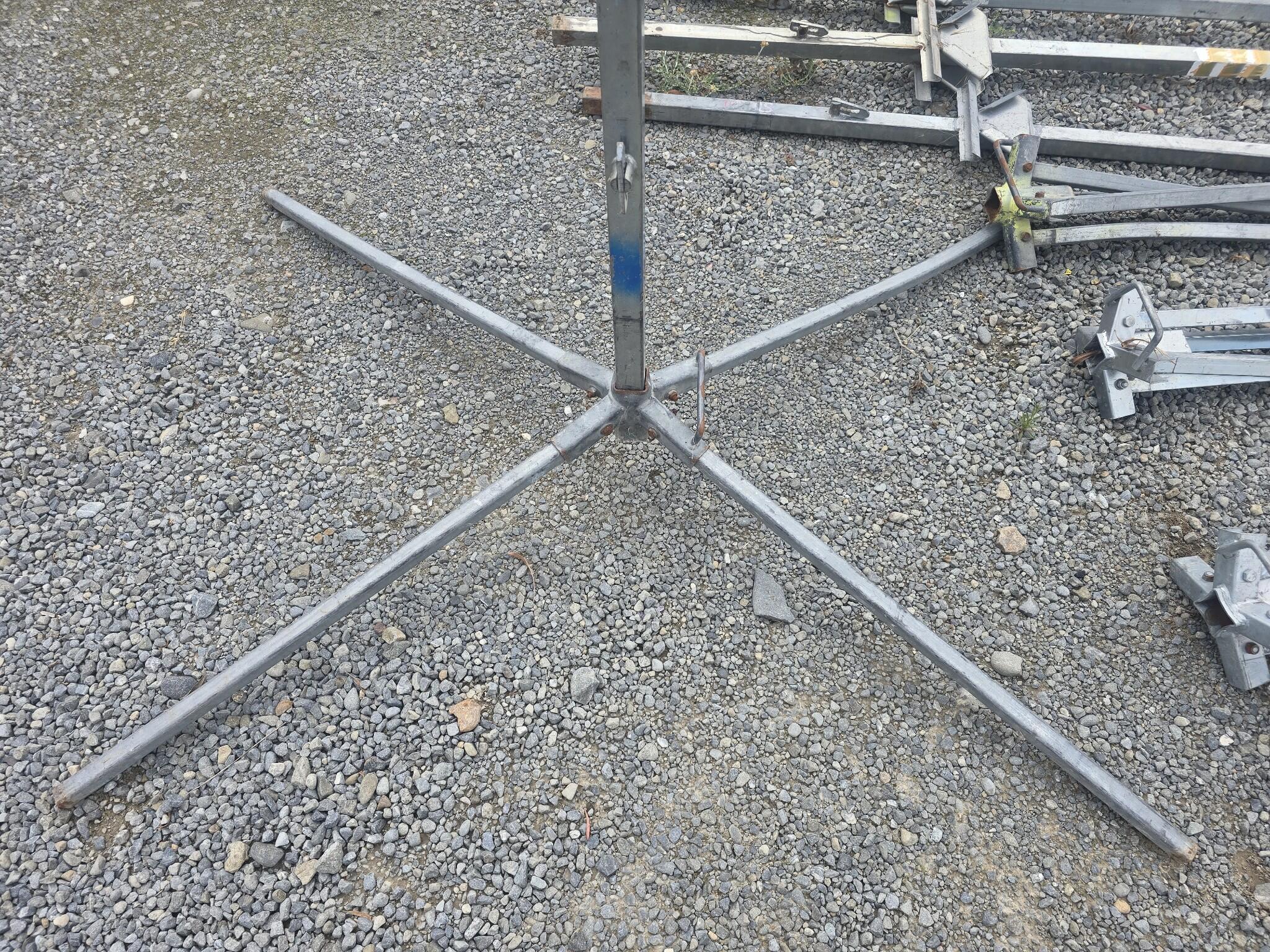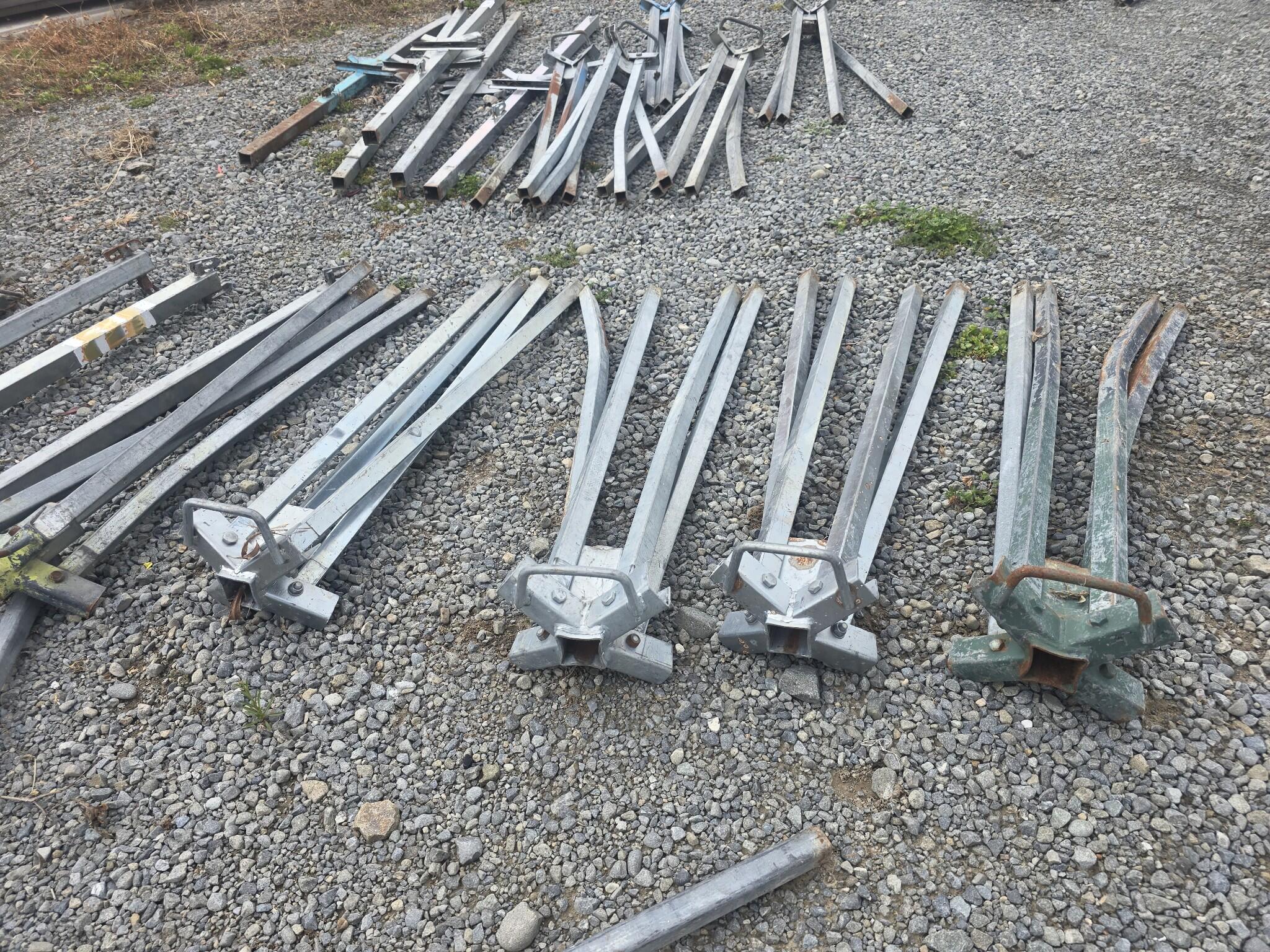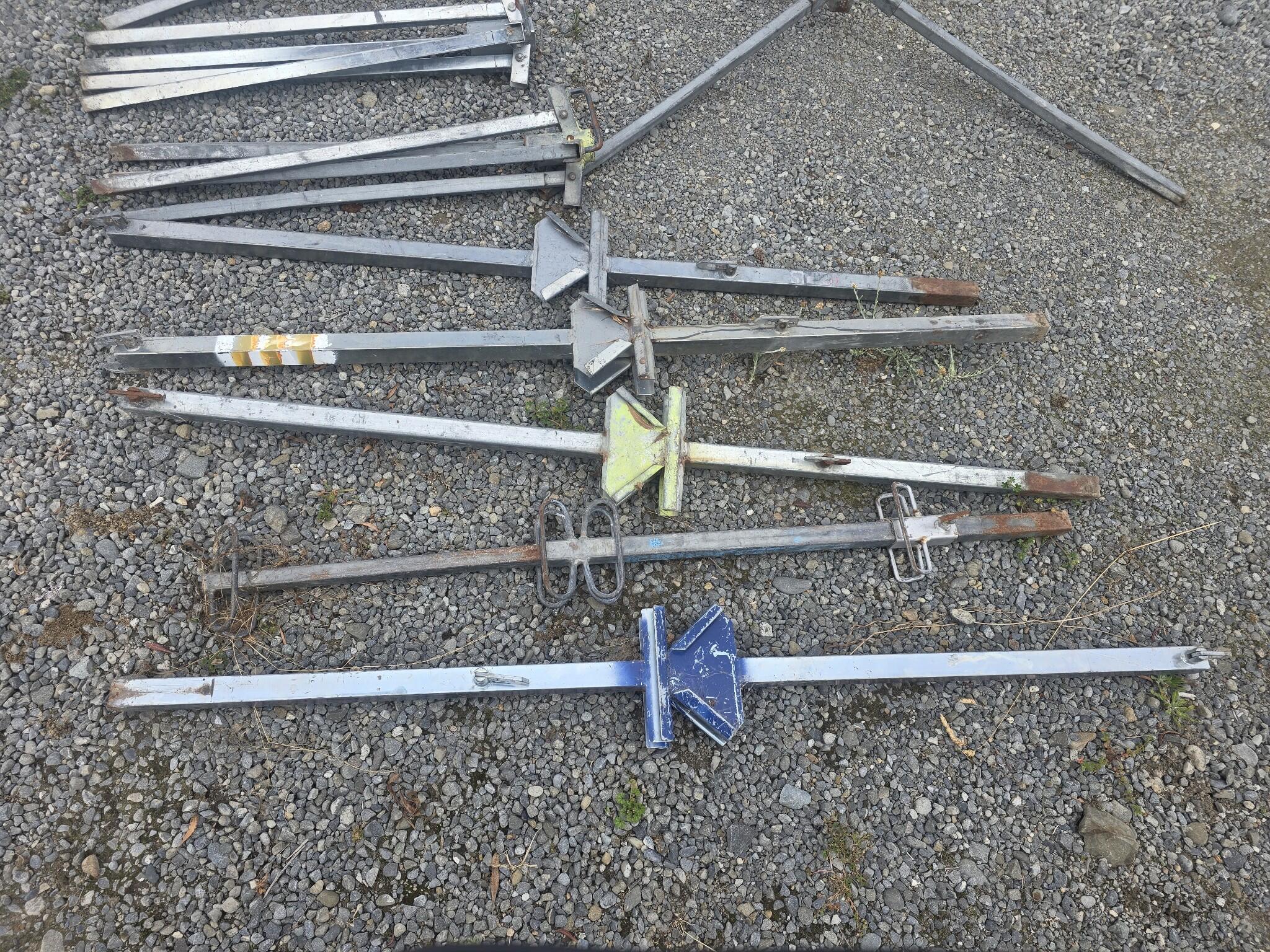 Lot of steel stands and steel uprights. Tripod stands are made from square hollow section steel. Each tripod stand has three folding legs. Tripod heads have welded sockets for vertical uprights. Road sign stands