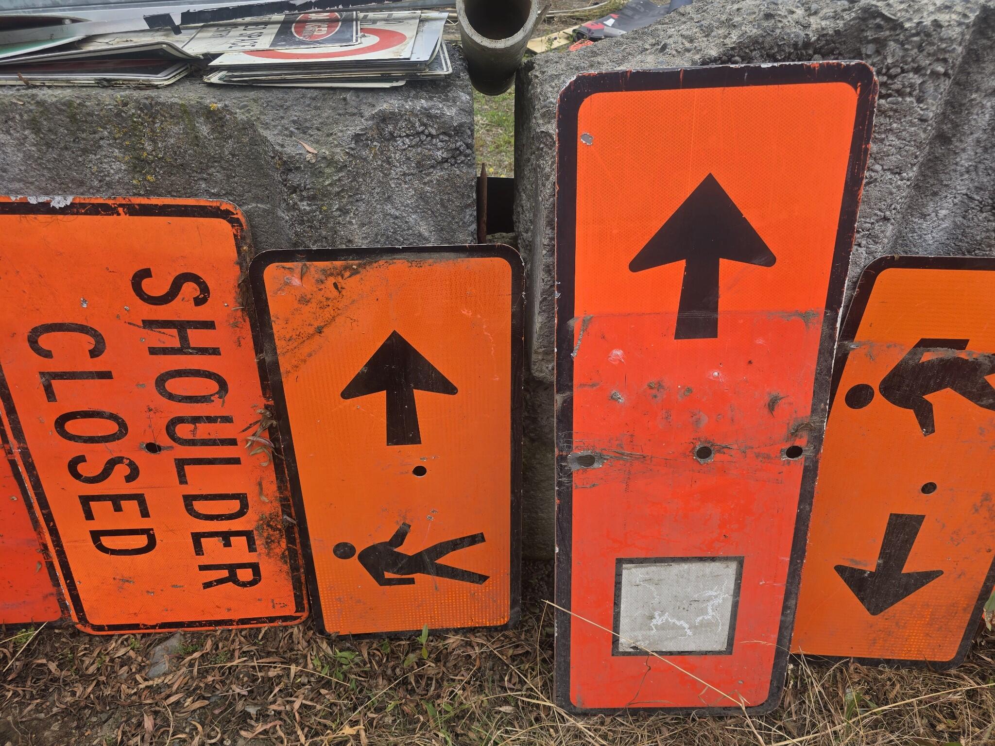 ON SIDE ROAD. SHOULDER CLOSED. 4 x signs show a black pedestrian symbol with arrow. Detour sign