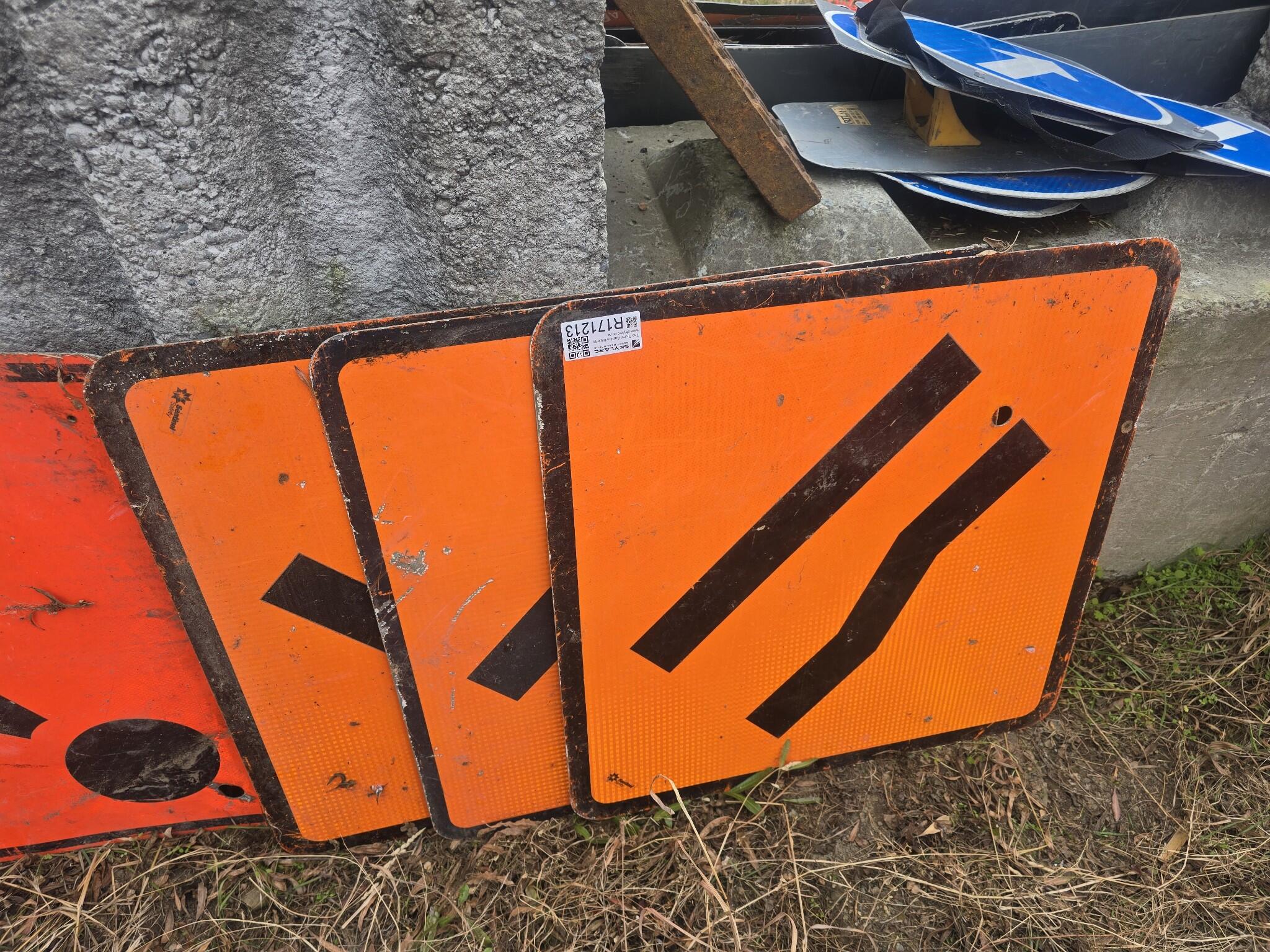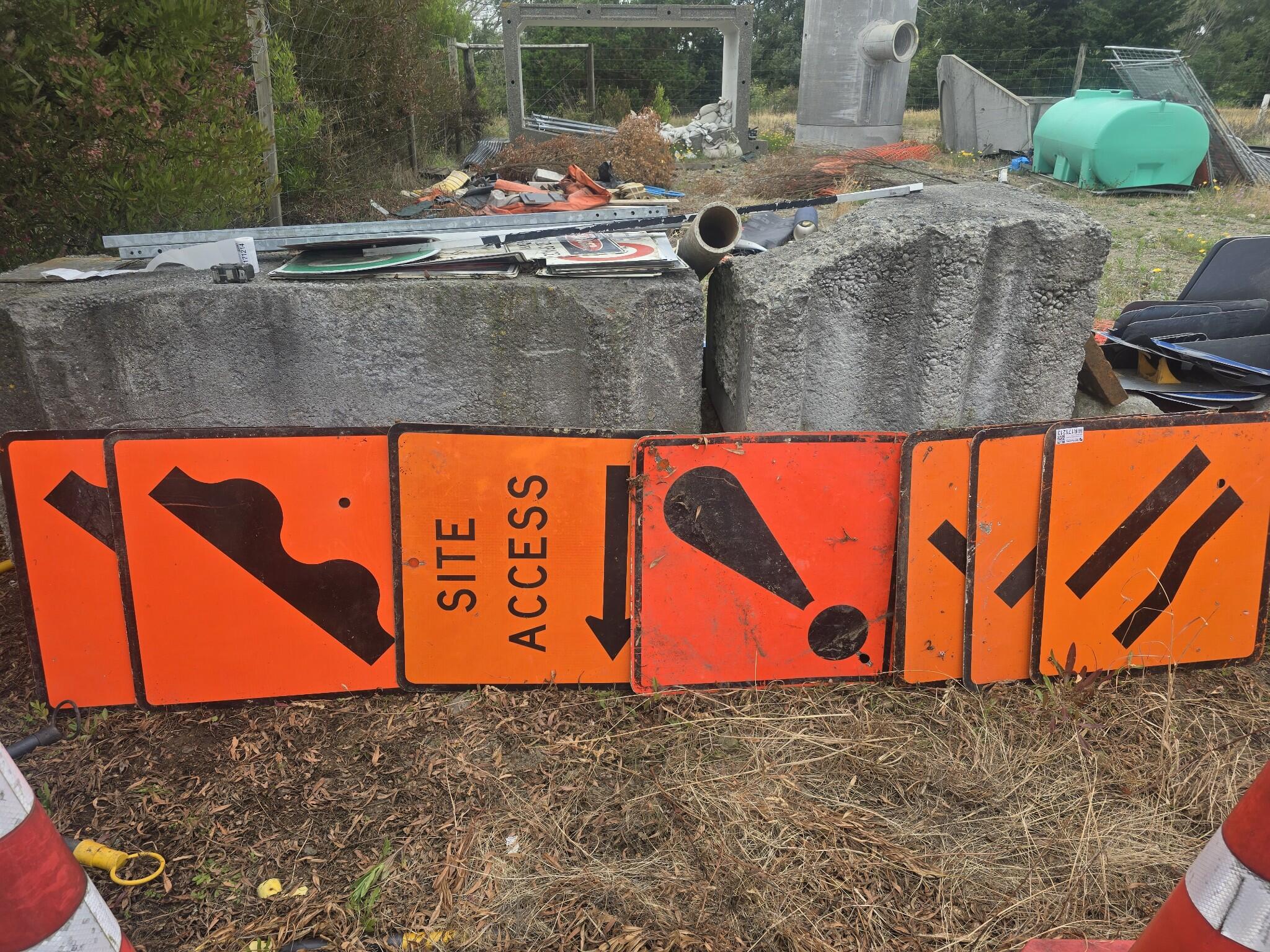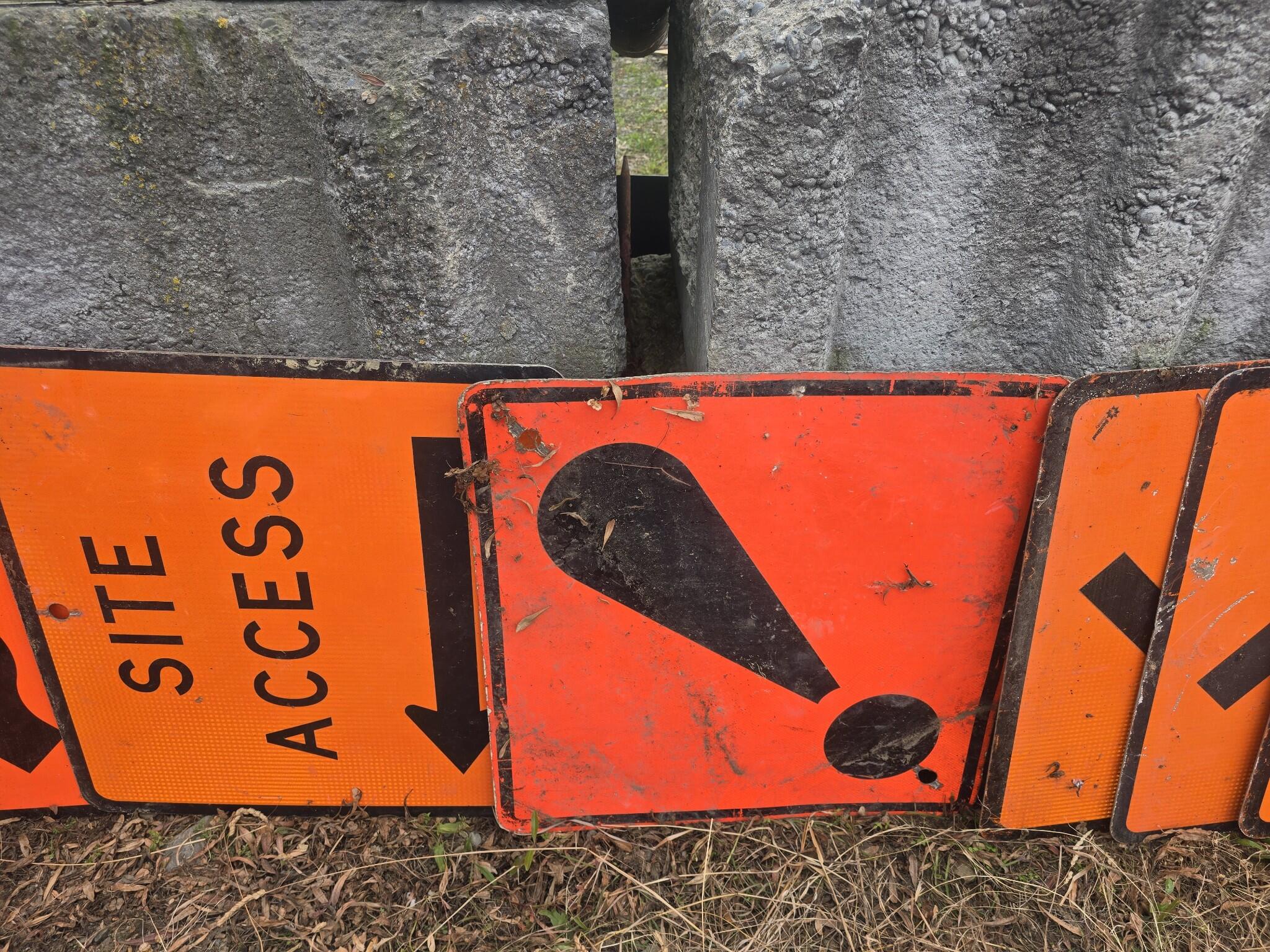 Set of orange road work signs. SITE ACCESS with black arrow. 3 x bumps signs Exclamation mark sign 3 x road narrows signs