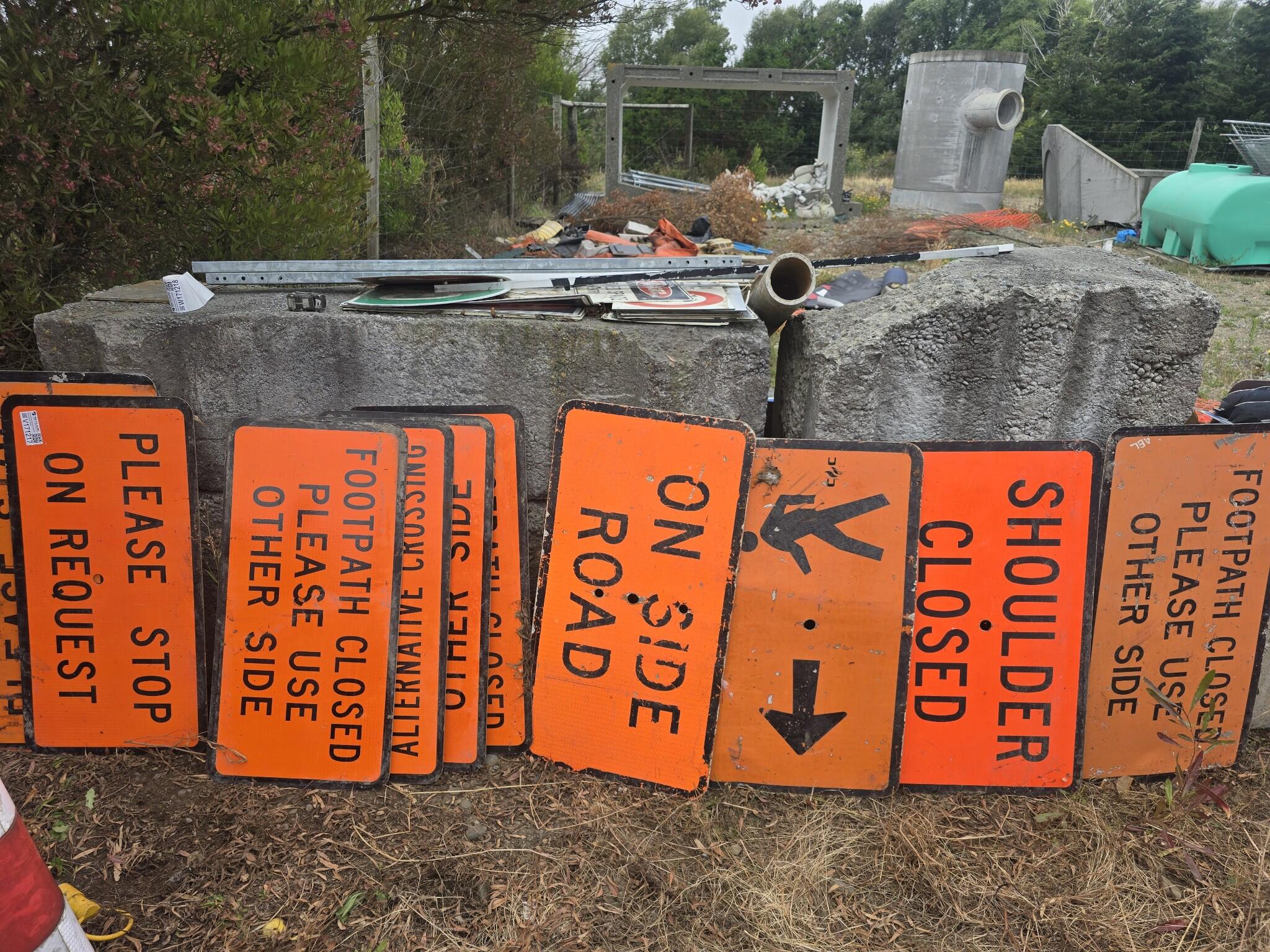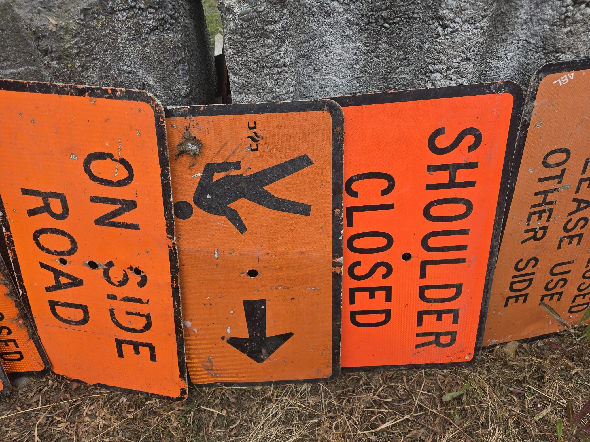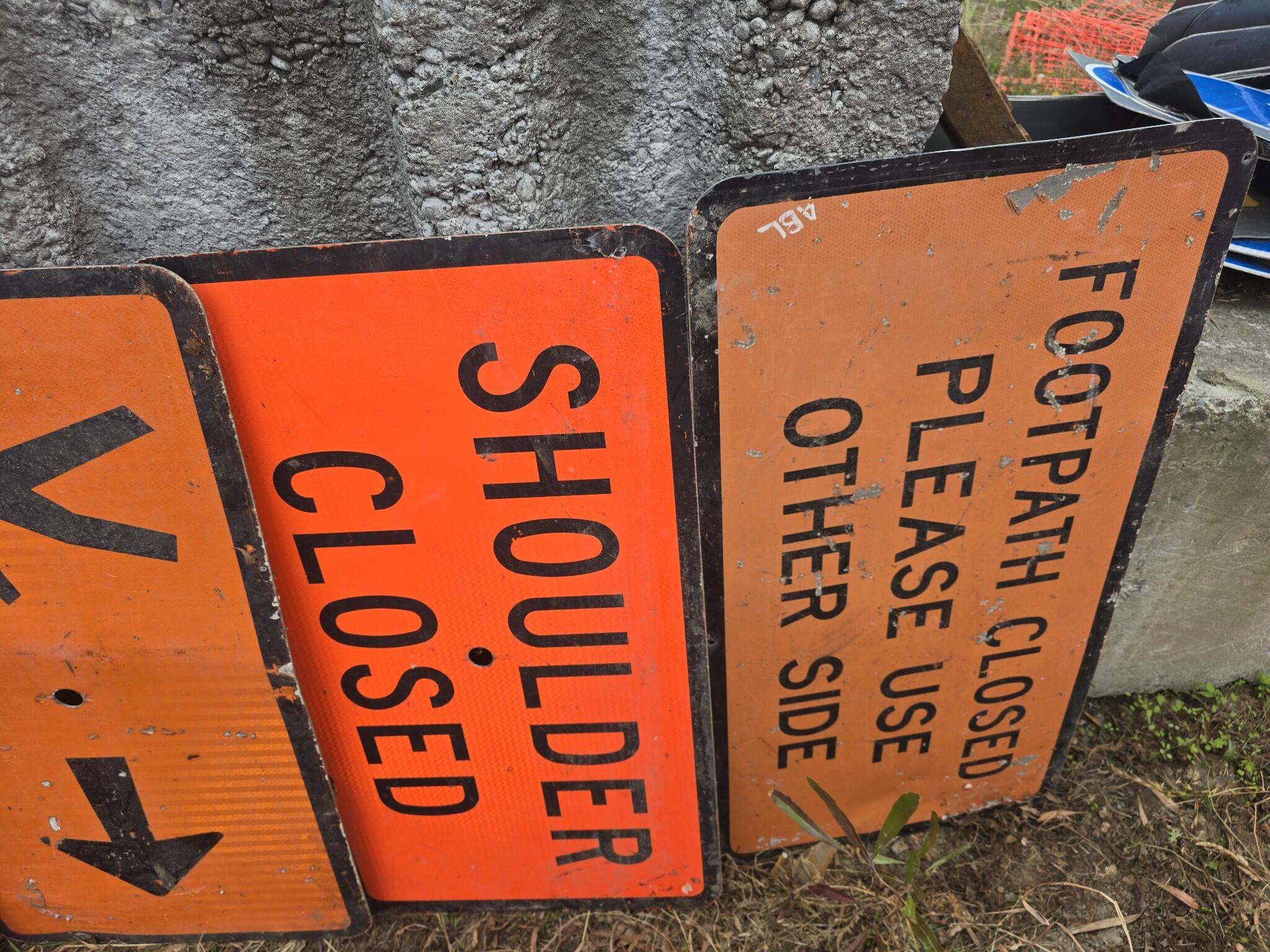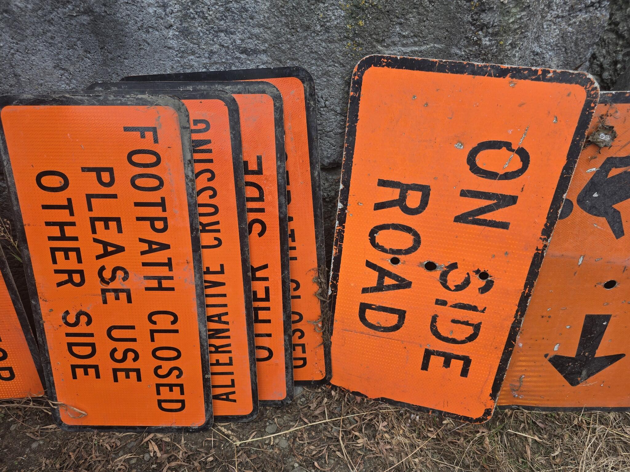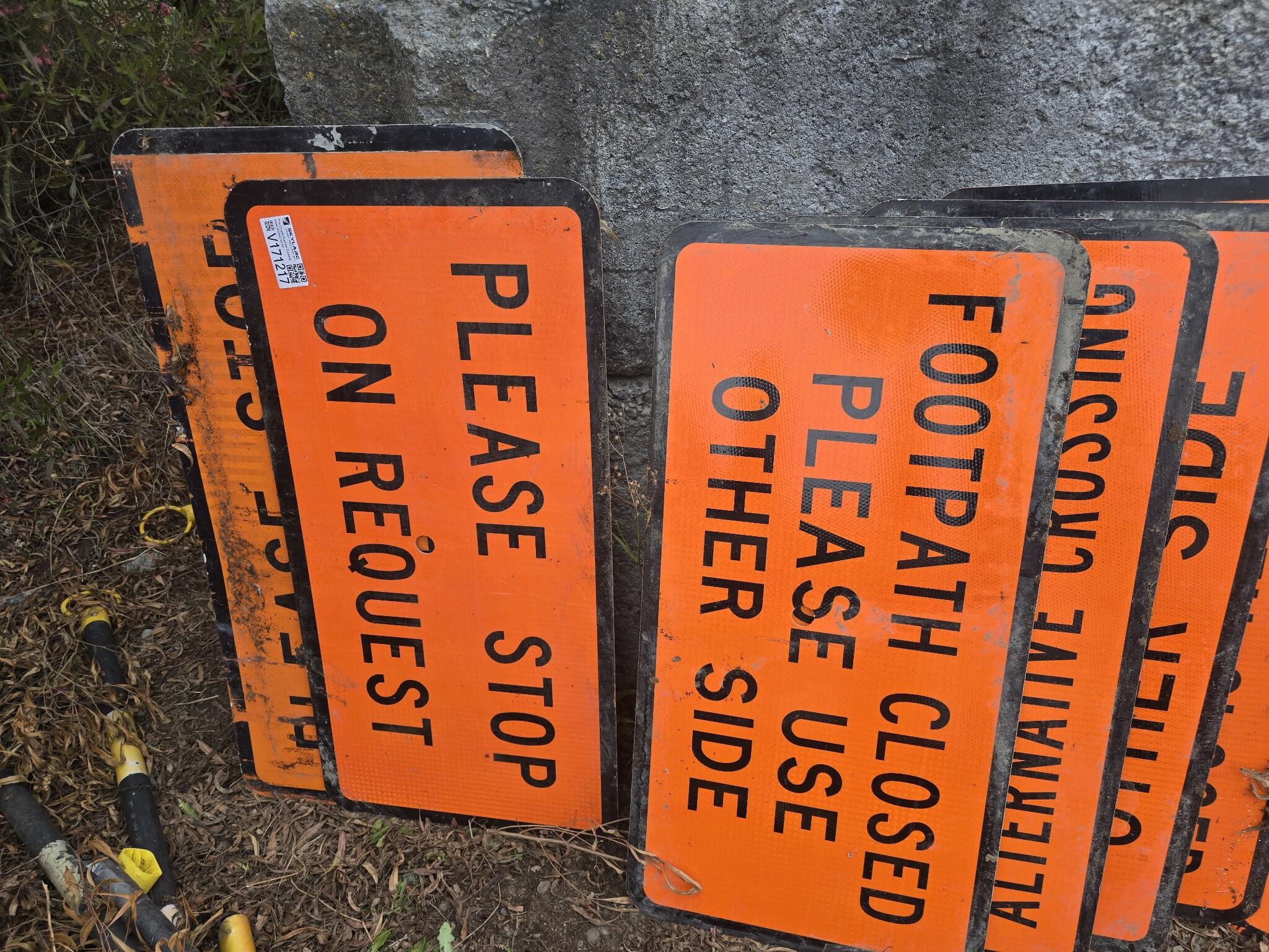 2 x Please stop on request 5 x Footpath closed On roadside Man with arrow Shoulder closed