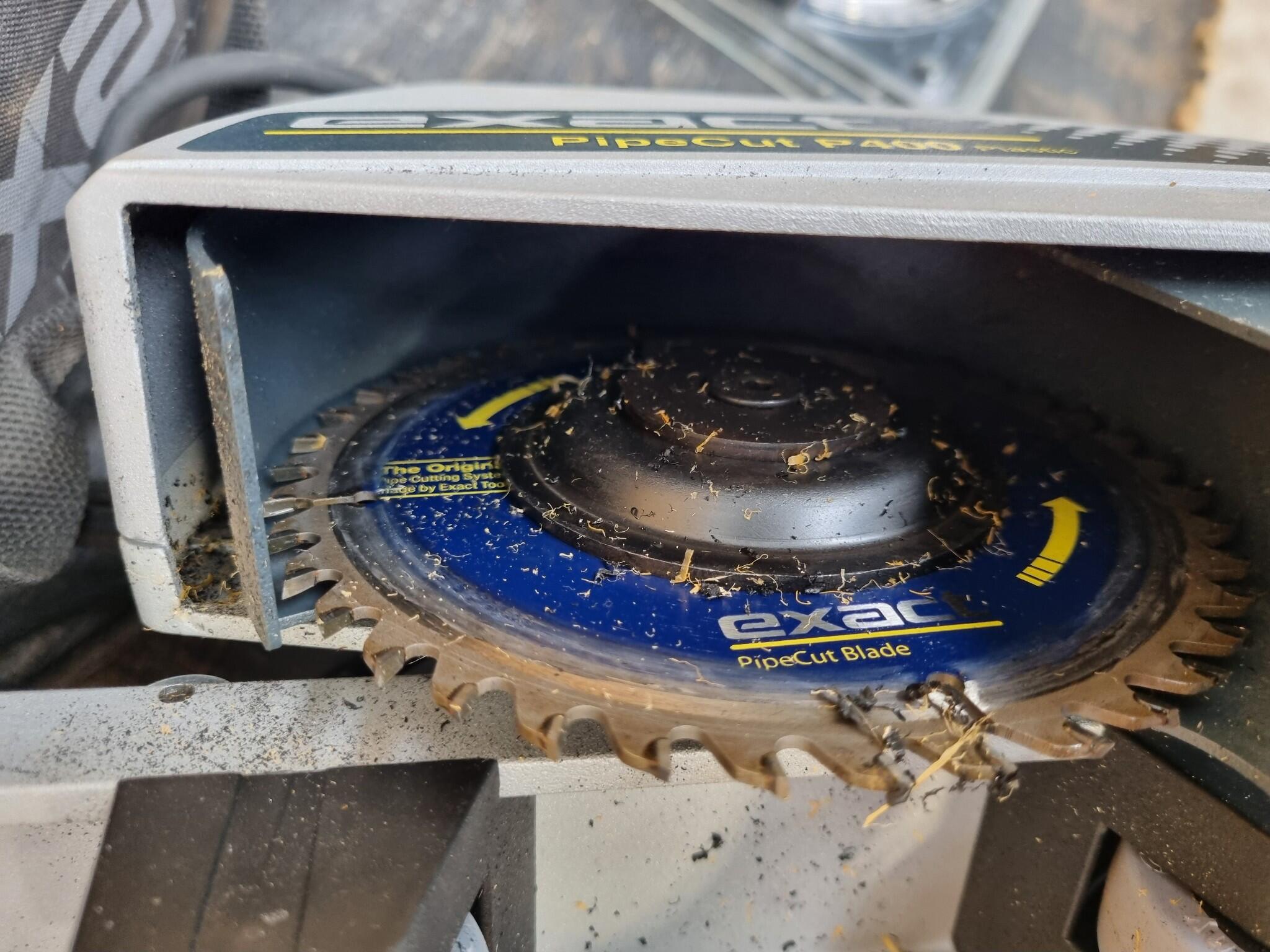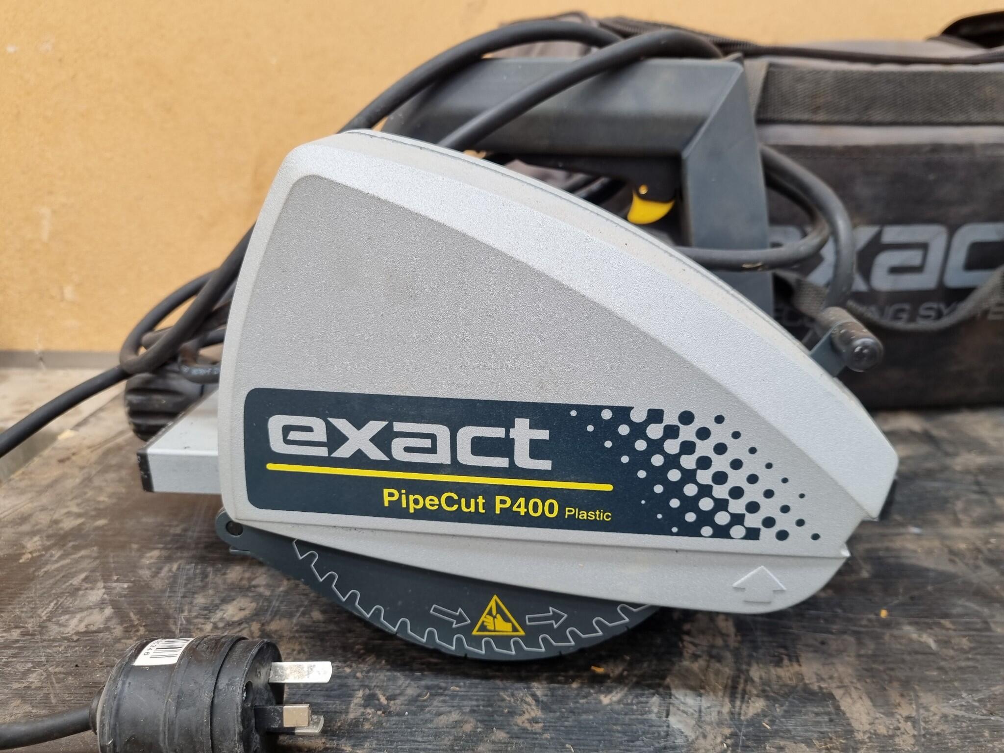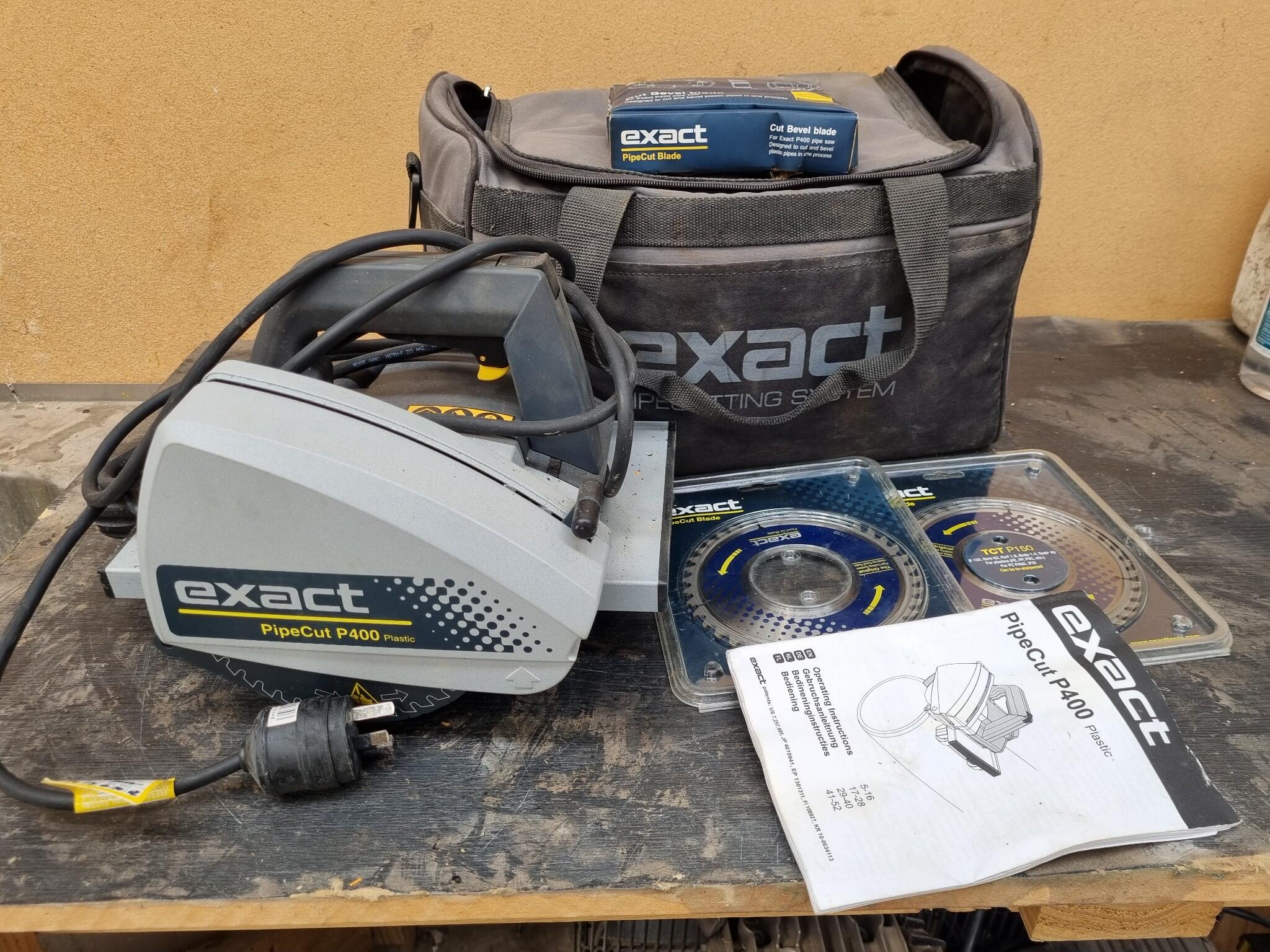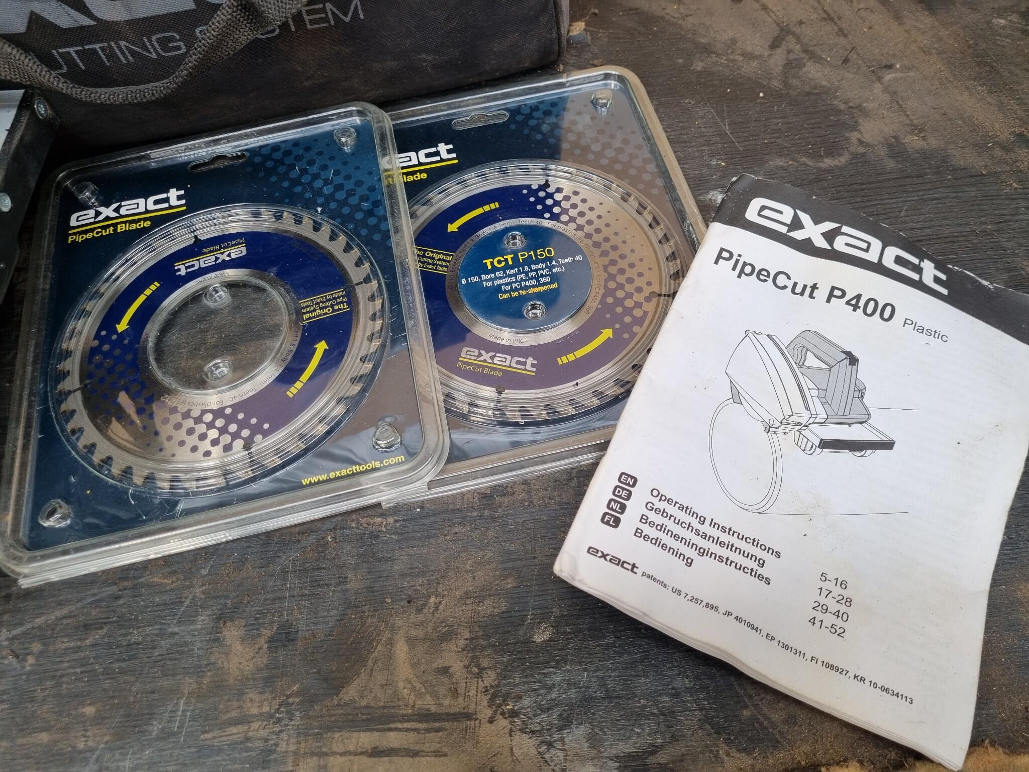 Exact PipeCut P400 Plastic Pipe Cutting & Beveling Saw. Made in the EU. Includes saw, assorted unused blades, canvas carry bag. Shows generally mild usage. https://exacttools.com/product/exact-pipecut-p400-system/