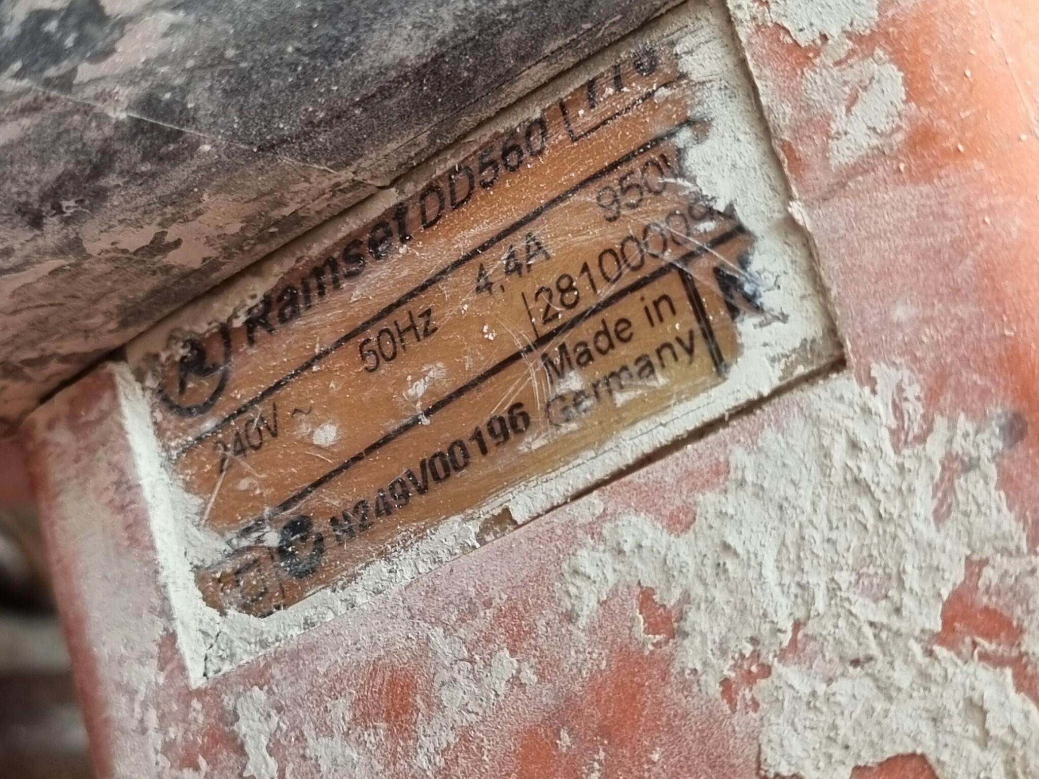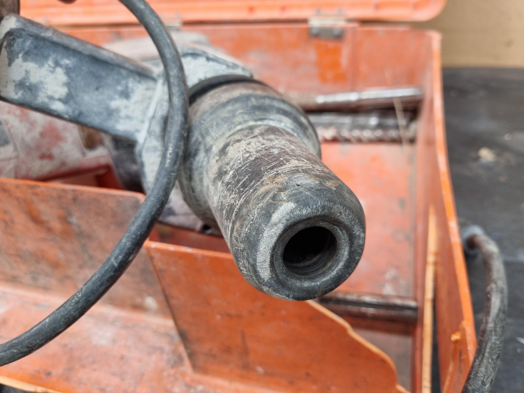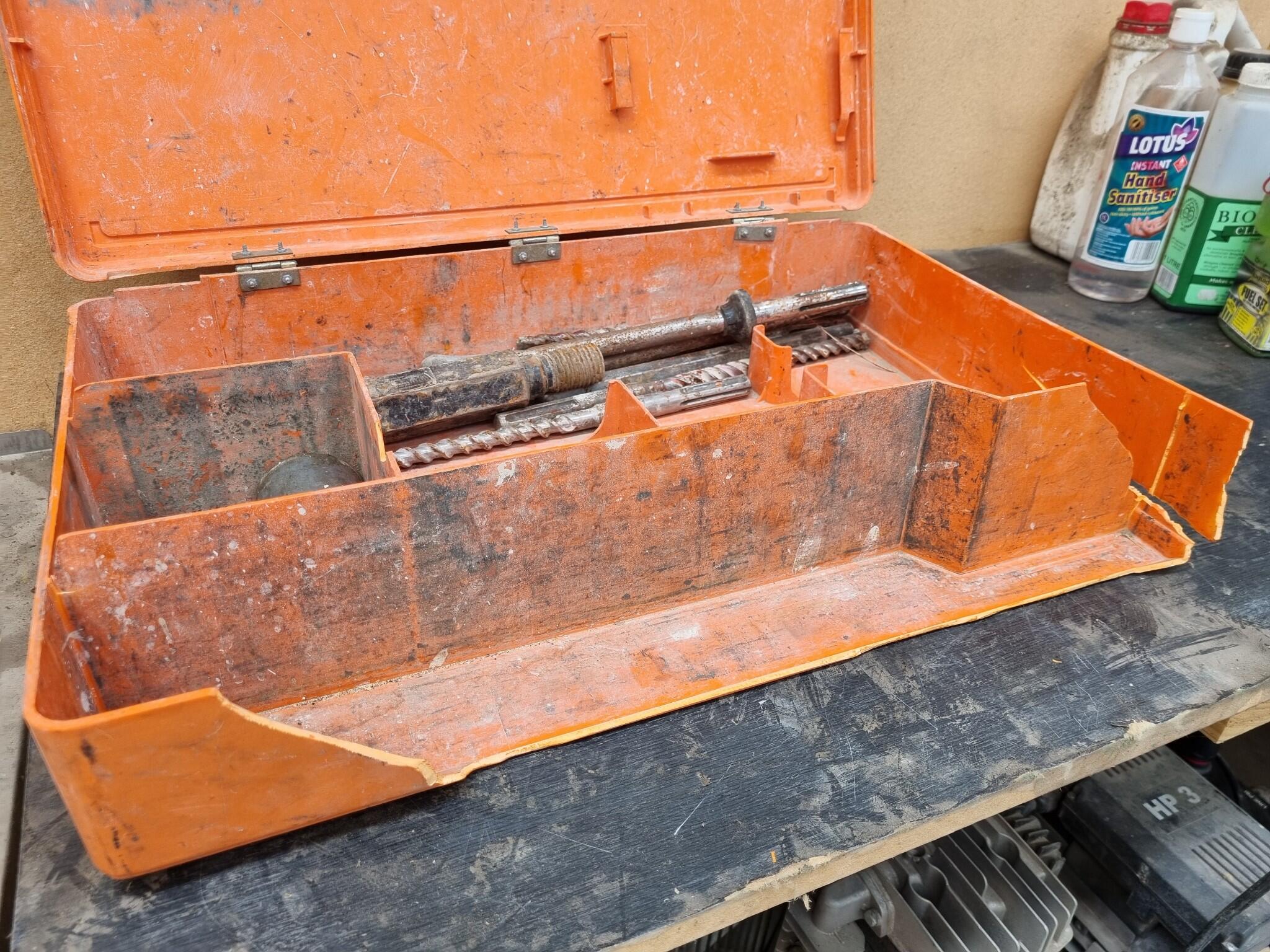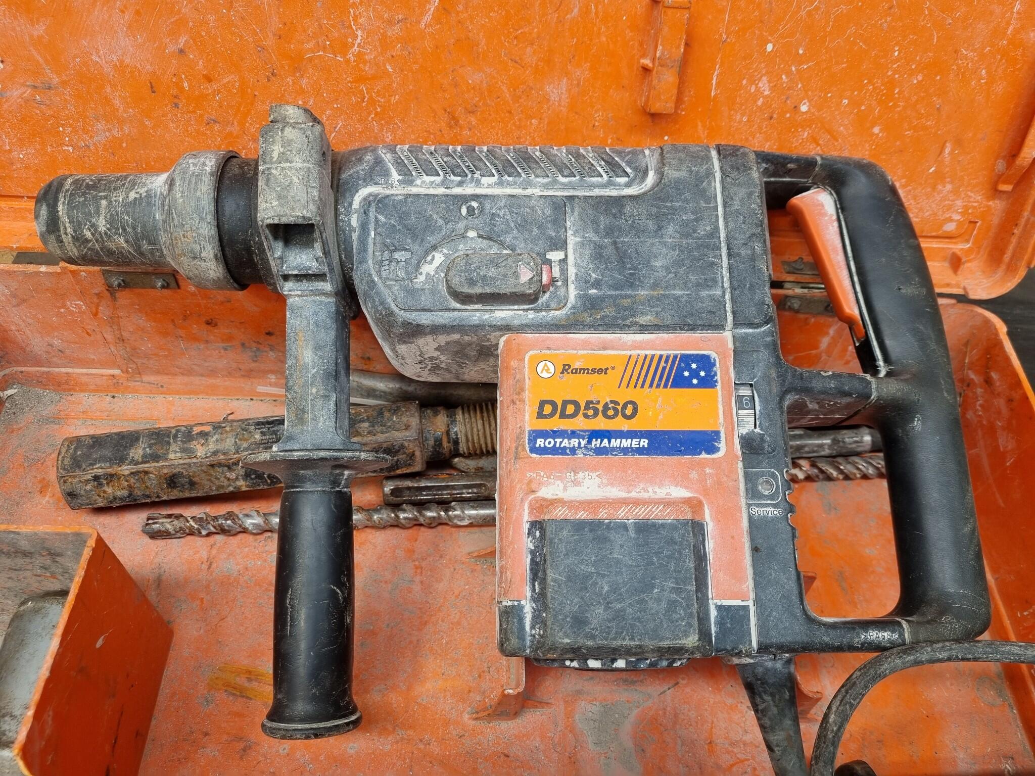 Ramset Corded Rotary Drill model DD560. Includes assorted bits, see photos. Includes a heavily damaged plastic case. Drill operates but not tested at length or under load. Drill shows heavy usage.