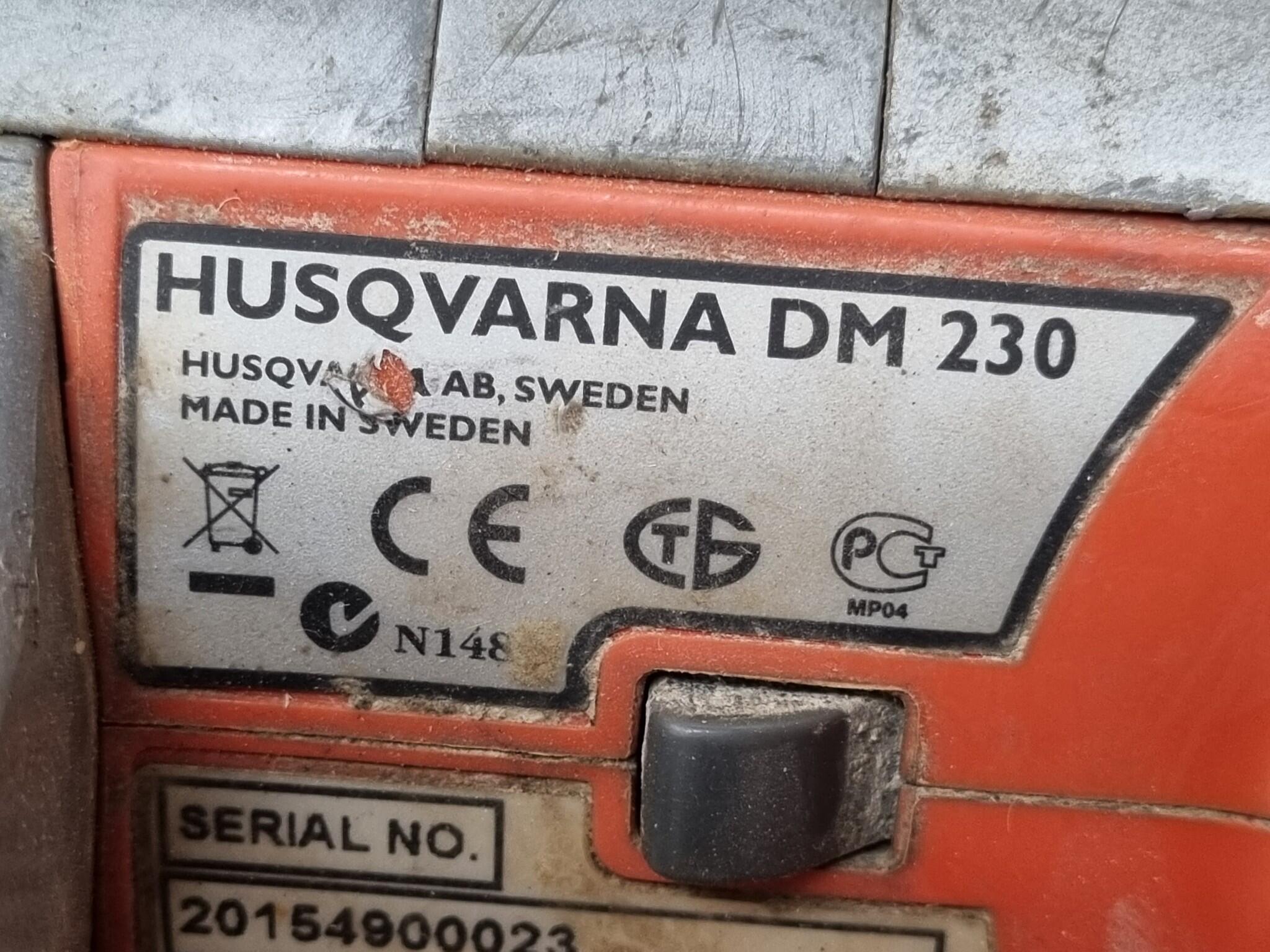 Husqvarna DM230 Wet/Dry Core Drill. Includes damaged case and operation manual. Powers on but has not been tested at length or under load. Shows heavy usage. Case has broken hinges.