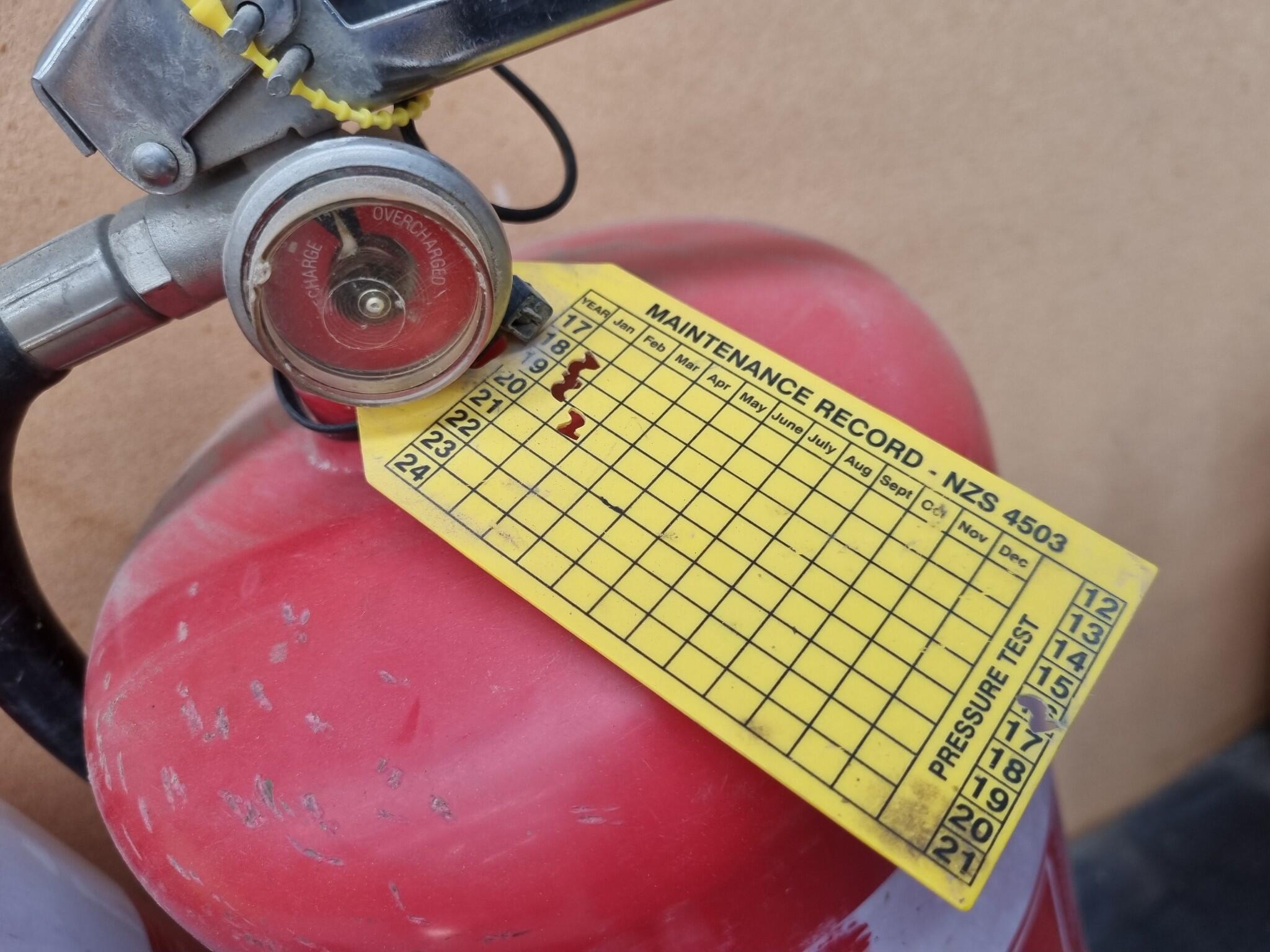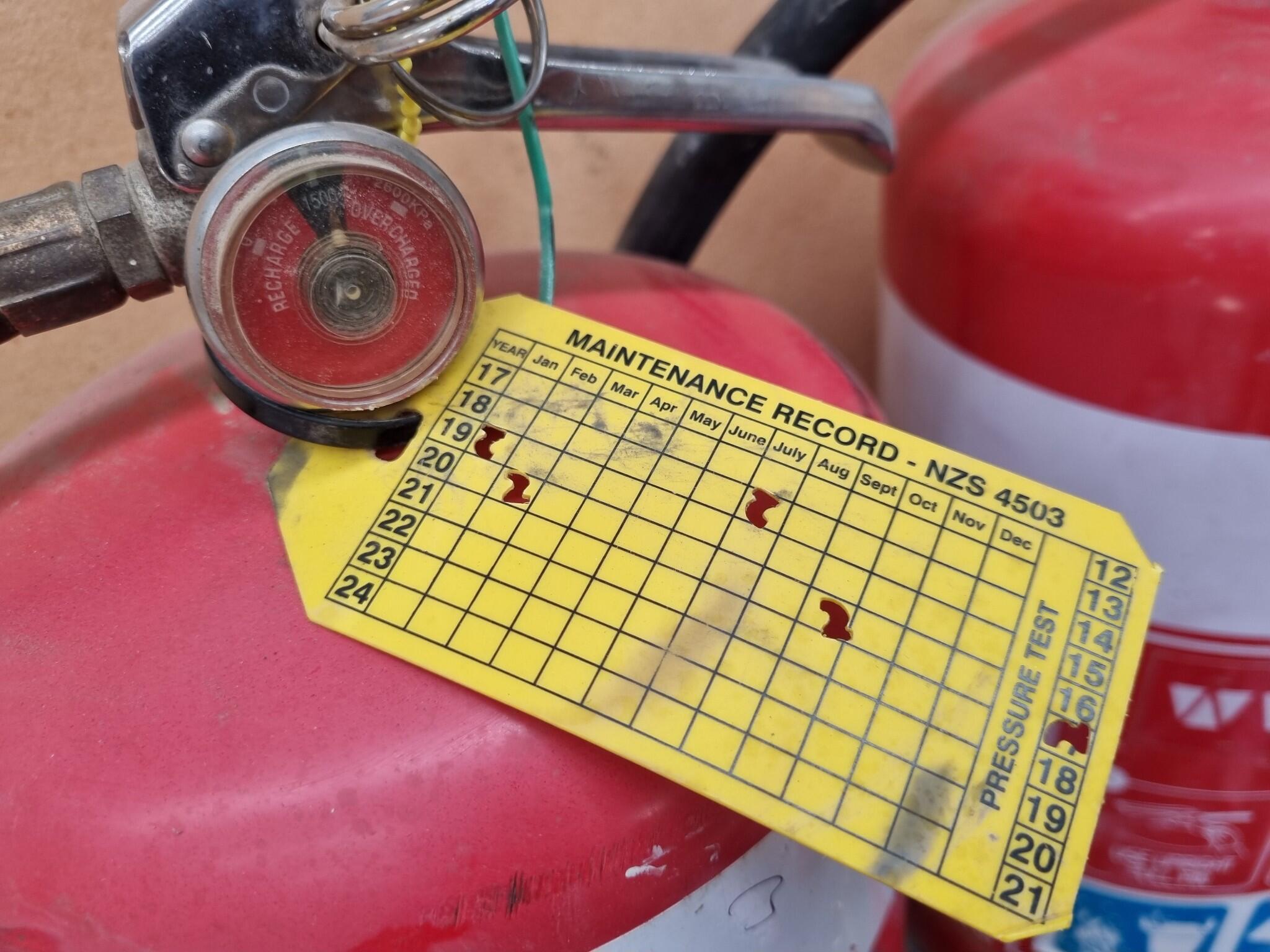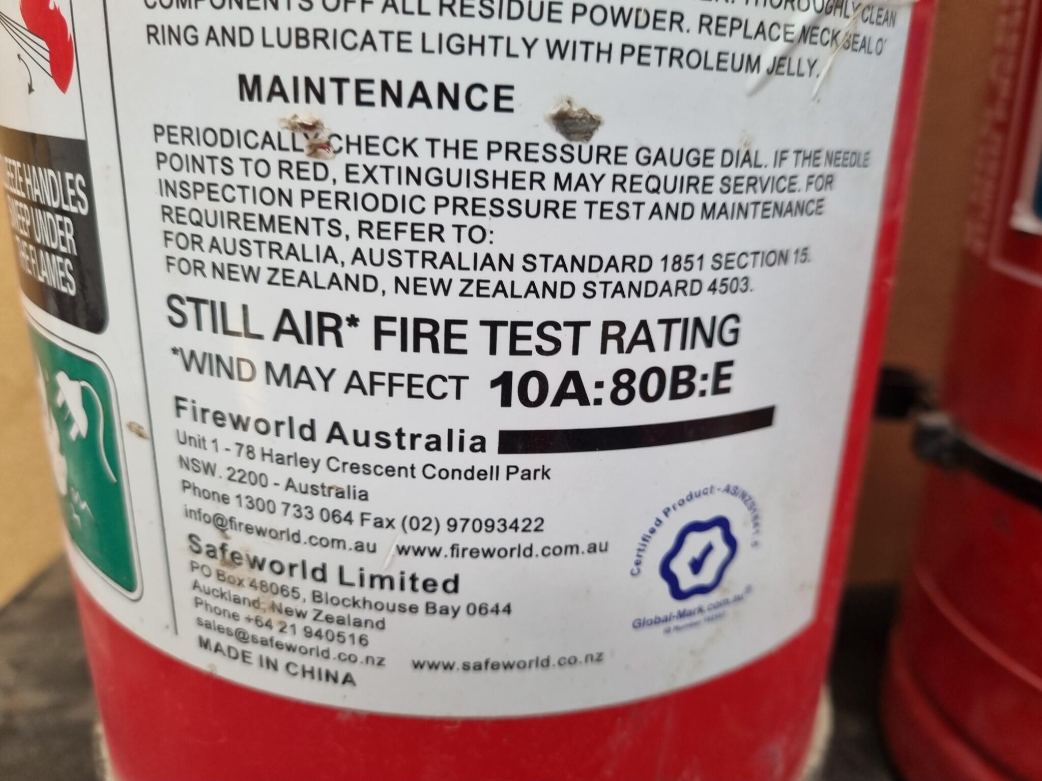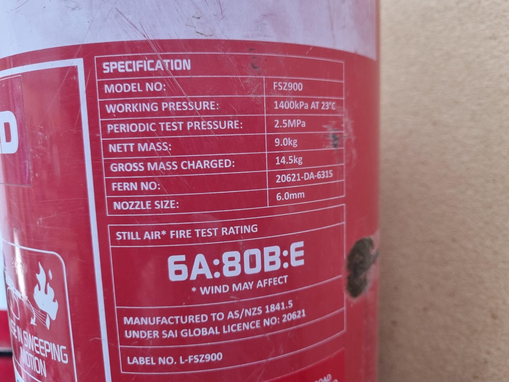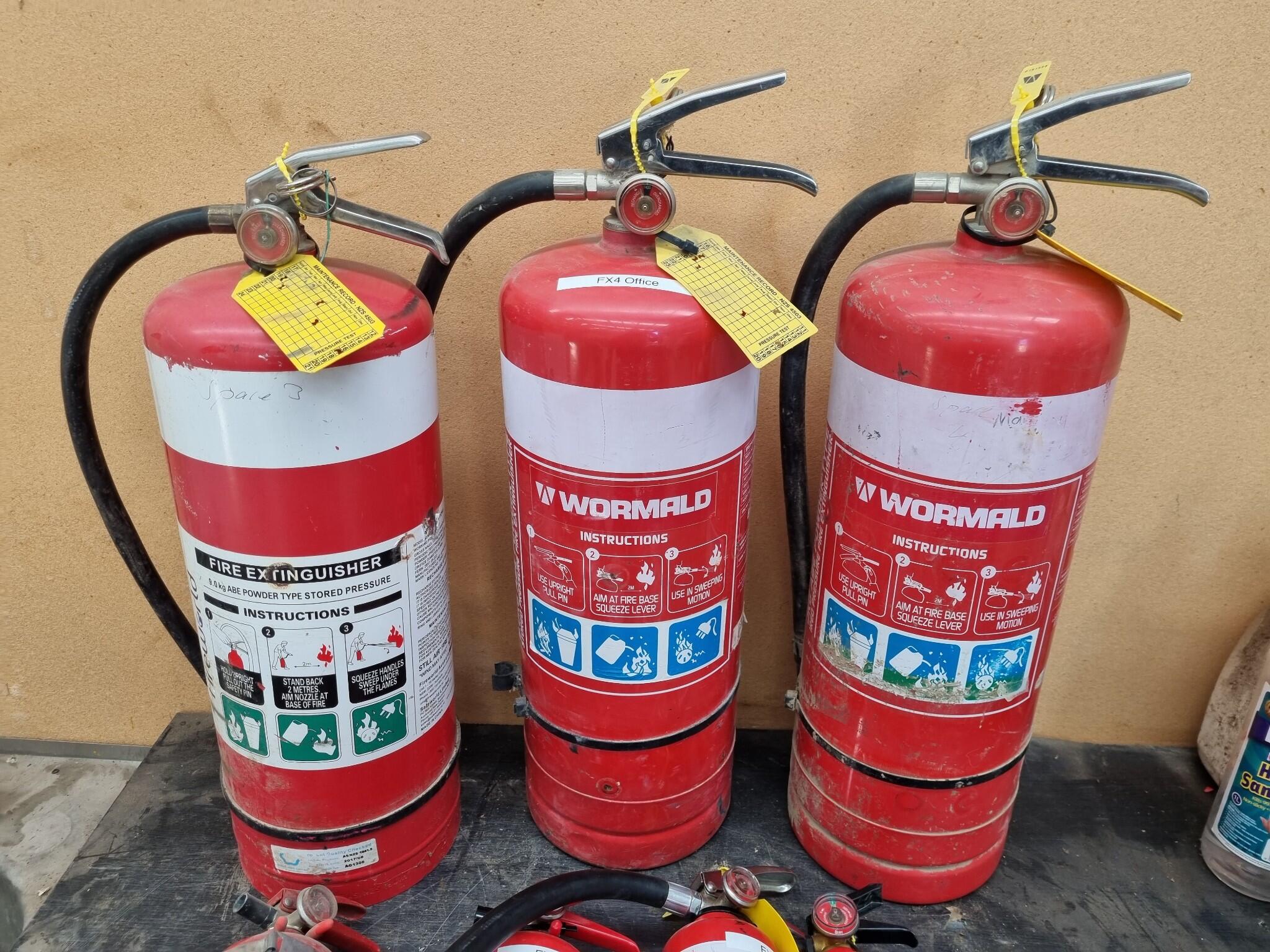 - 3x 9kg ABE powder type Extinguishers, one Fireworld branded 10A:80B:E, and two Wormald branded 6A:80B:E.