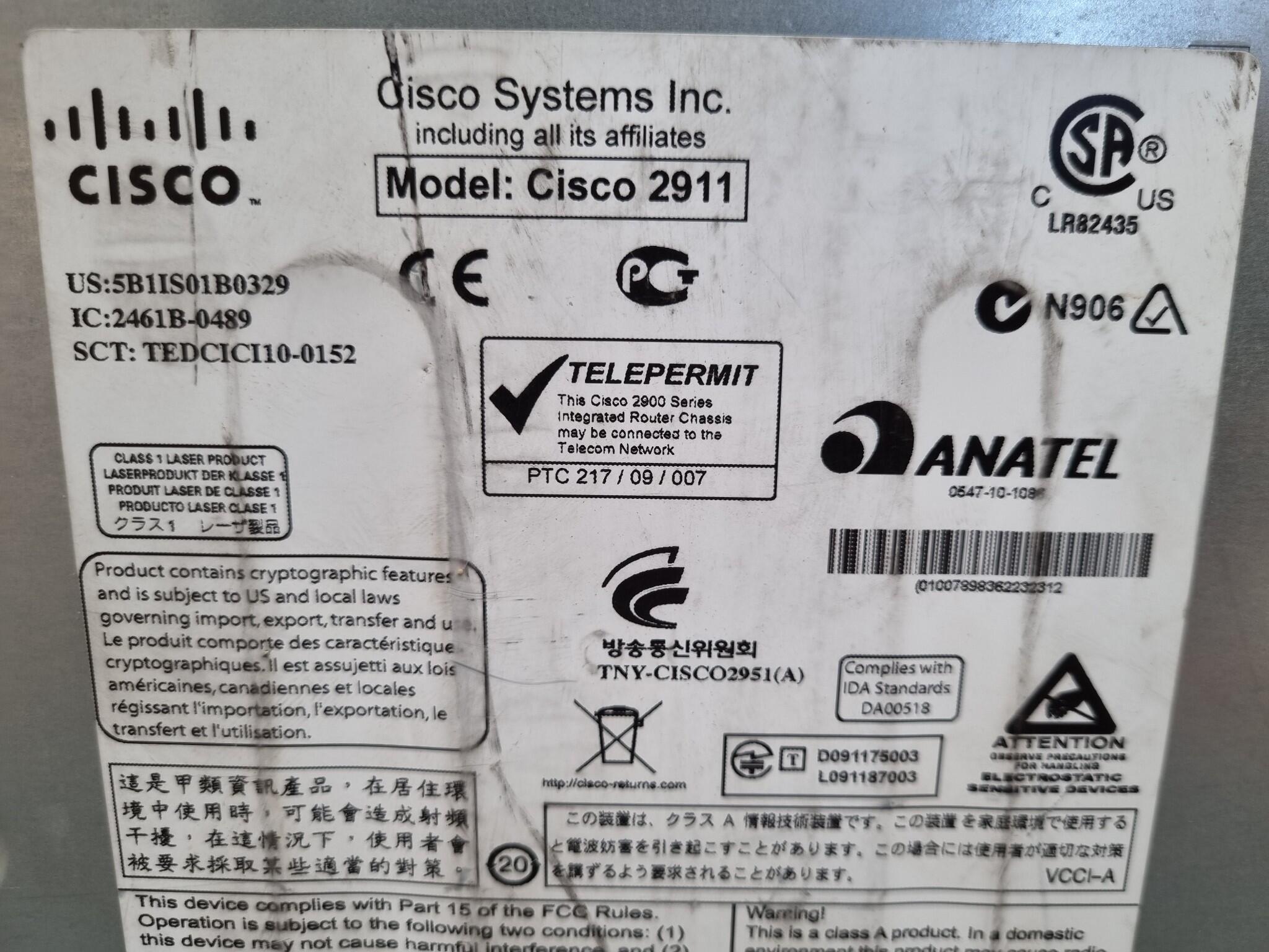 Cisco 2900 Series Integrated Service Router . Model No. 2911. Manufactured 03/2011. Includes power cord.