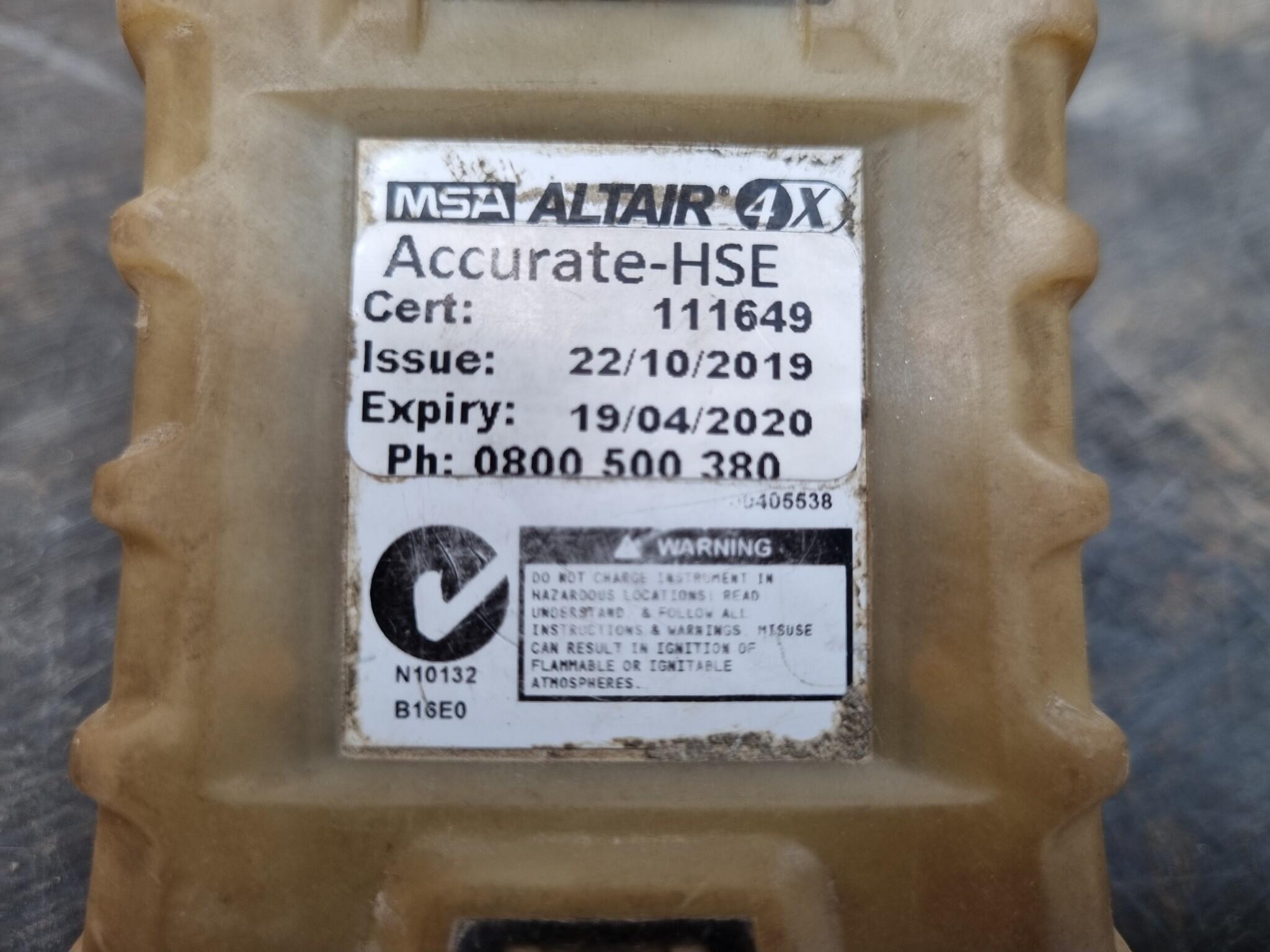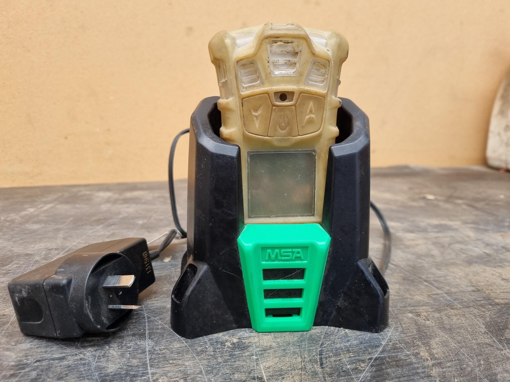 MSA AltAir 4X Multi Gas Detector w/ Charging Stand. Teat certification tag expired 04/2020. Charges and power on, sensor functions not tested. Battery condition unknown.