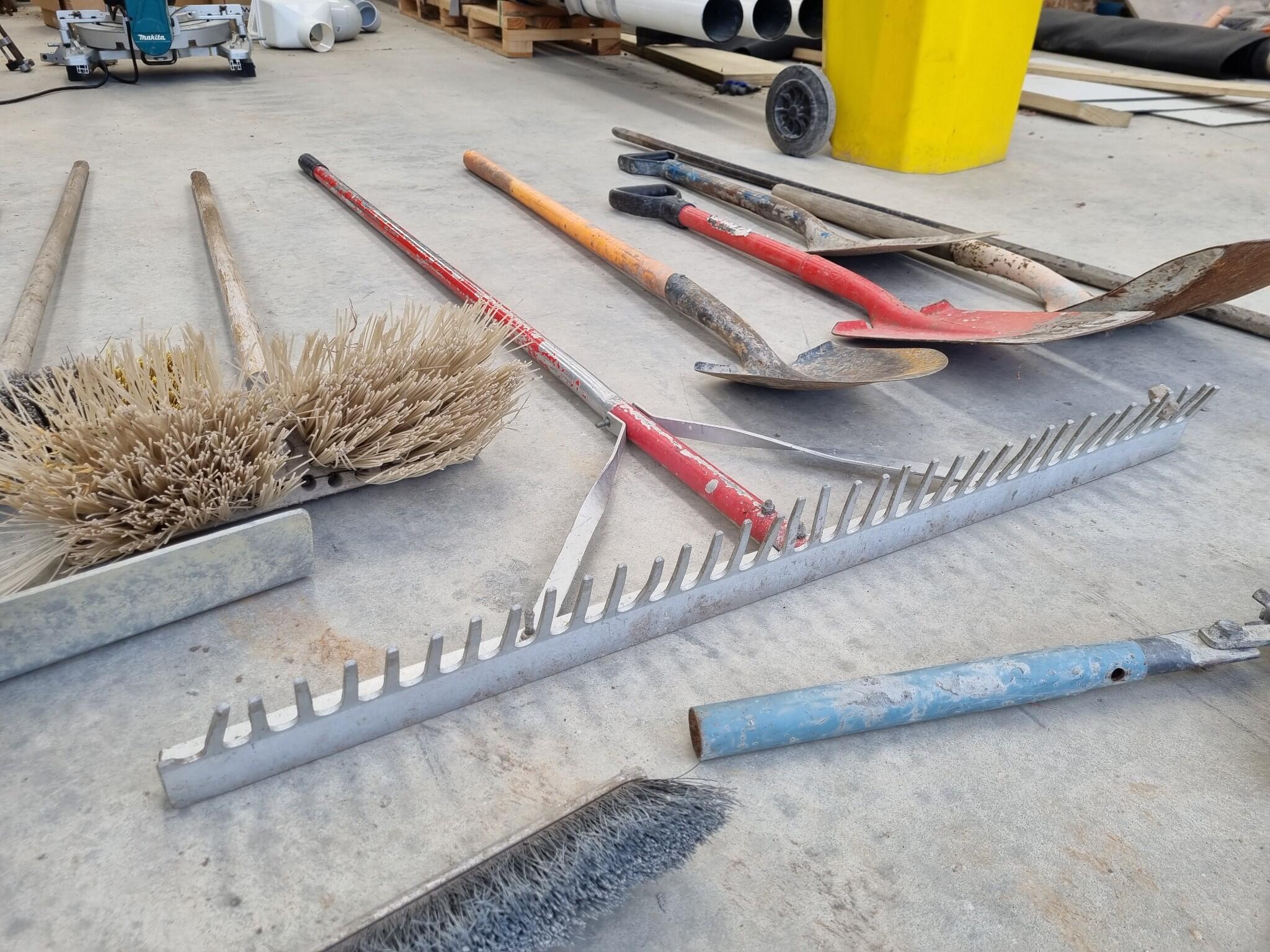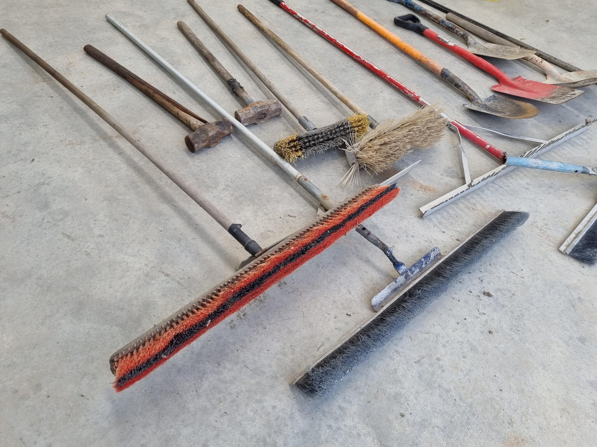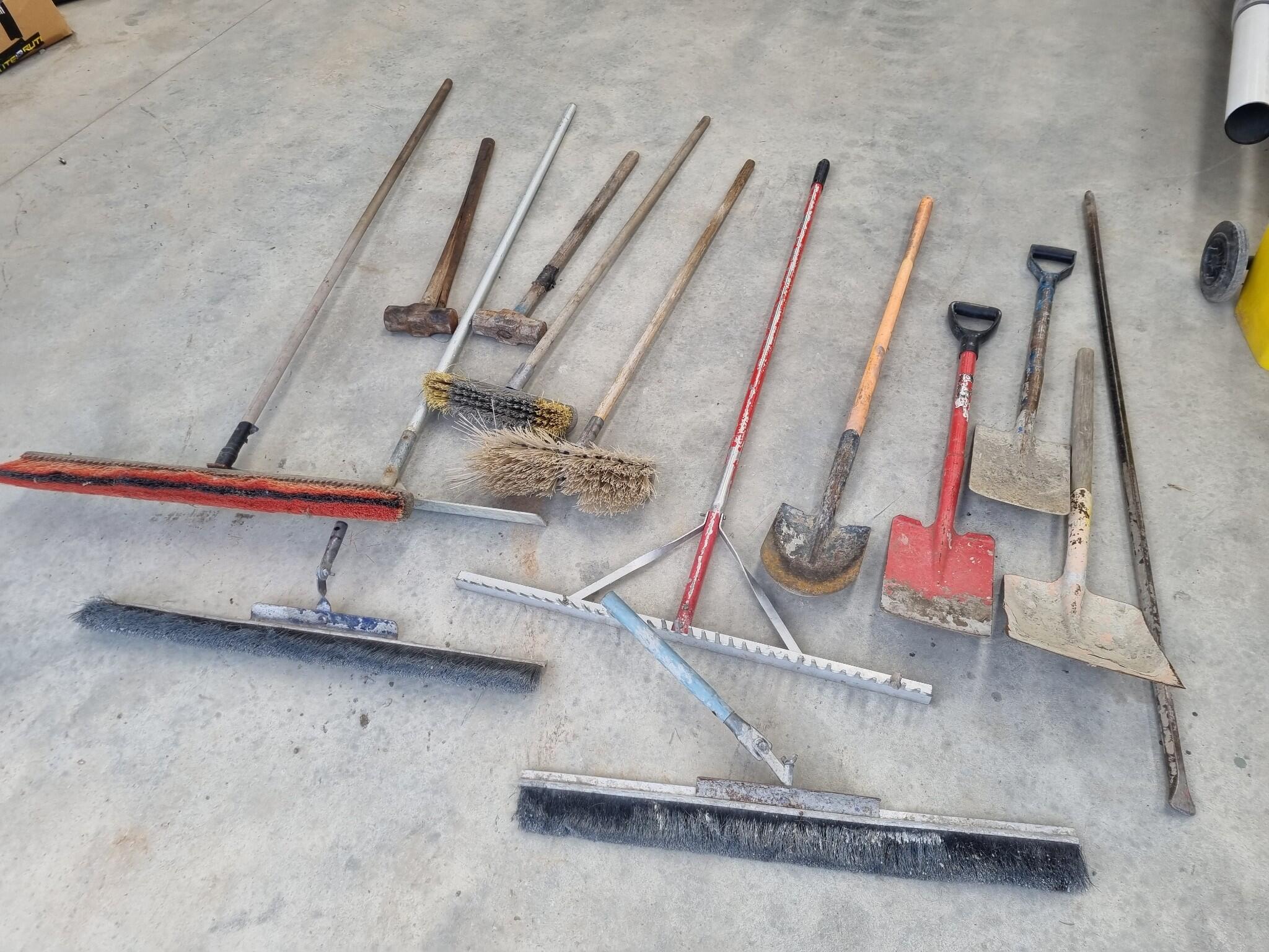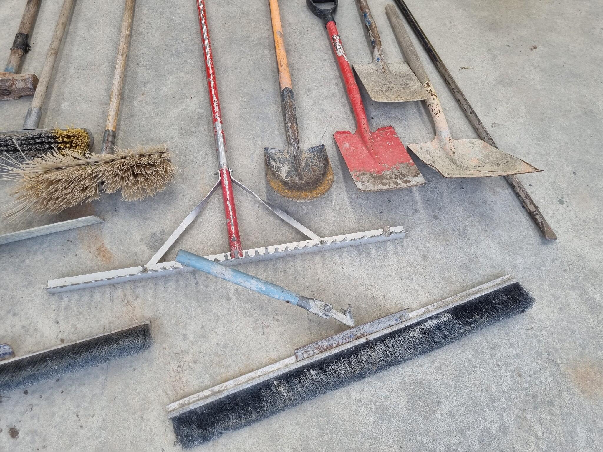 Assorted Paving Rakes, Brushes, Brooms, Shovels, long crowbar, Sledge Hammers. Condition varies with each item.