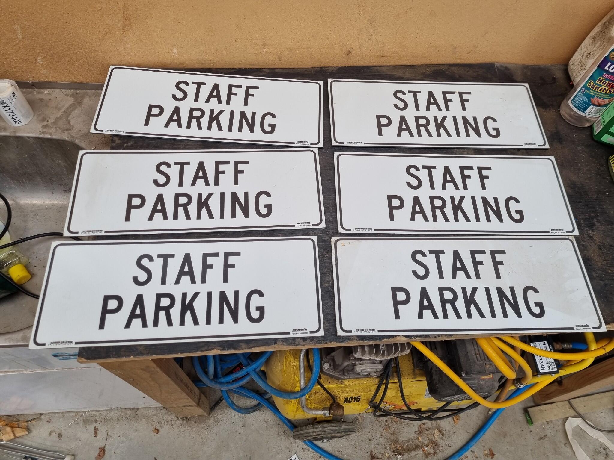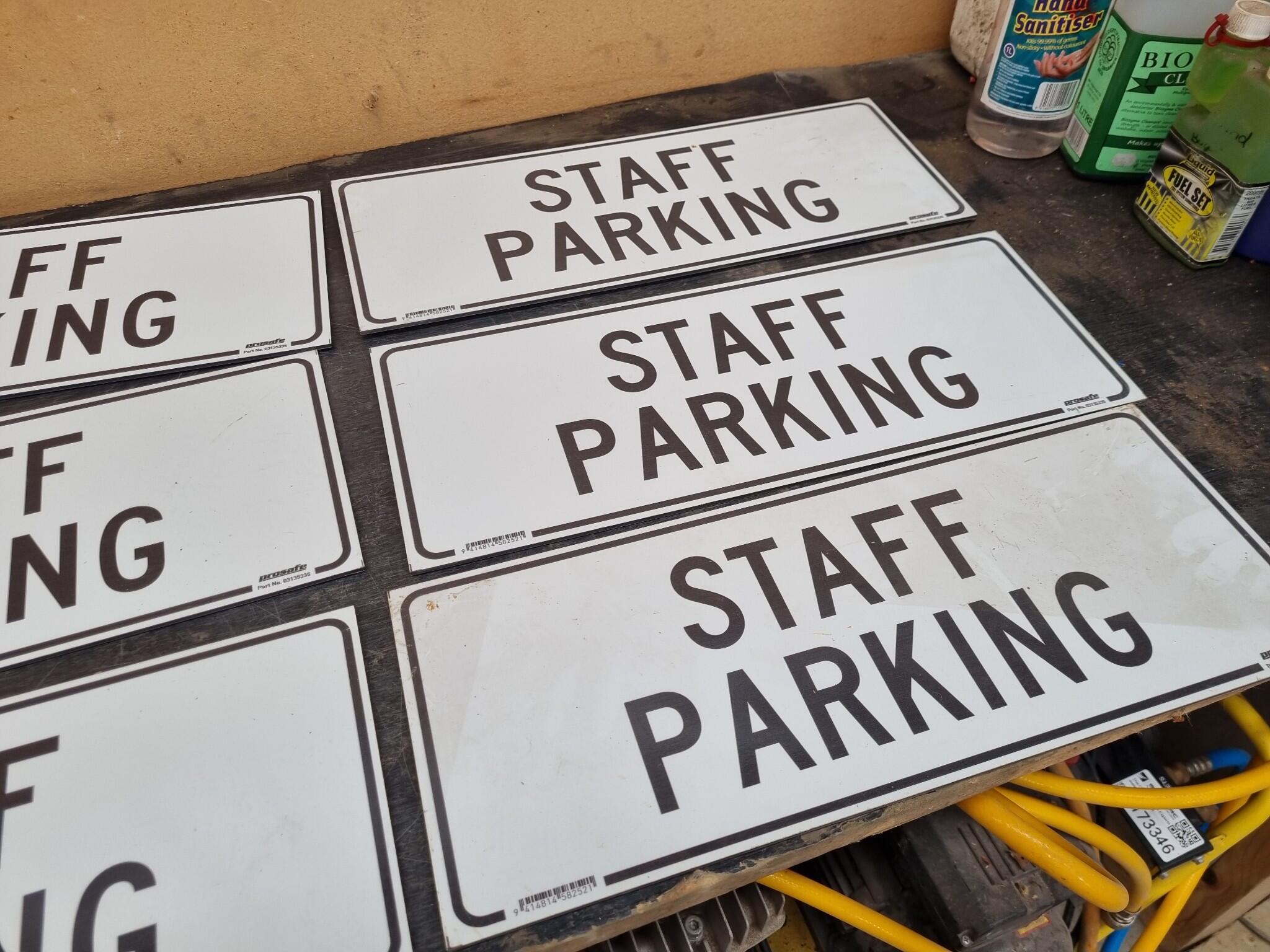 6x Staff Parking Signs. Prosafe branded. Part No.03135335. Made from aluminium composite sheets. Each is 450x180mm snd 3mm thick. As new unused, some dust from storage.