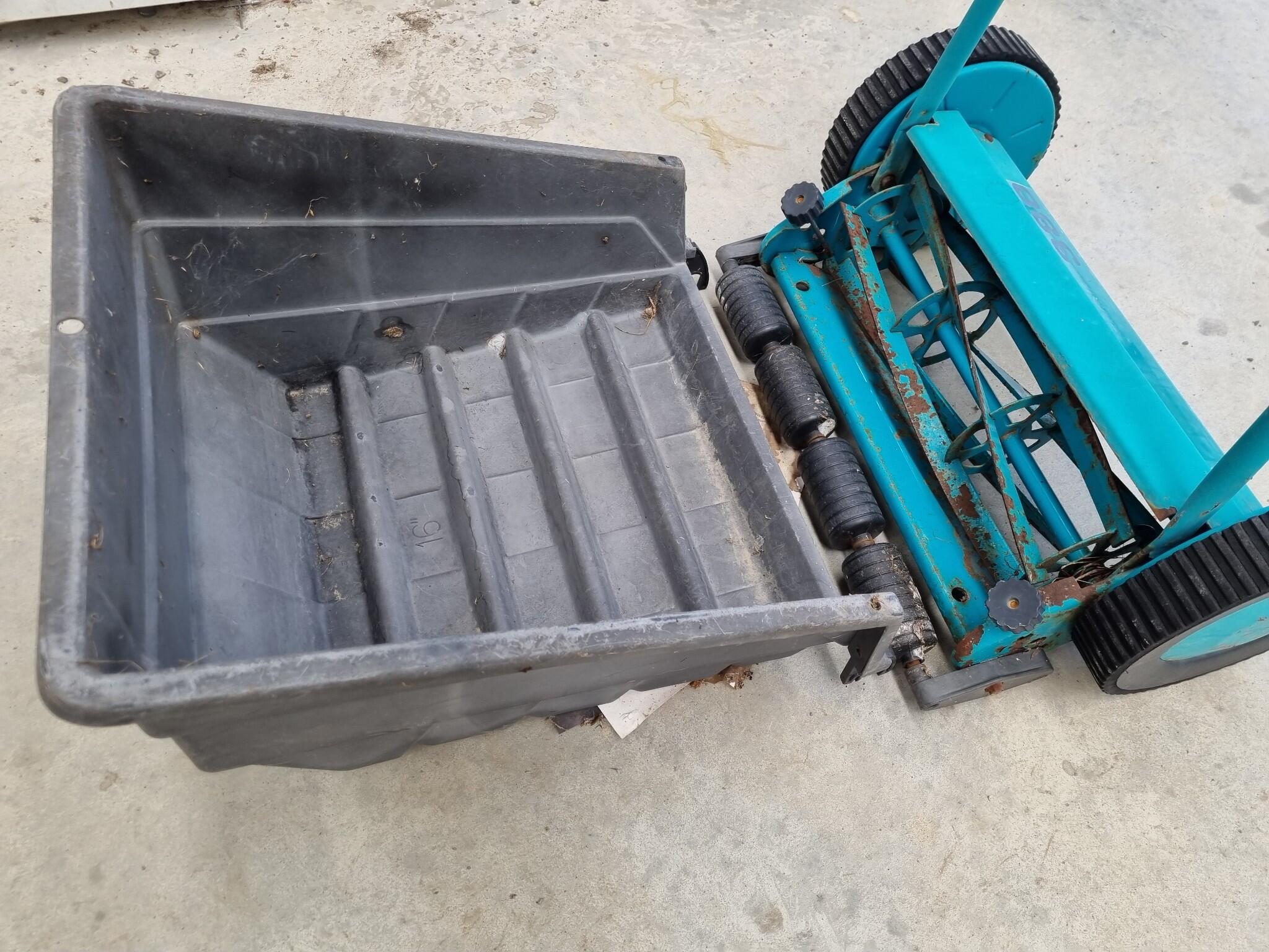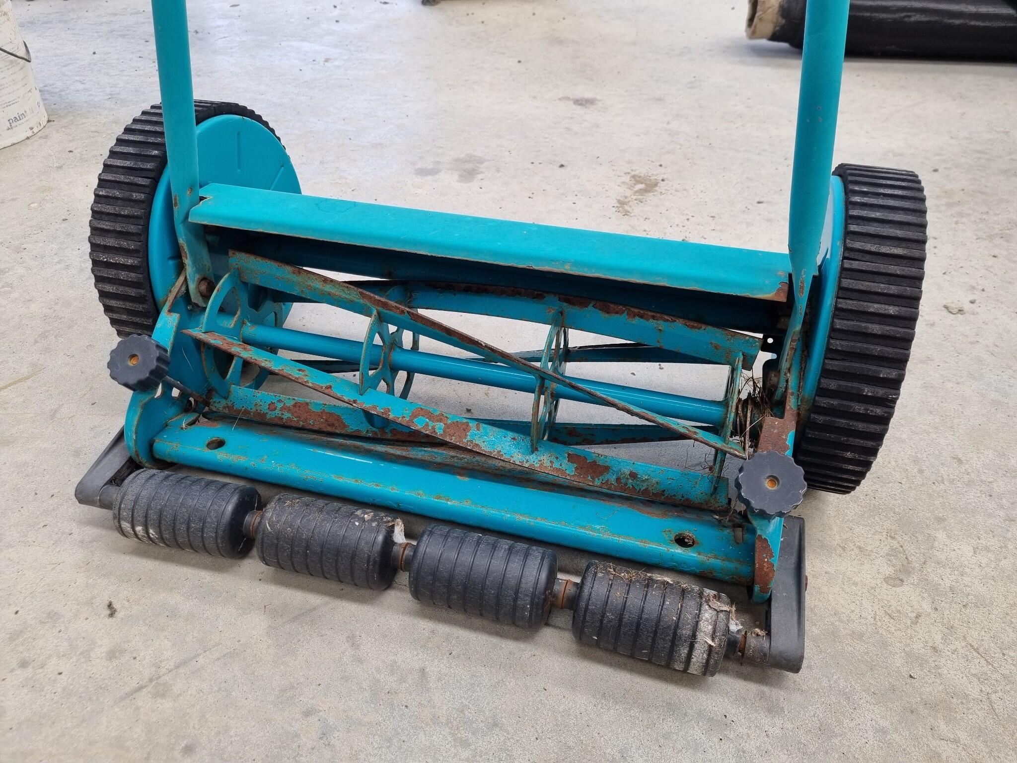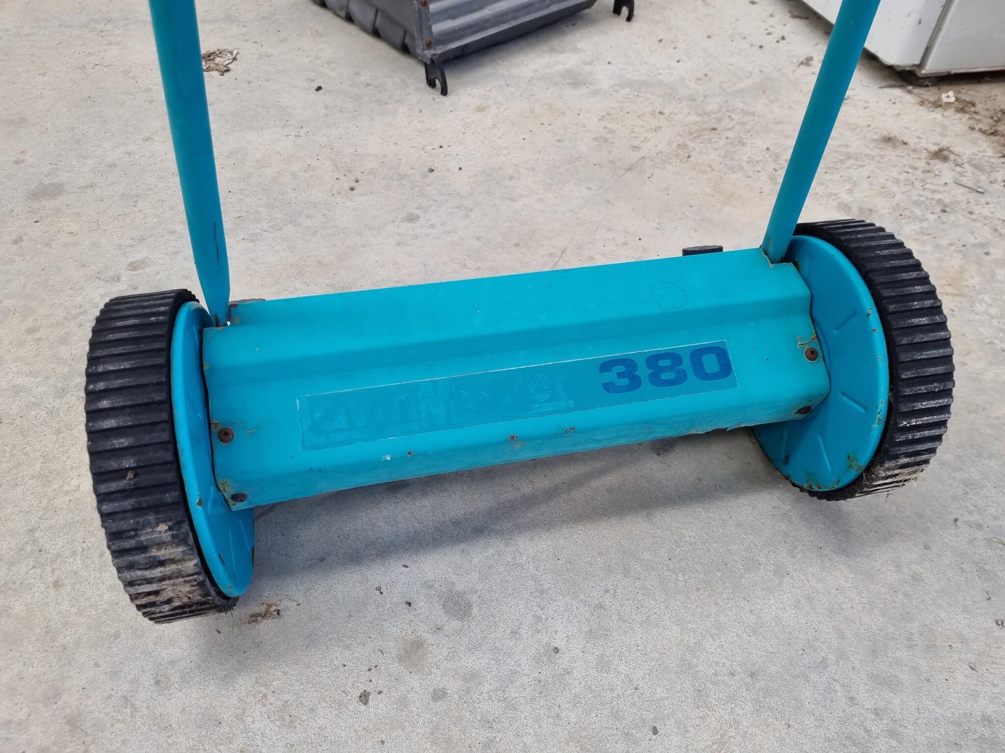Lawn Master 380 Push Reel Lawnmower. 380mm wide cutting width. Includes catch basket. Mower operates on pavement, Cutters not tested on grass. Unknown if catch basket is complete as unable to mount it to mower.