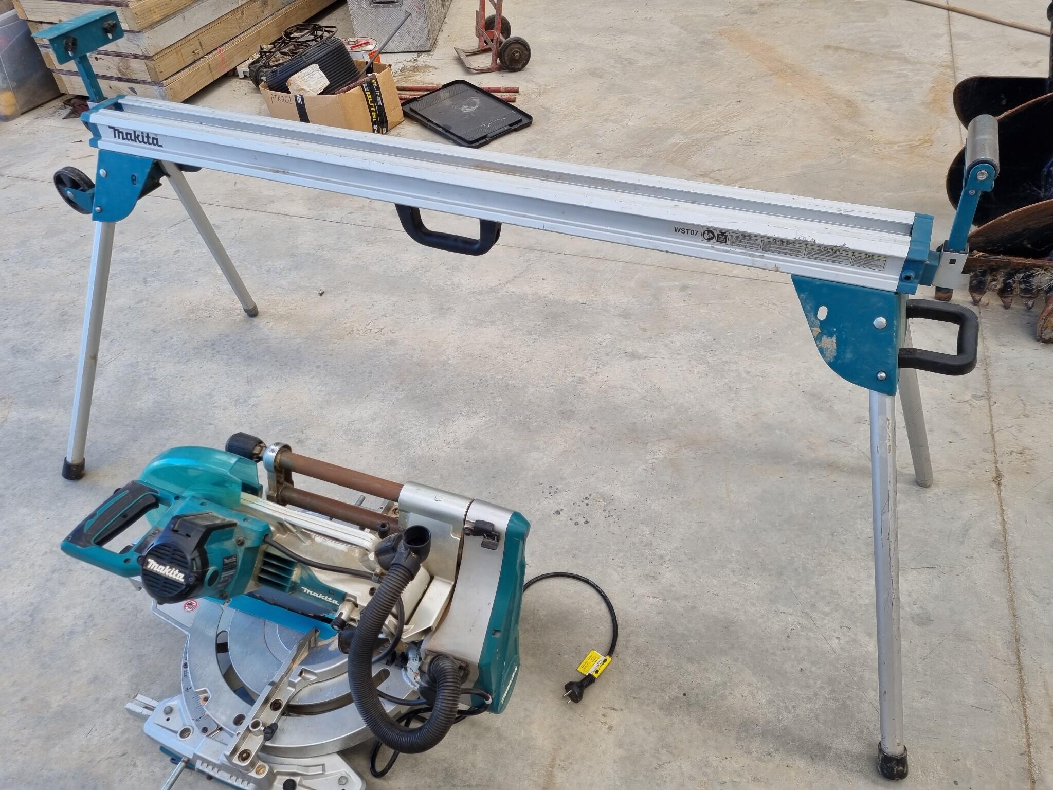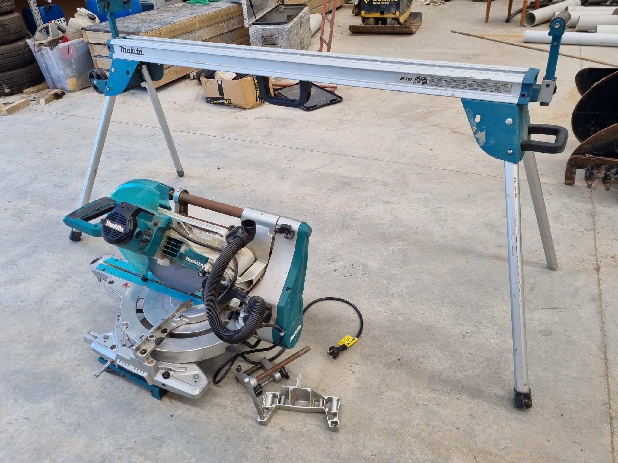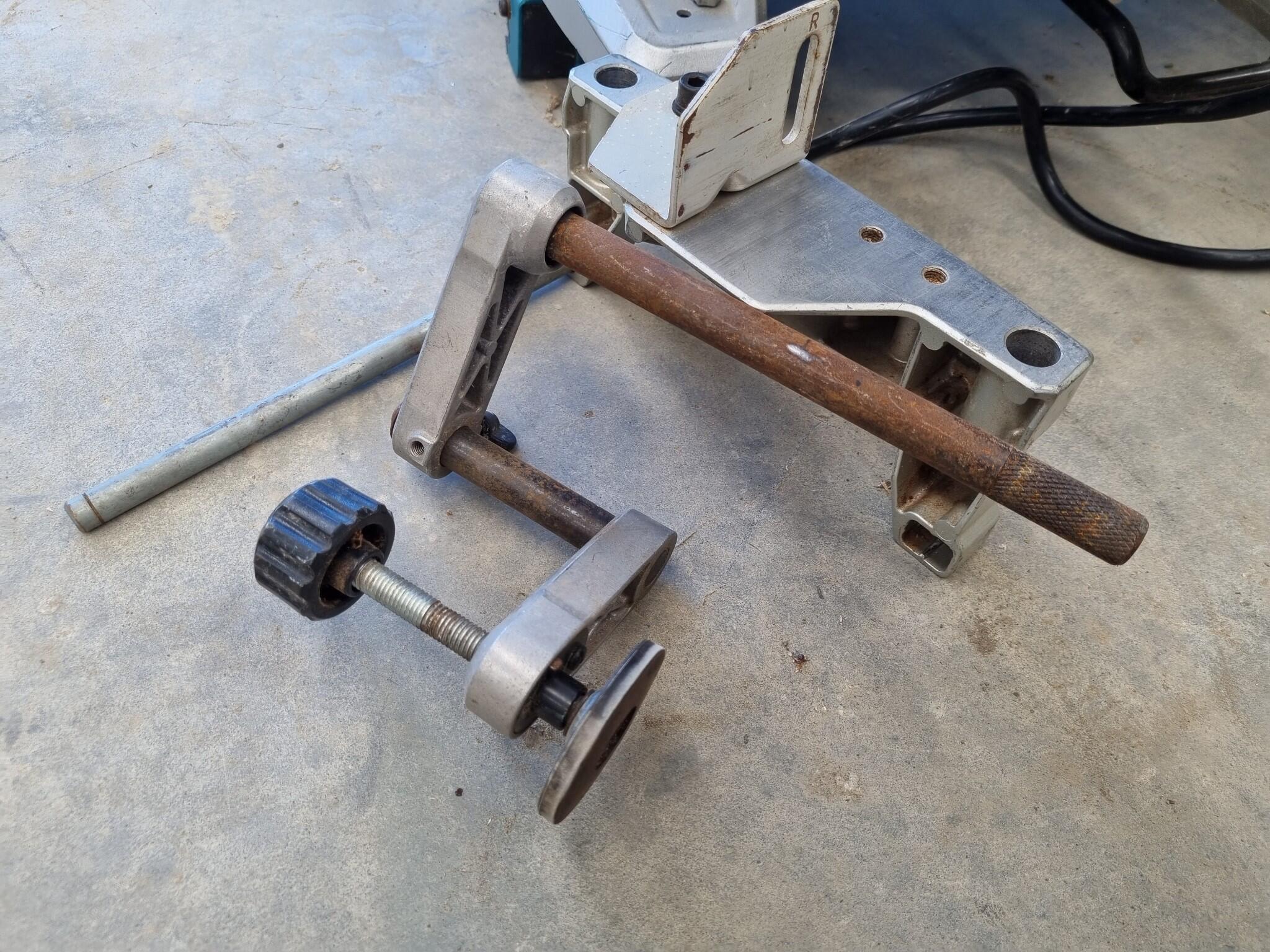Note that the mounting clamps on bottom of saw are damaged and will not properly connect to the stand. Saw functions normaly otherwise.