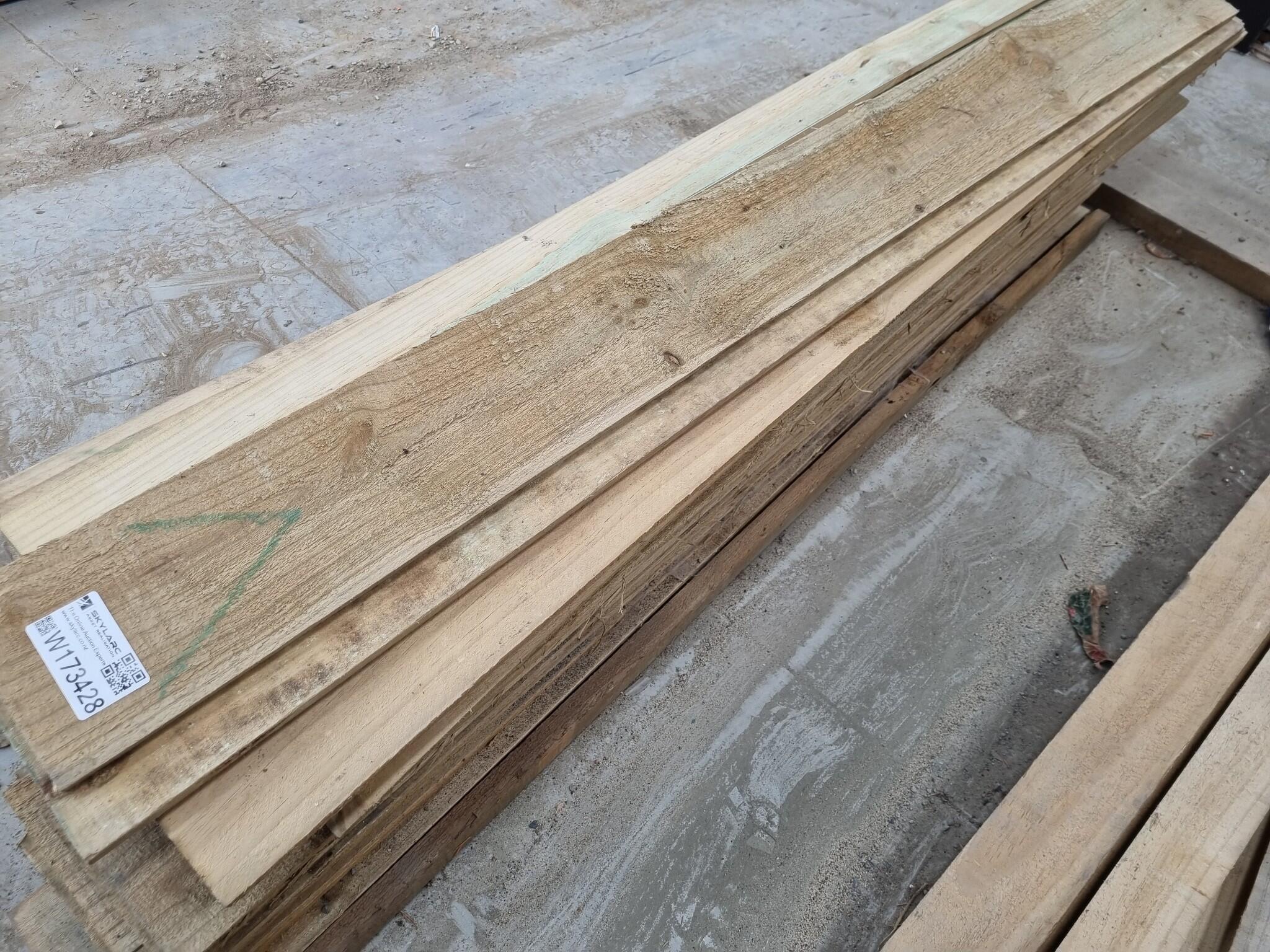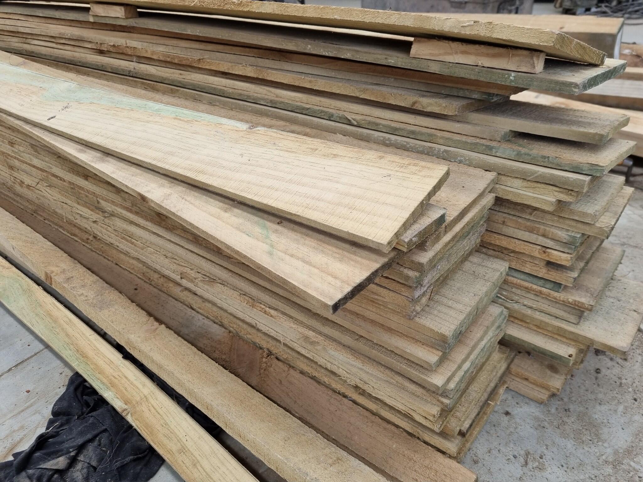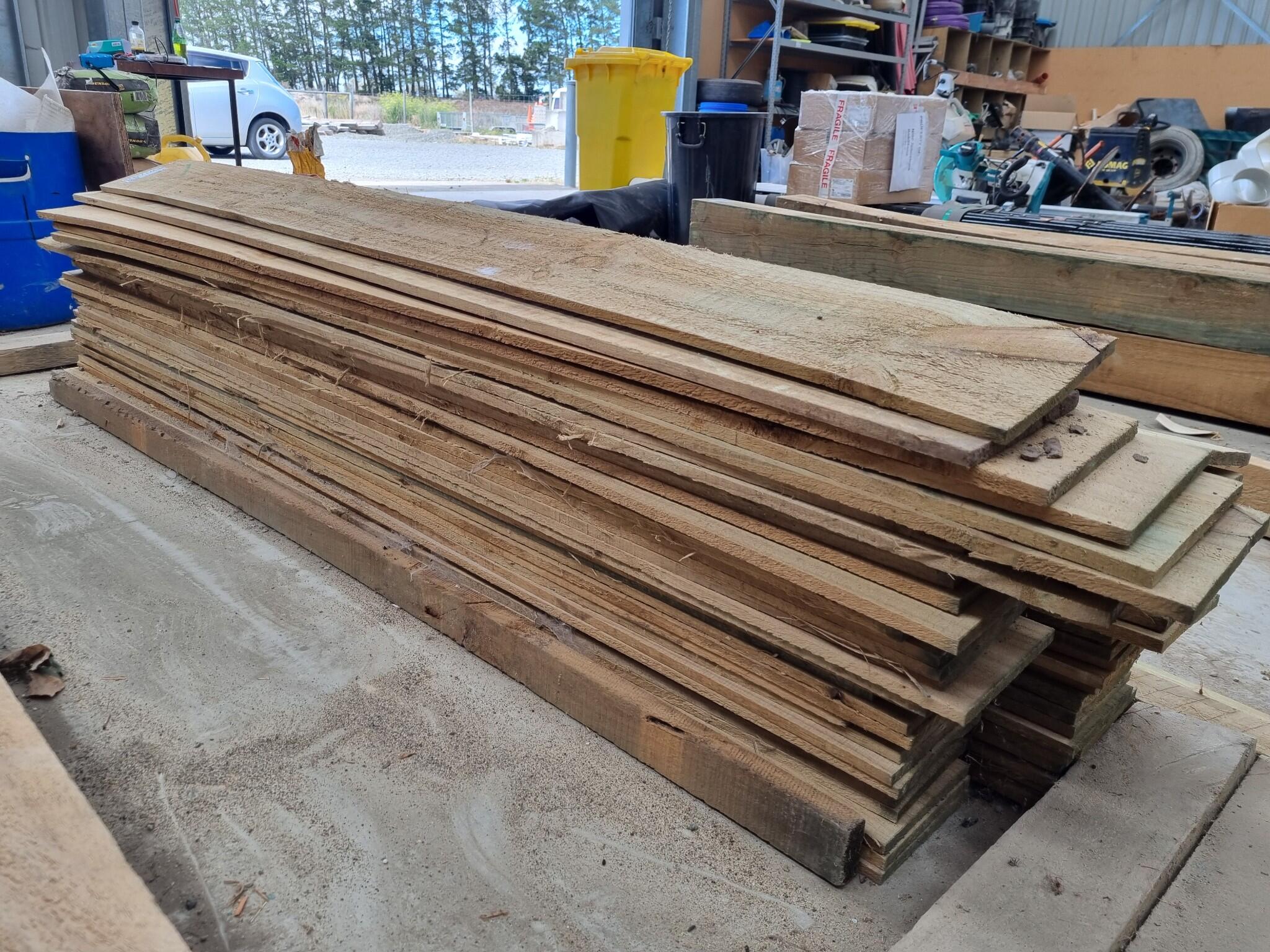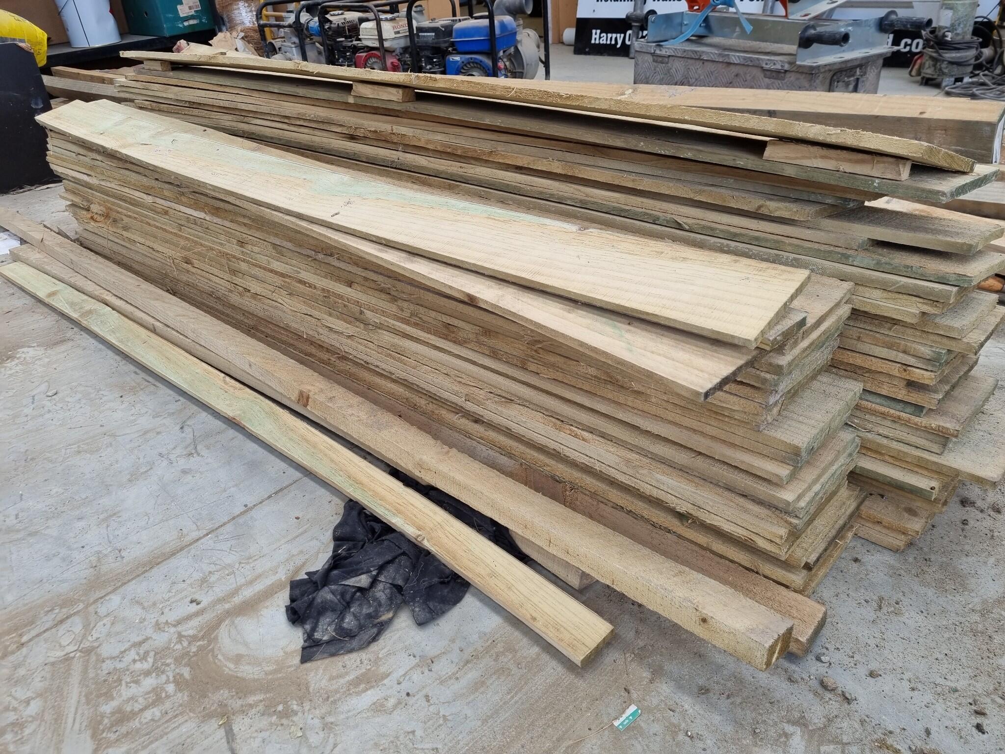 Assorted Wood Fencing Boards. Approx 50x Boards that are approx 1800x150x12mm. Includes about 5 other Boards of smaller dimensions. Unsure of wood type. Leftover unused workshop stock.