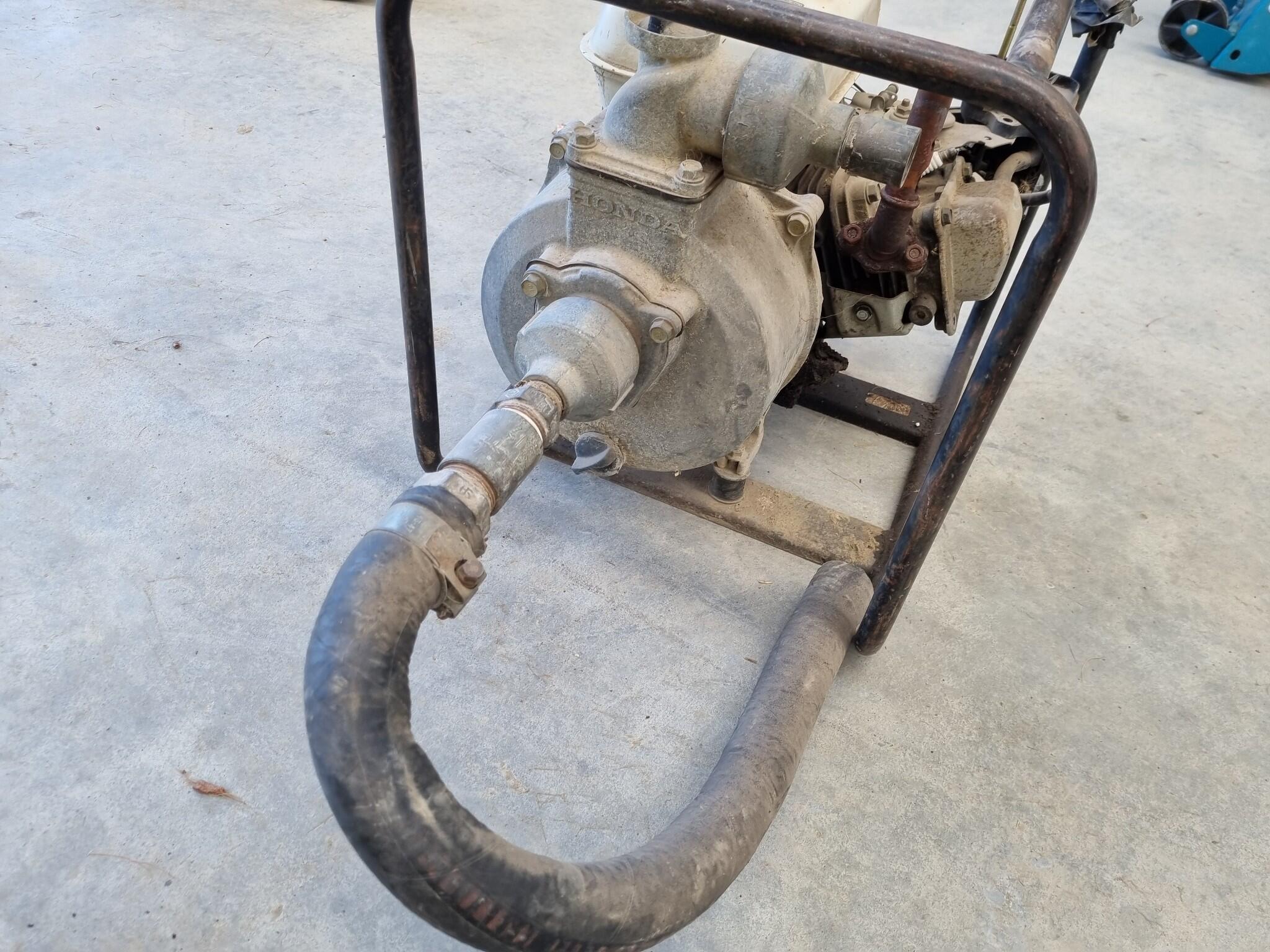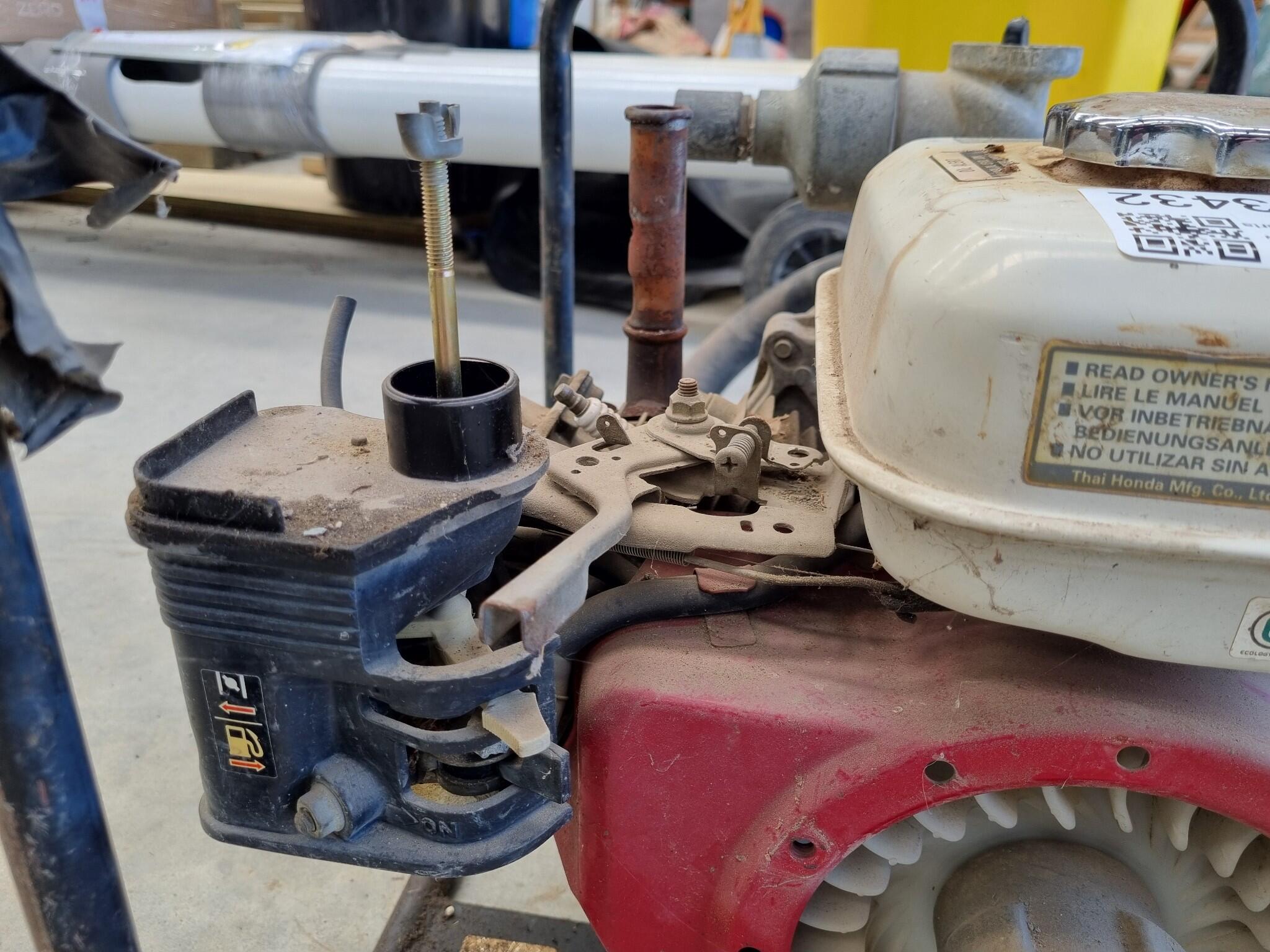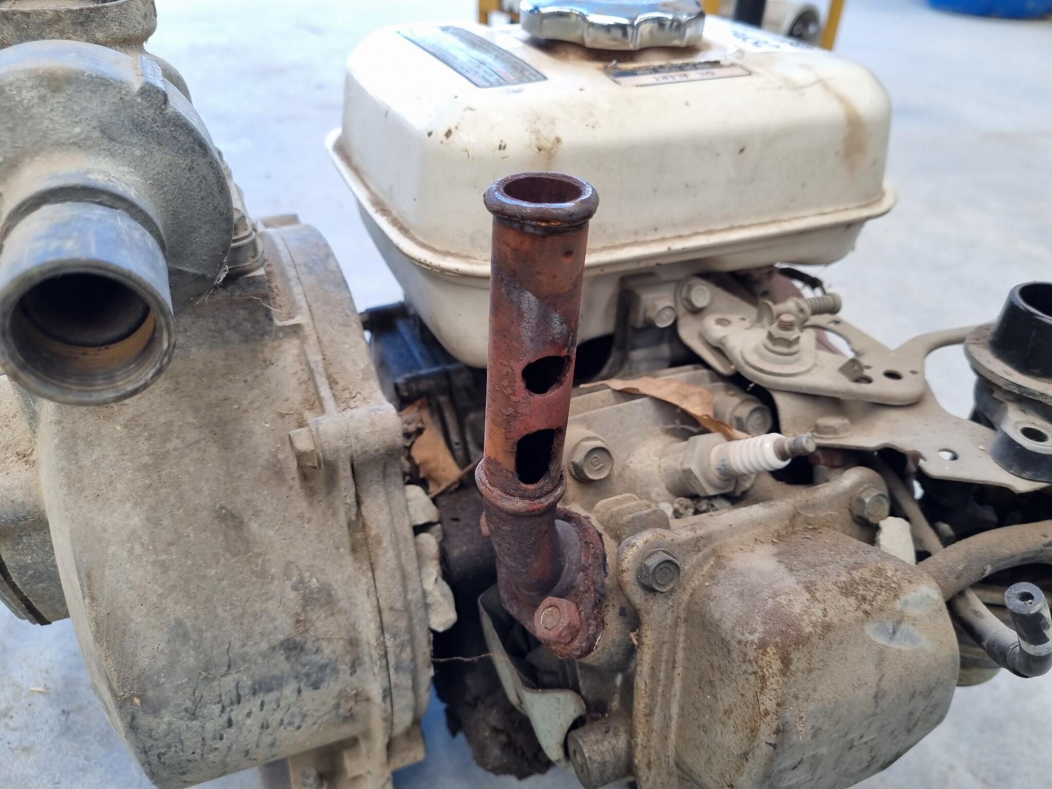 Engine is missing its pull cord assembly air filter, muffler, and spark plug cable is cut off. Unknown if other parts are missing or if engine is serviceable.