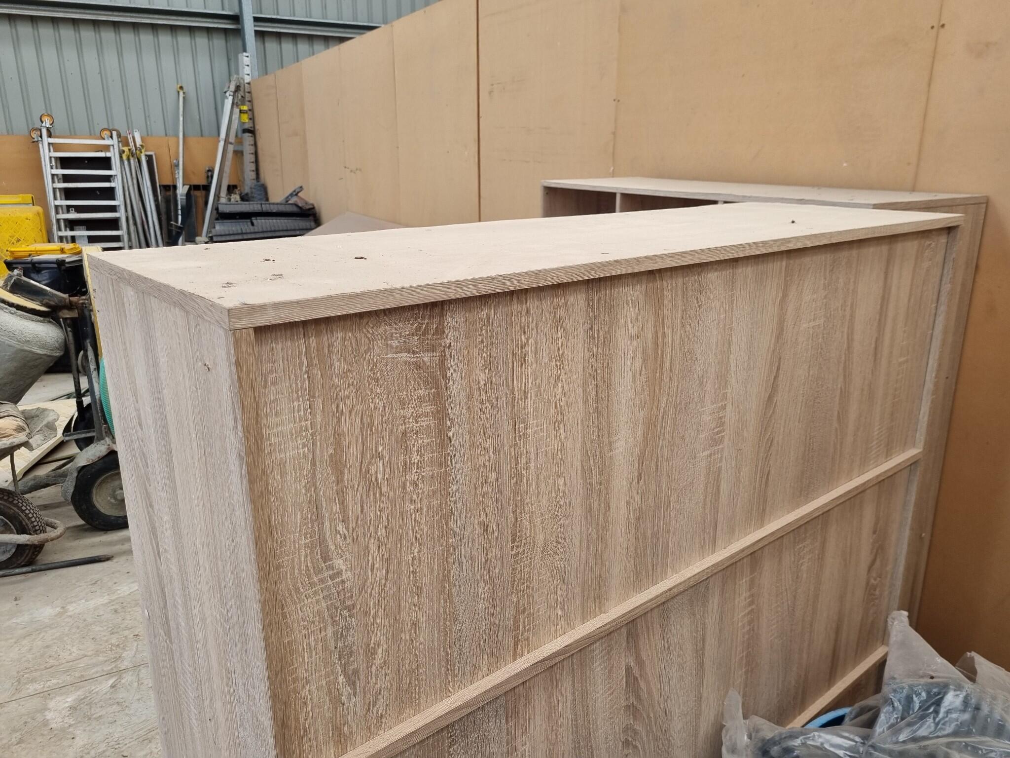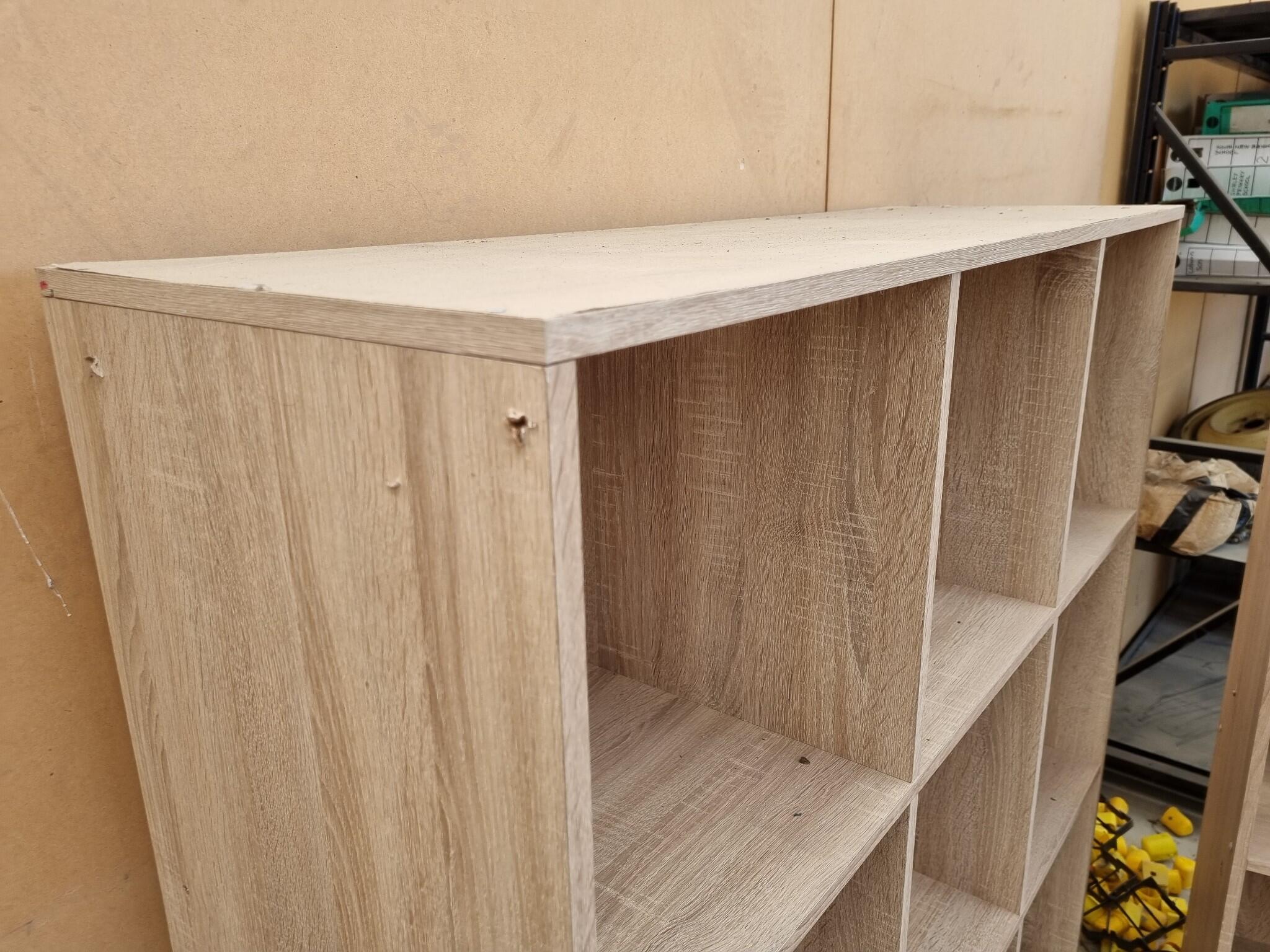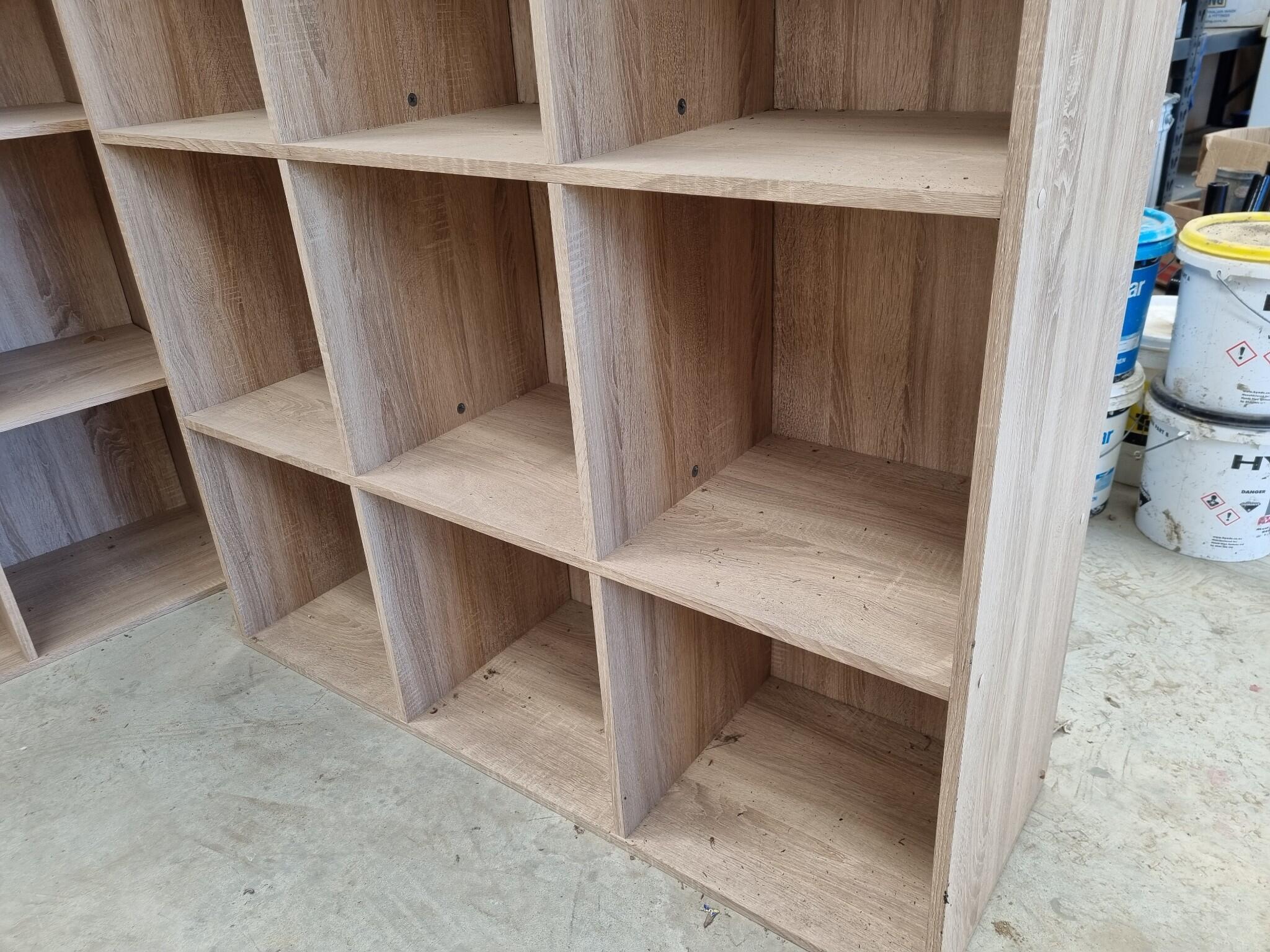 2x Shelving Units. Laminated MDF construction. Total size of each is 1190x390x1620mm. Each inner Shelving space is approx 375x370x385mm. Nothing previously used in a workshop. Some laminate is pealing.
