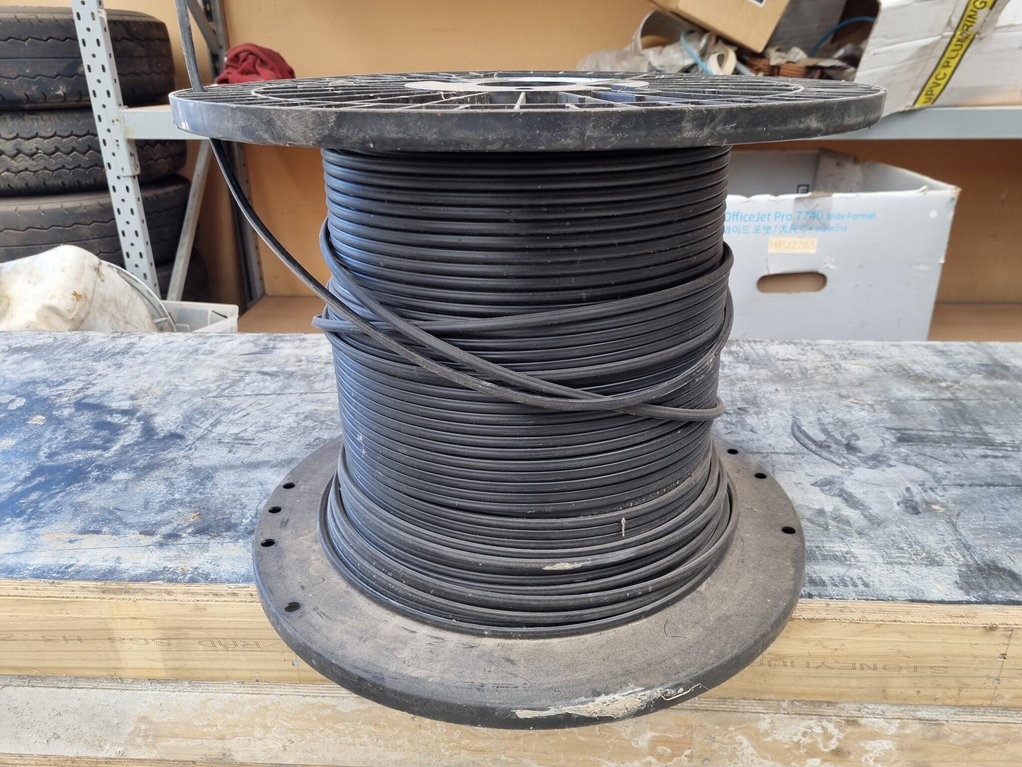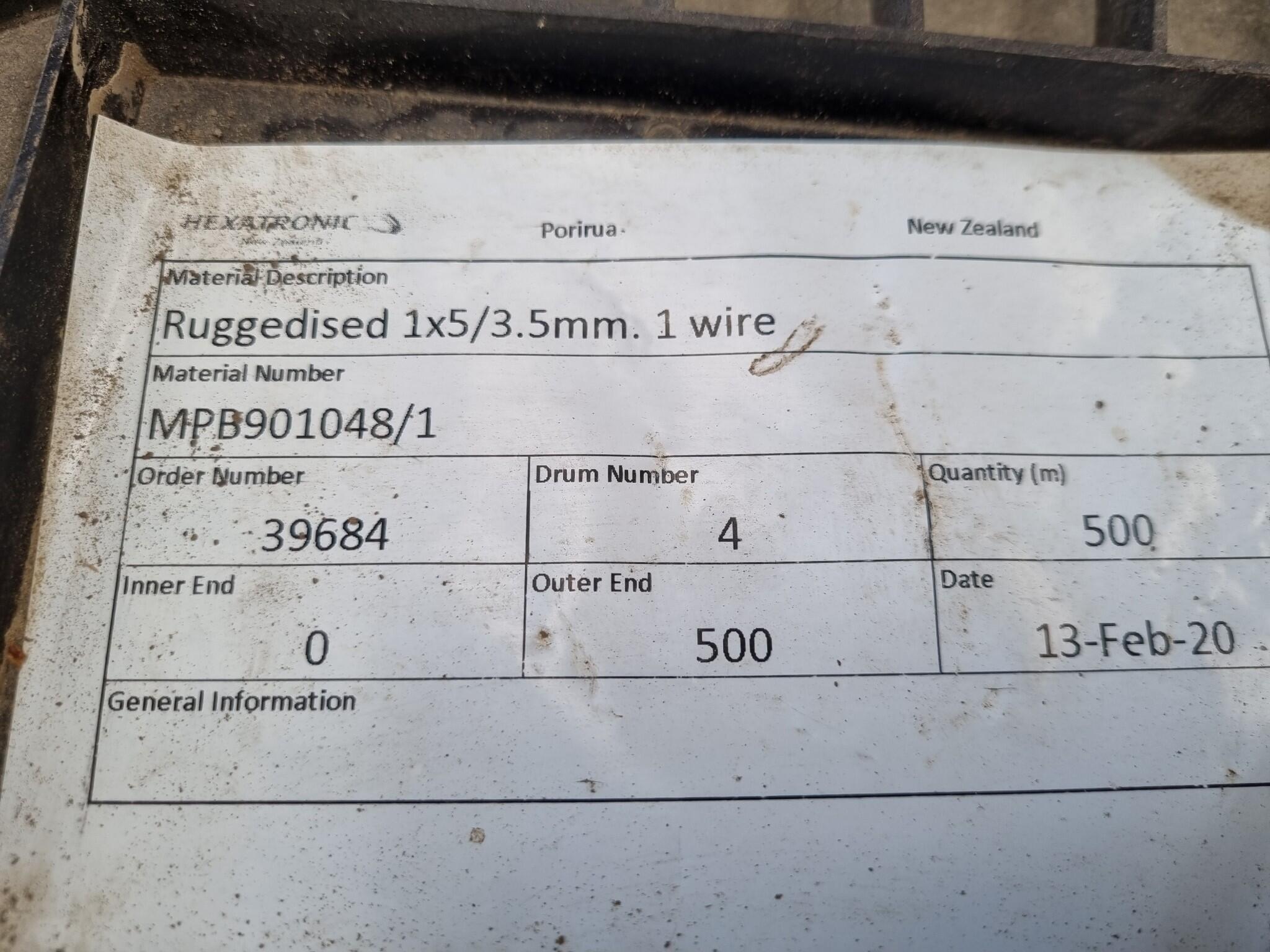 Hexatronic Ruggedised 1x5/3.5mm Wire Spool. Spool is 500mm diameter, 390mm tall. Length remaining on spool is unknown Stiff plastic casing on wire.