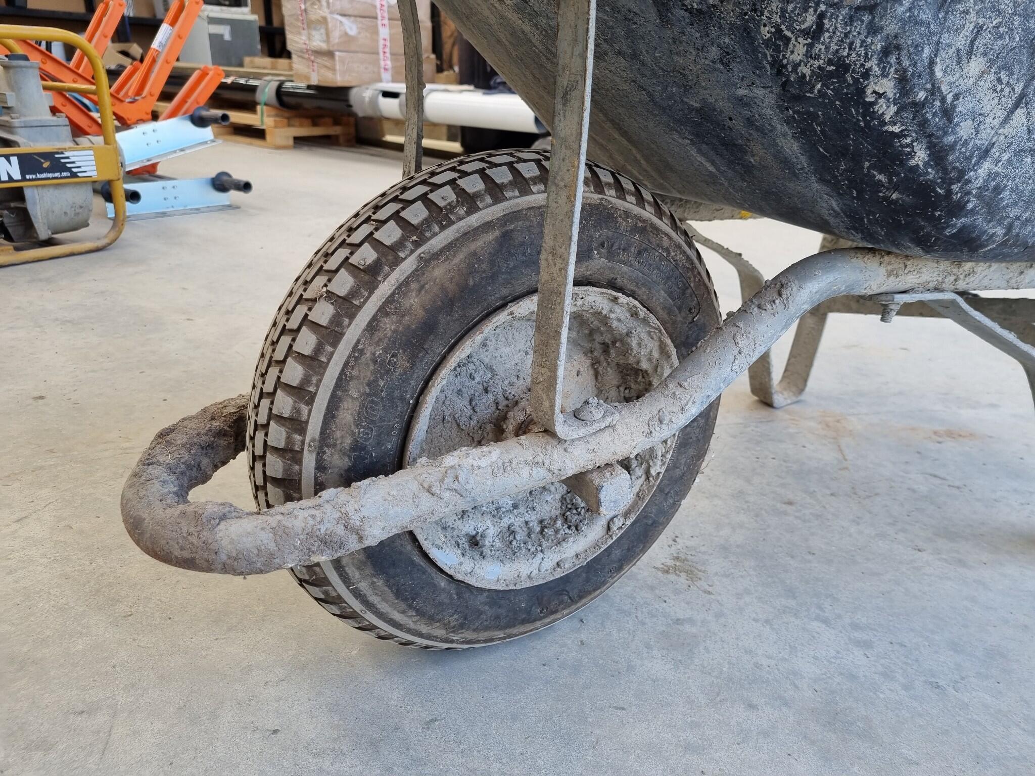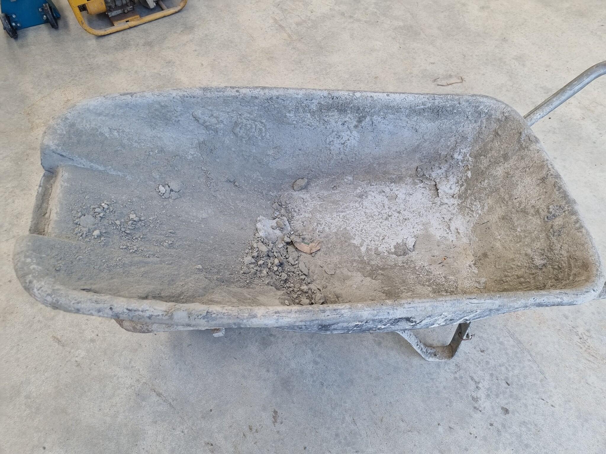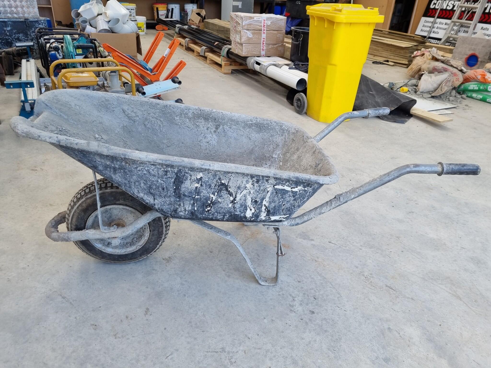 Wheelbarrow Trolley. Plastic basin approx 1050x540x270mm. 350mm diameter tyre. Rolls ok. Item was used in concrete mixing so is heavily crusted in dried concrete.