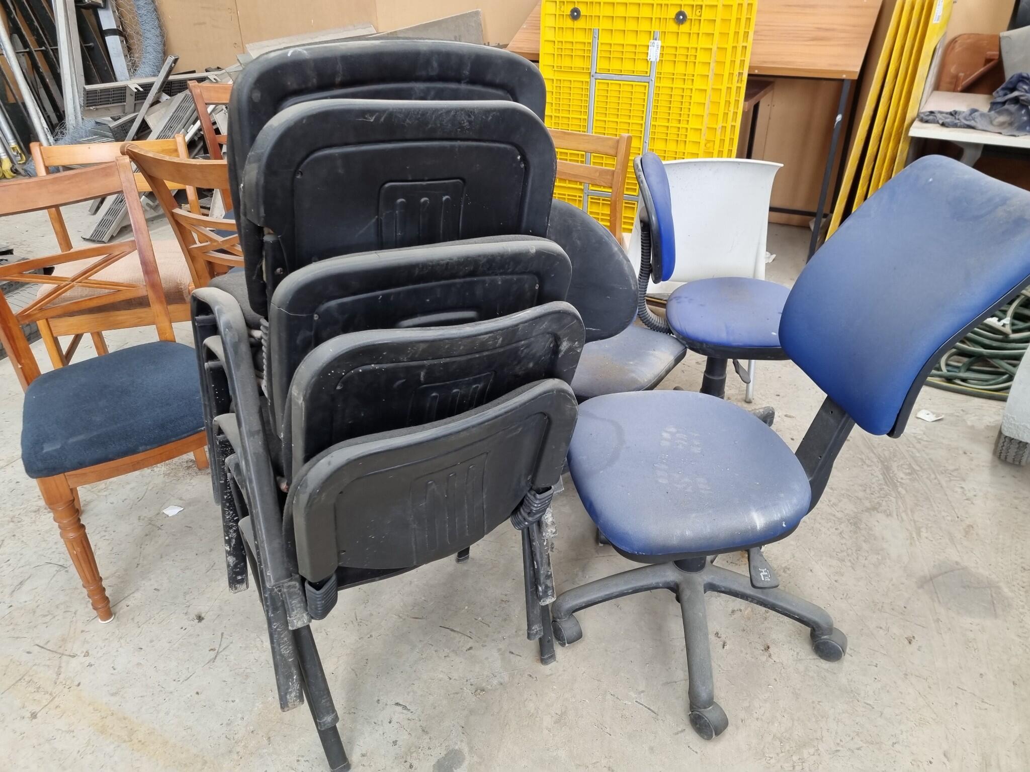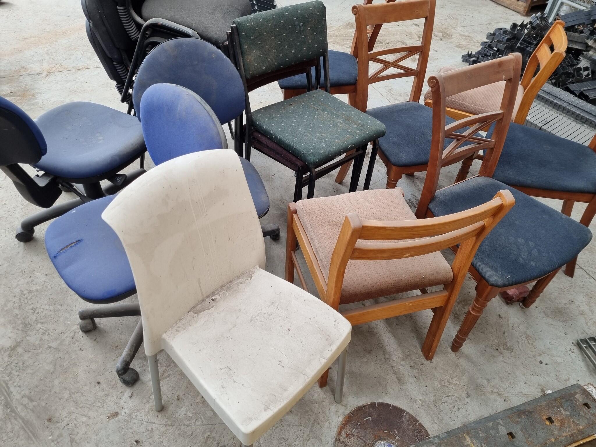 18x Assorted Chairs. Various desk chairs, stacking chairs, dinning chairs. See photos for further info on types of chairs included and their cindition. All are very dusty from Workshop storage, would benefit from a cleanup.
