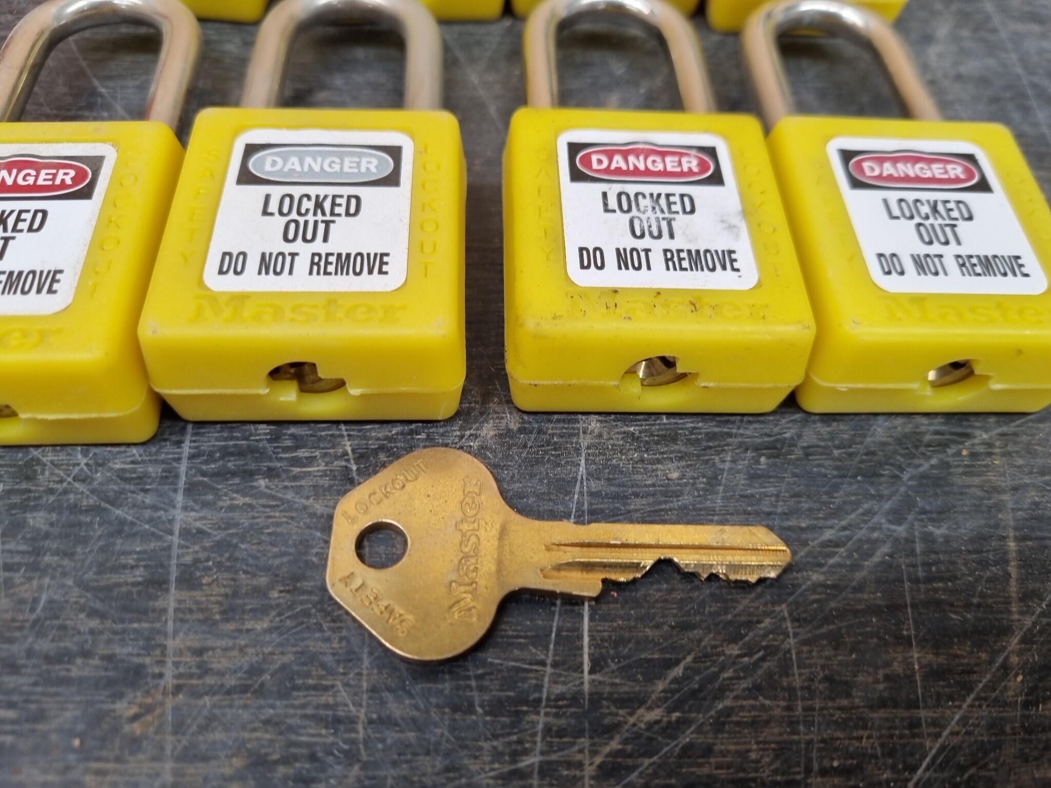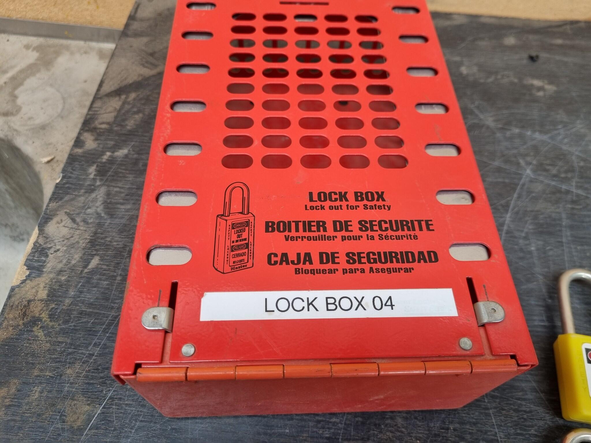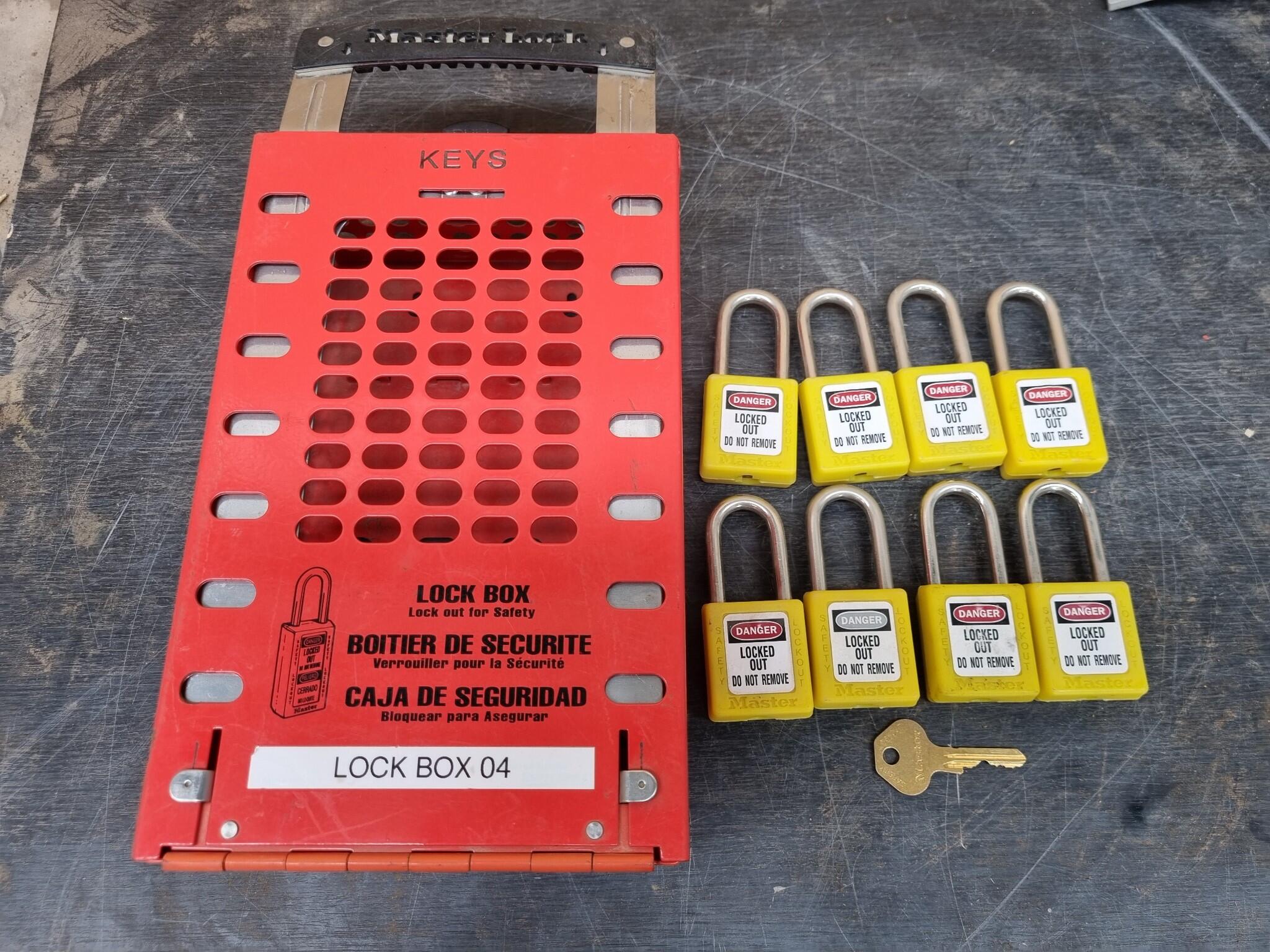 Master Lock Lockout Box measuring approx 320x160x85mm. Includes 8x Safety Lockout Padlocks plus one brass key that works on all included padlocks.