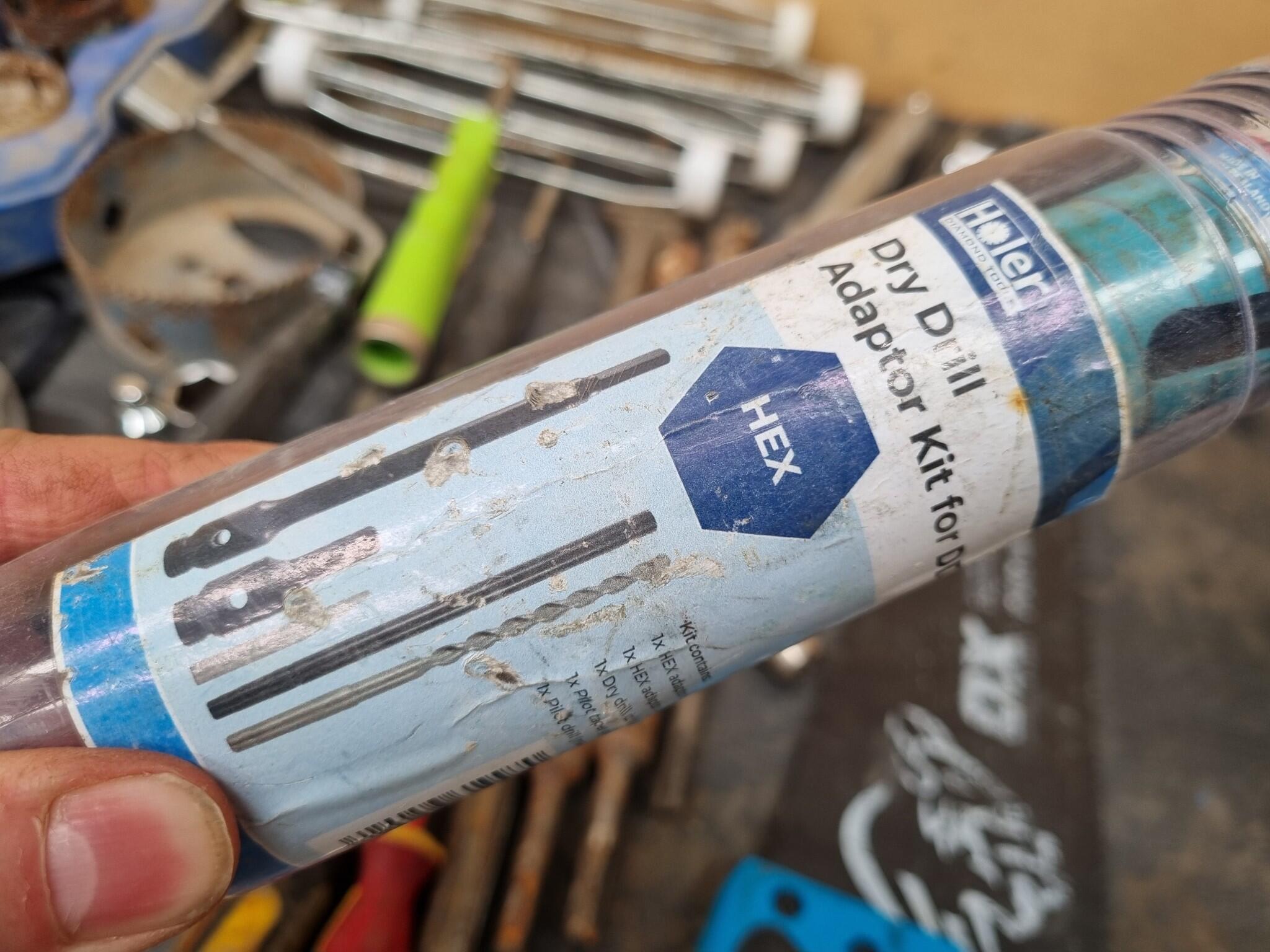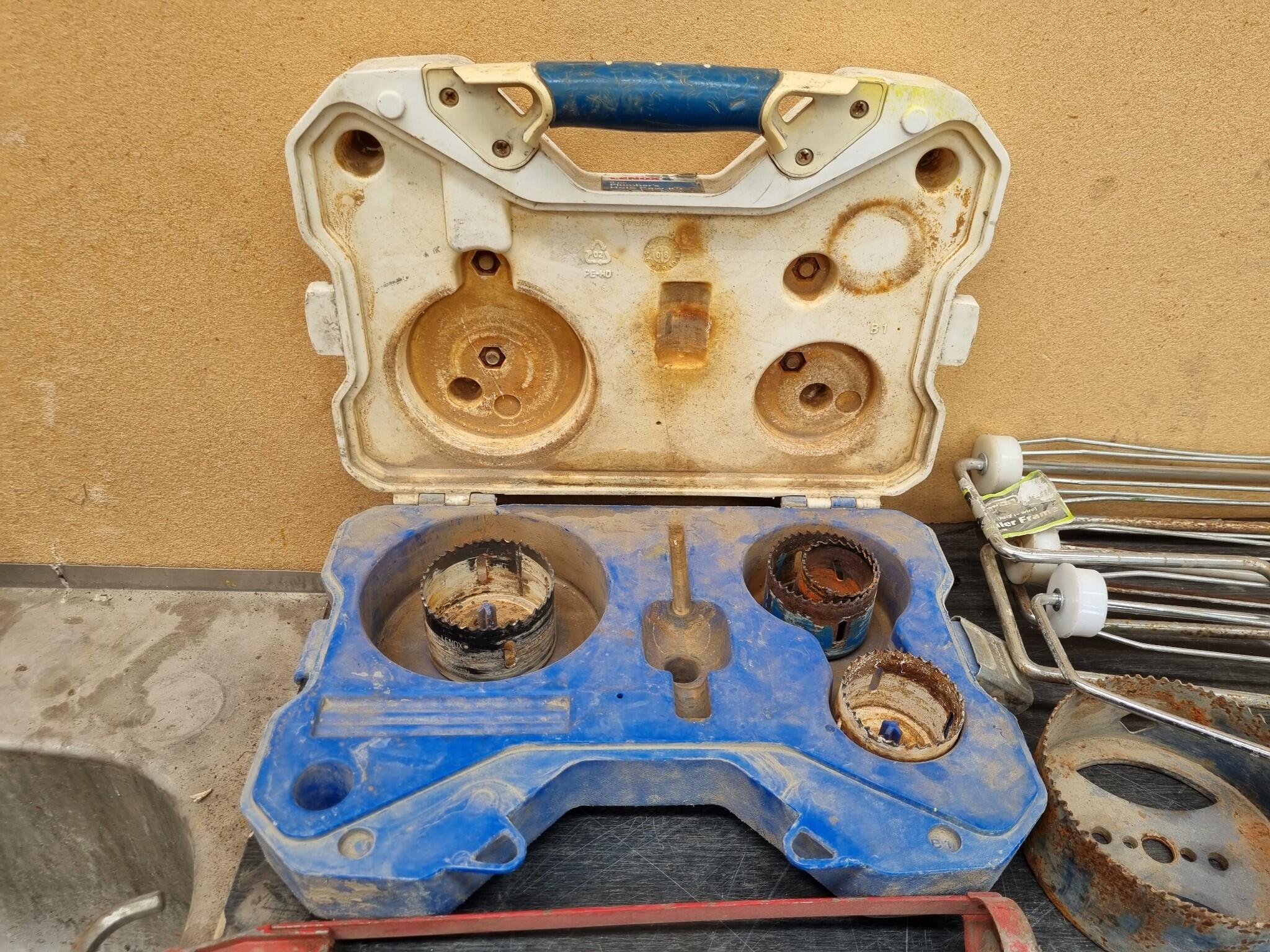 Assorted Handtools & Power Tool Accessories. Includes hole saws, pipe bender, wood saws, drill bits, painting rollers, caulking gun, incomplete wrench kits, and more, see photos. Condition varies greatly with each item.