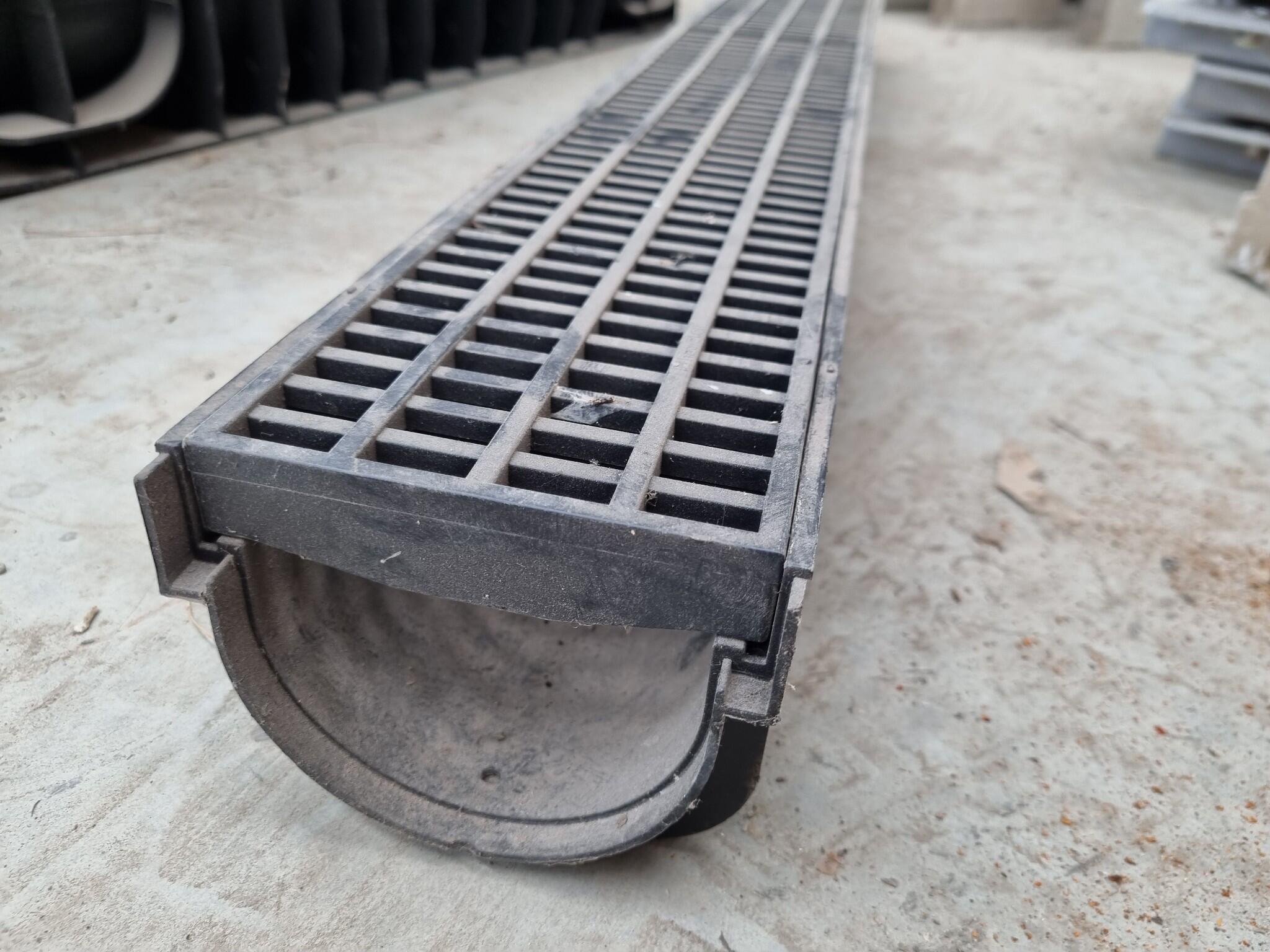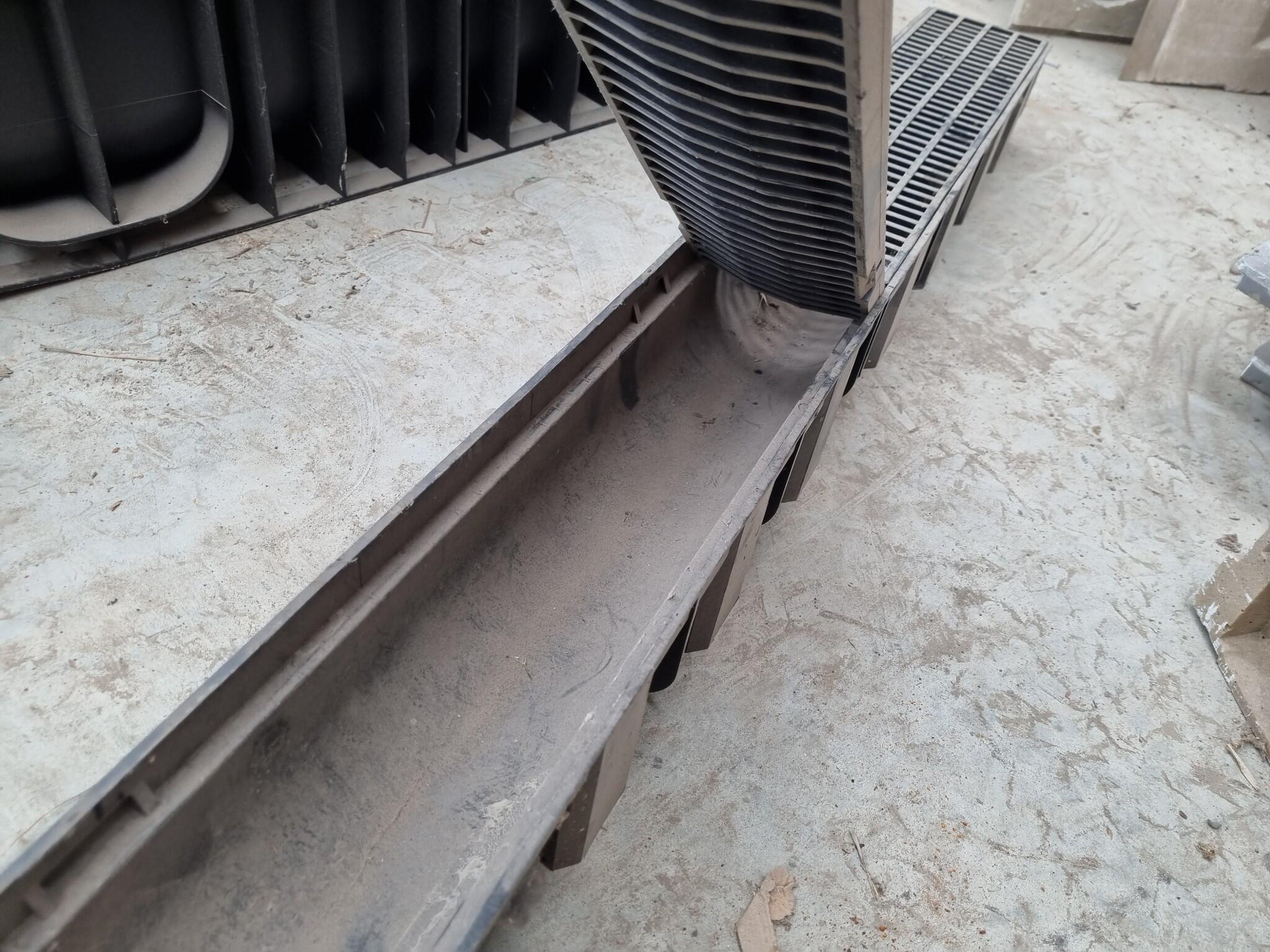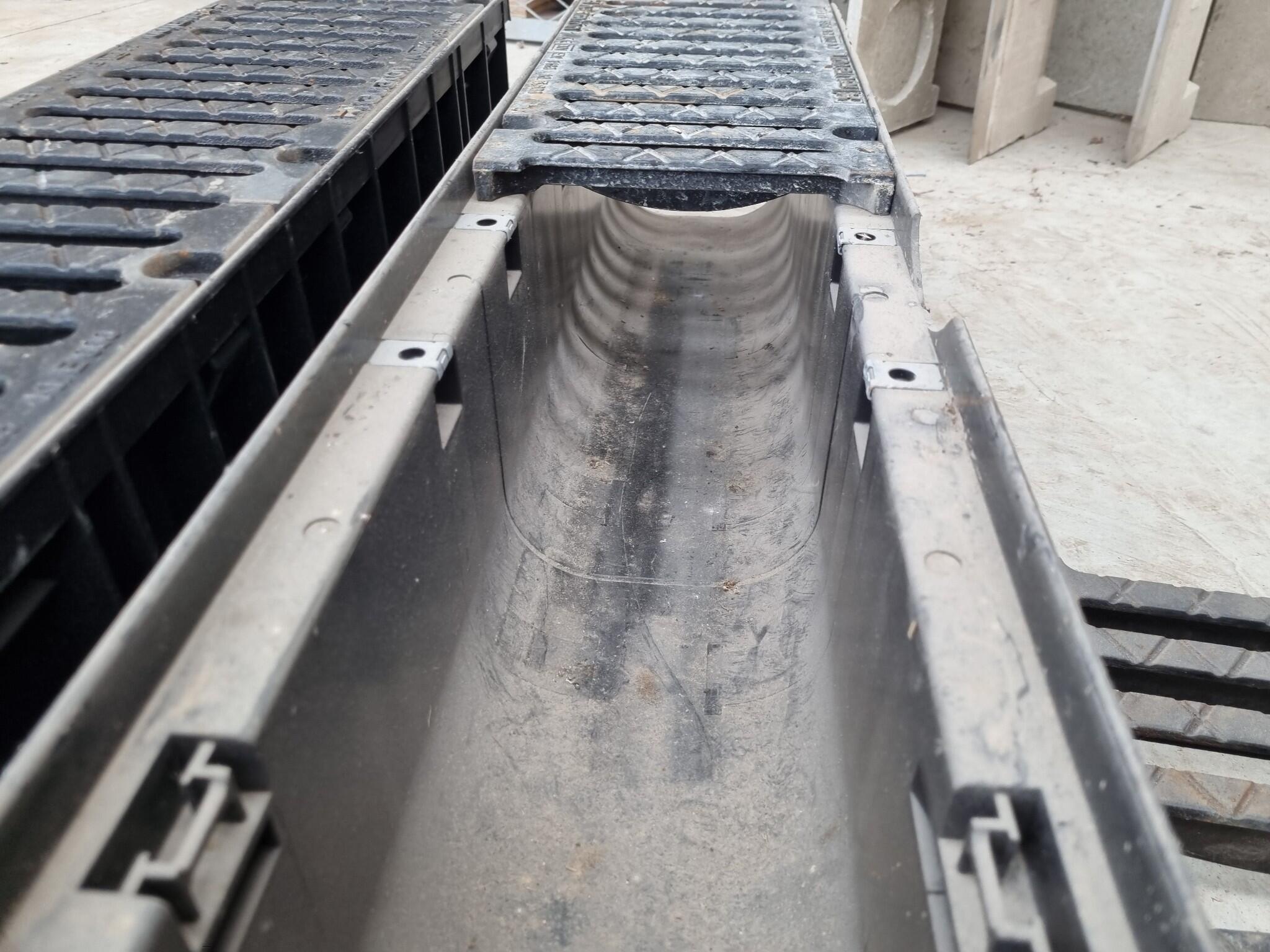 Two unknown brand pvc plastic drainage channels both 120mm wide, 90mm deep with removable pvc plastic Grates. One channel is uncut and 1000mm long and second cut channel is 600mm long.