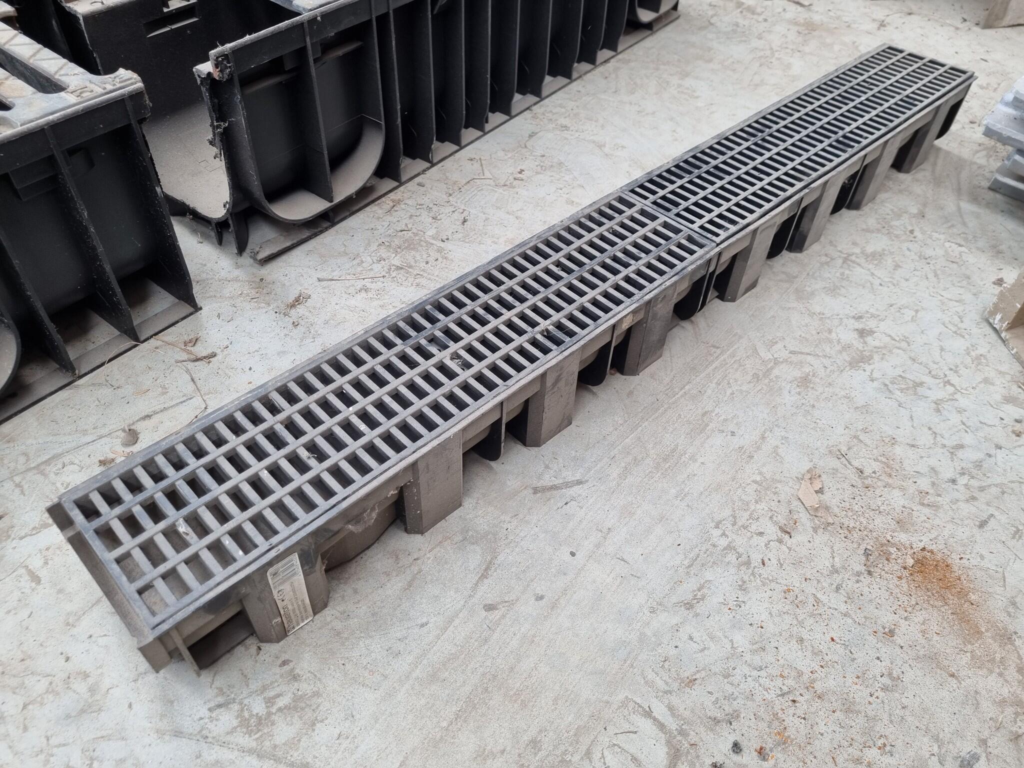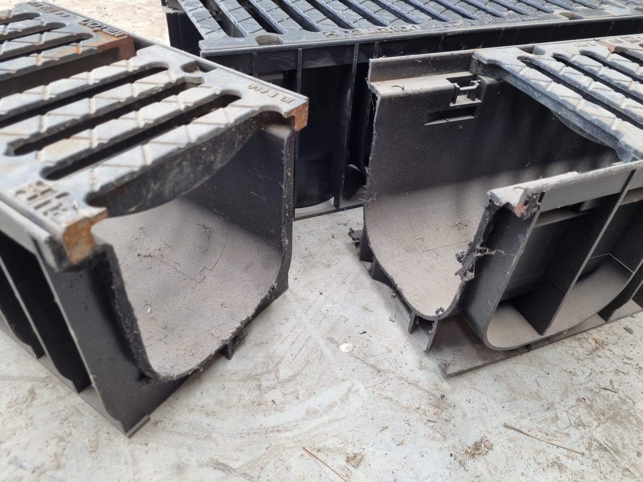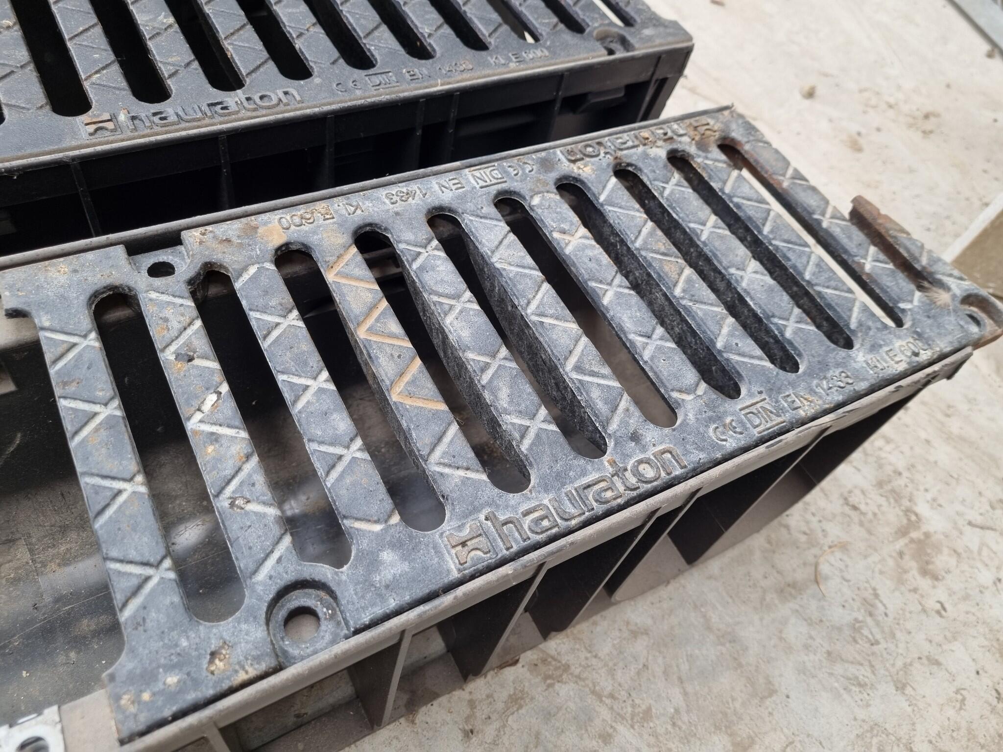 Theee Hauraton branded drainage channel units with cast iron top Grates and PVC plastic drainage channels. One complete channel is 1000mm long wirh two 500mm long Grates. With the are 210mm, depths are 210mm. Also includes two cut channels with cut grating pieces, one channel is 840mm long and other is 330mm long.