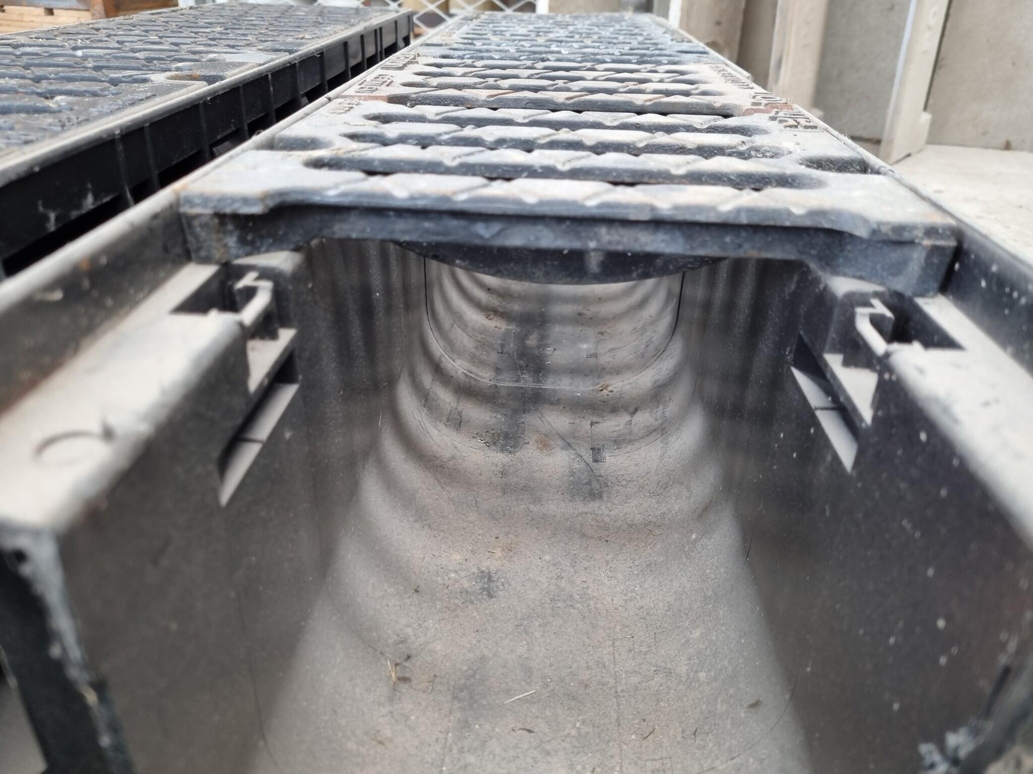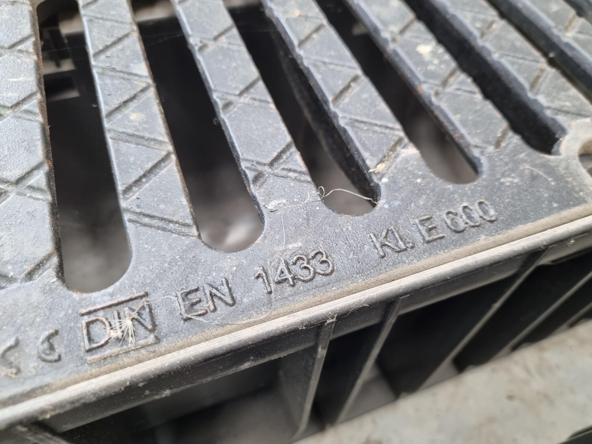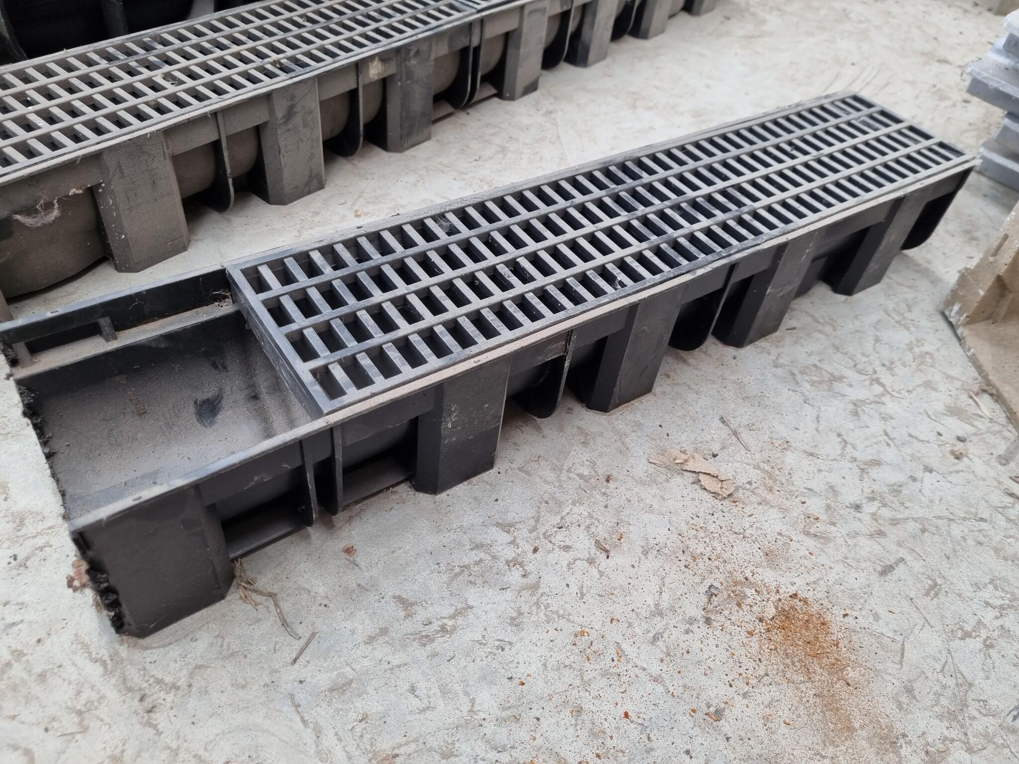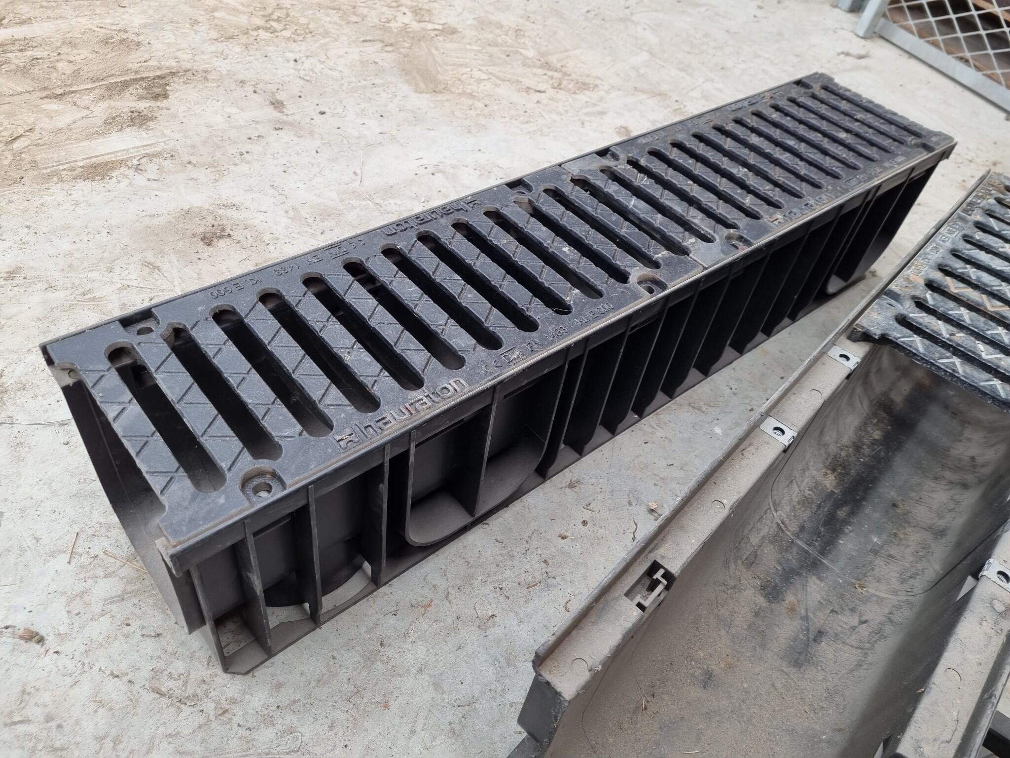 Theee Hauraton branded drainage channel units with cast iron top Grates and PVC plastic drainage channels. One complete channel is 1000mm long wirh two 500mm long Grates. With the are 210mm, depths are 210mm. Also includes two cut channels with cut grating pieces, one channel is 840mm long and other is 330mm long.