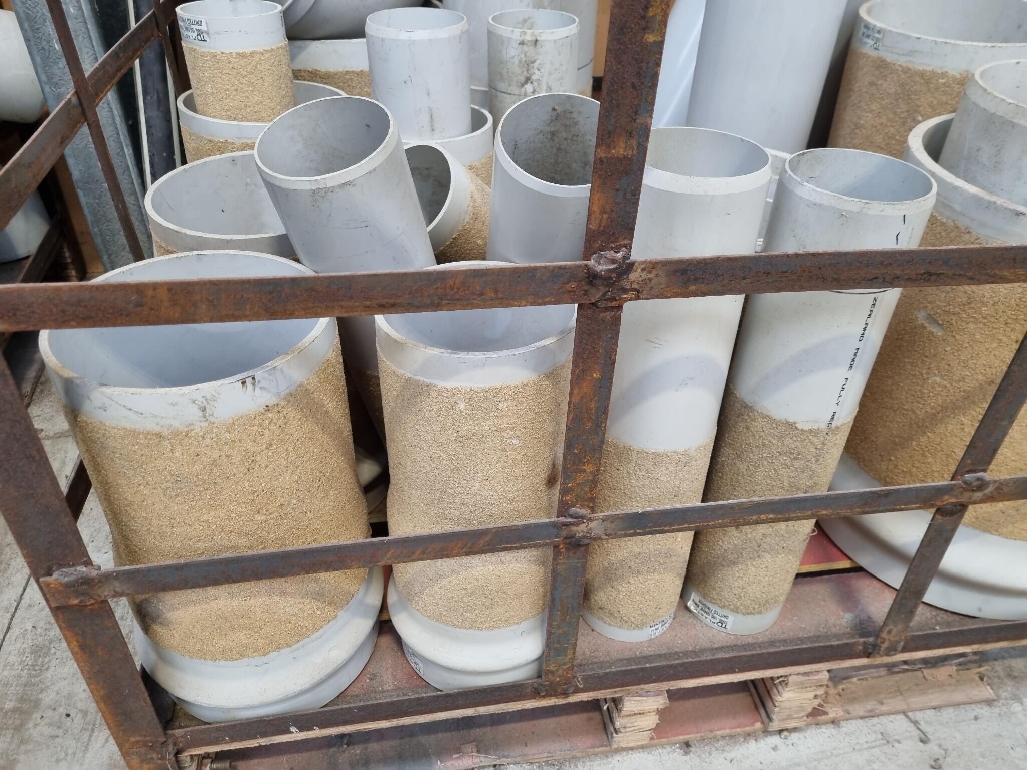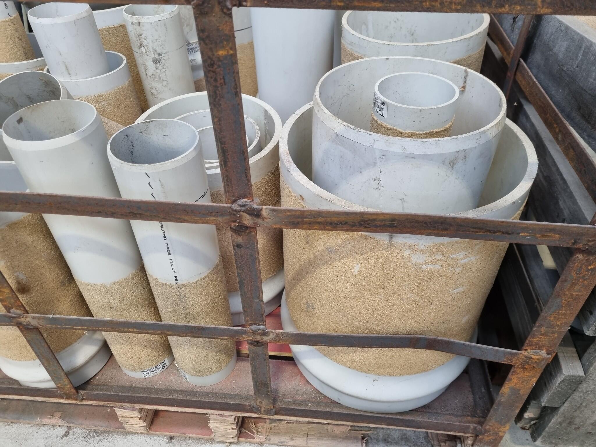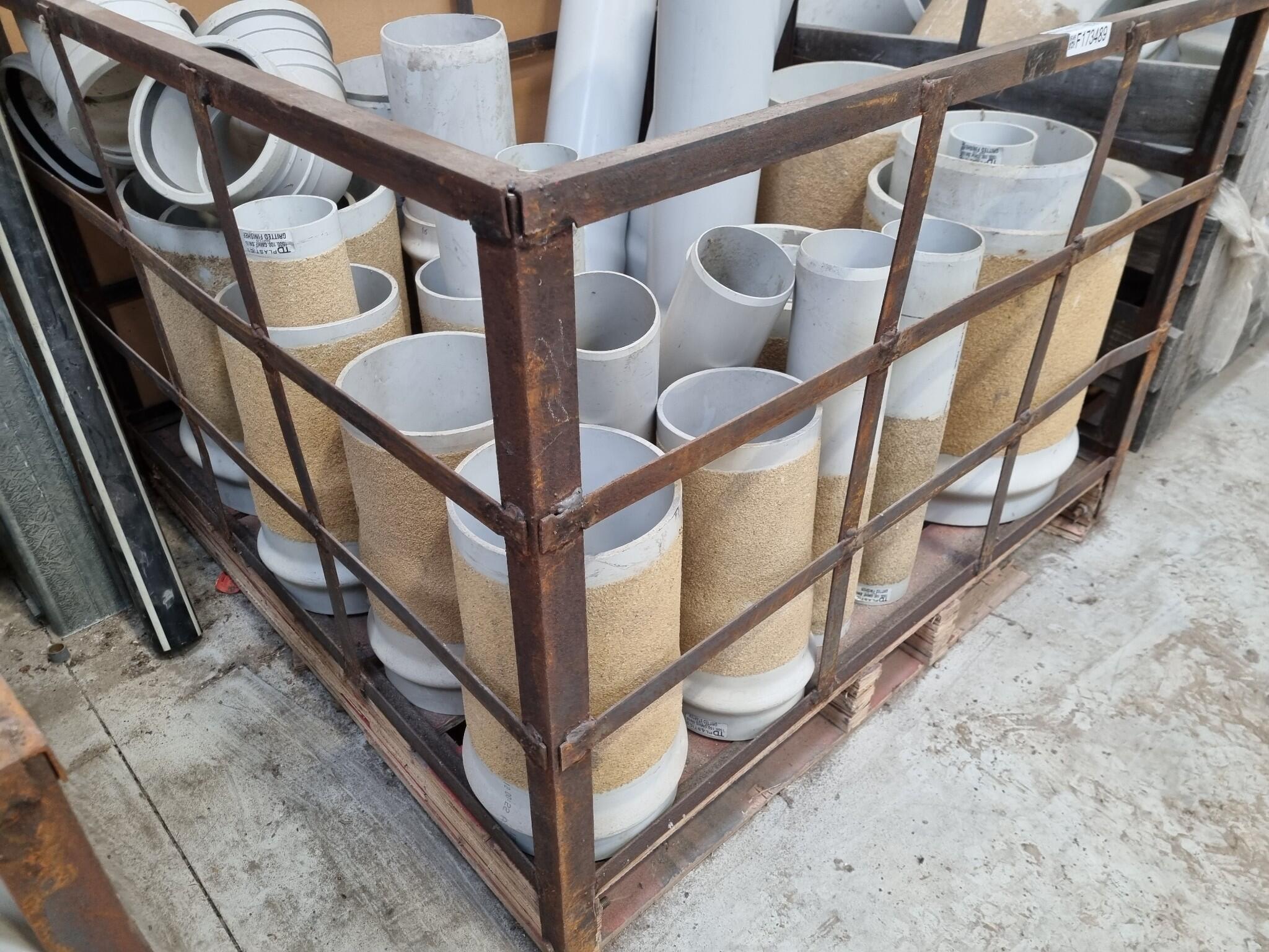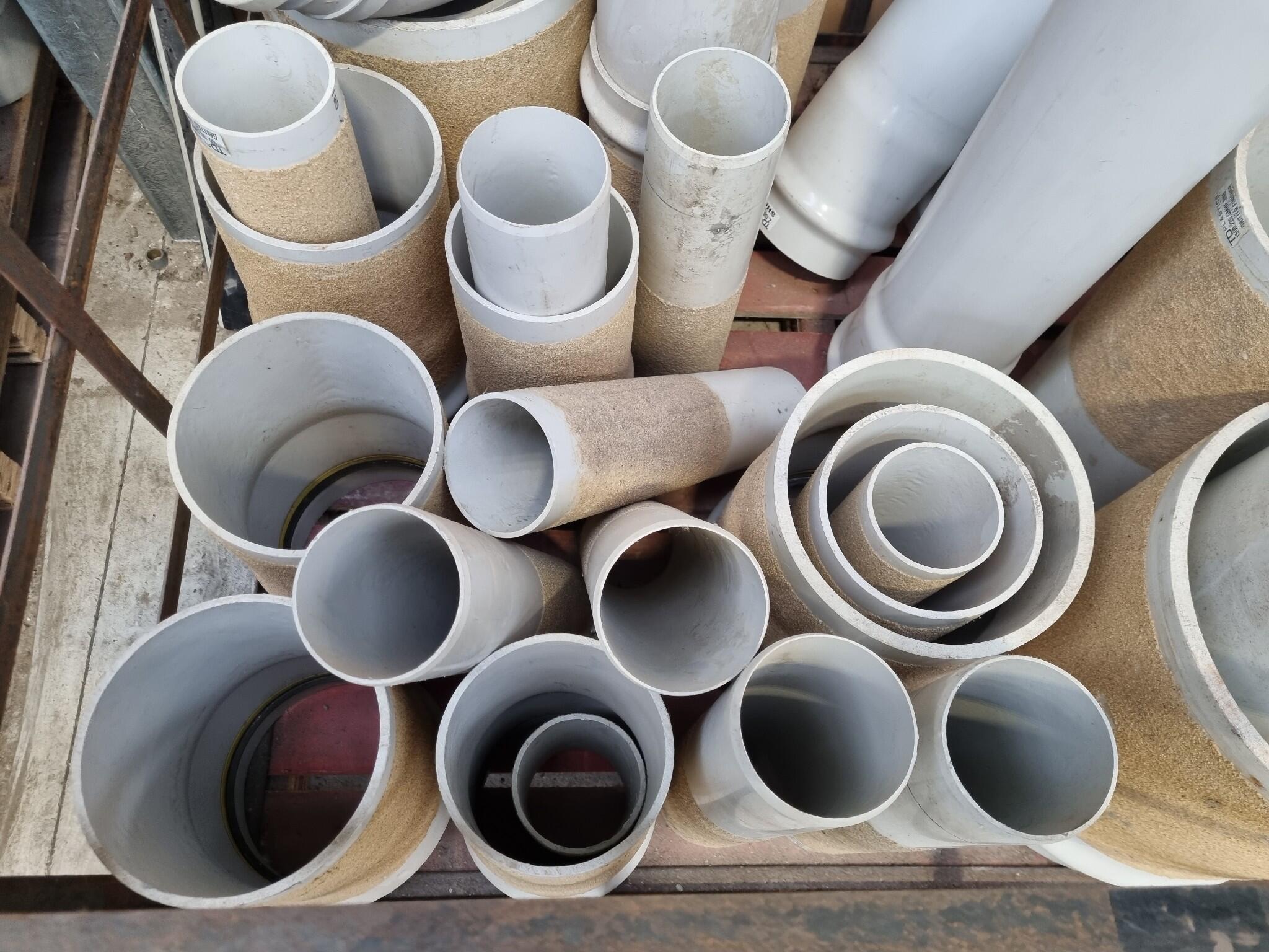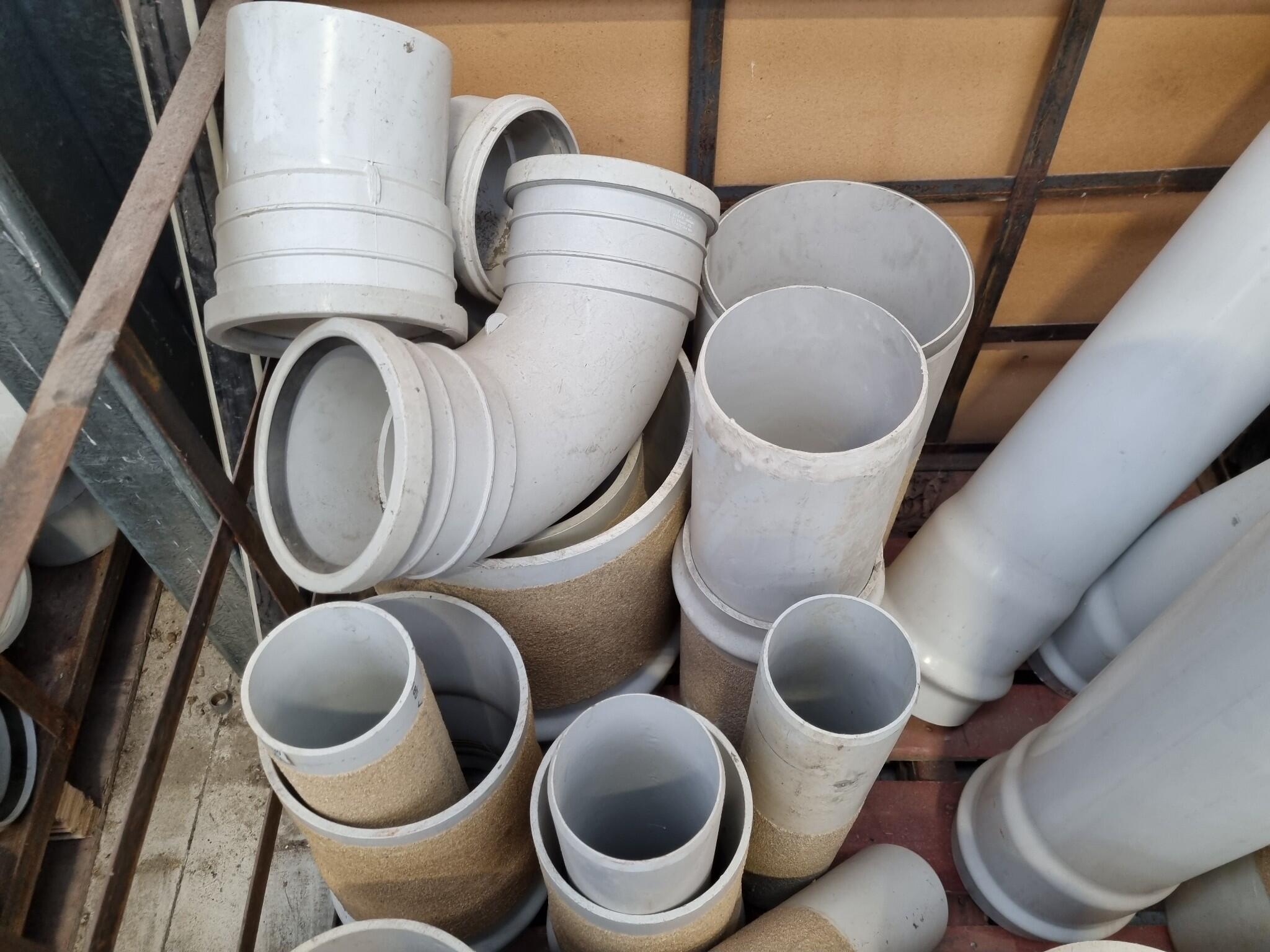 Assorted PVC Pipe Connectors, Fittings. Diameters range from 110mm to 330mm. Lengths up to 930mm. See photos for further details on types included. Approx 30x units in this auction. Includes the steel crate as well.