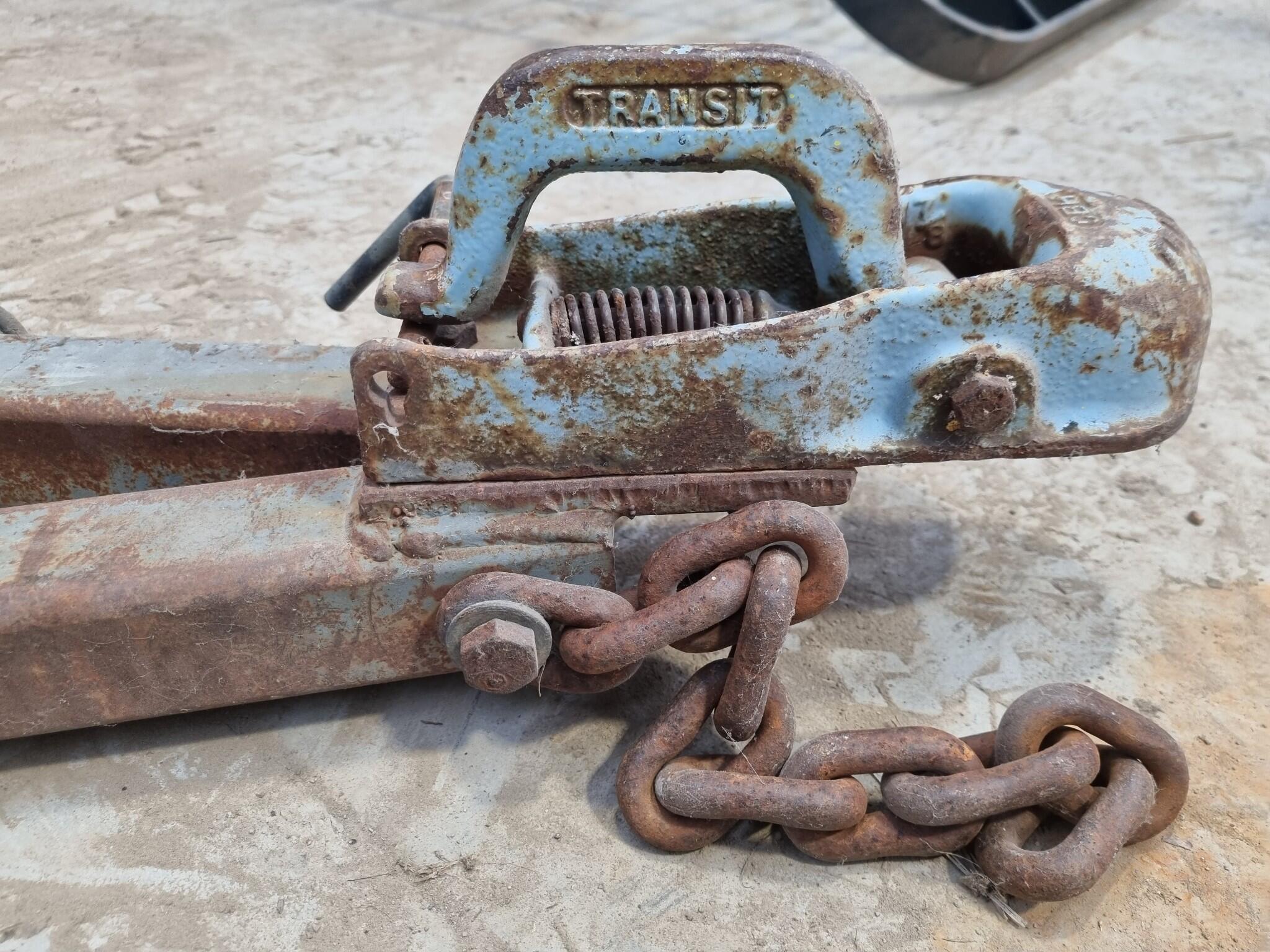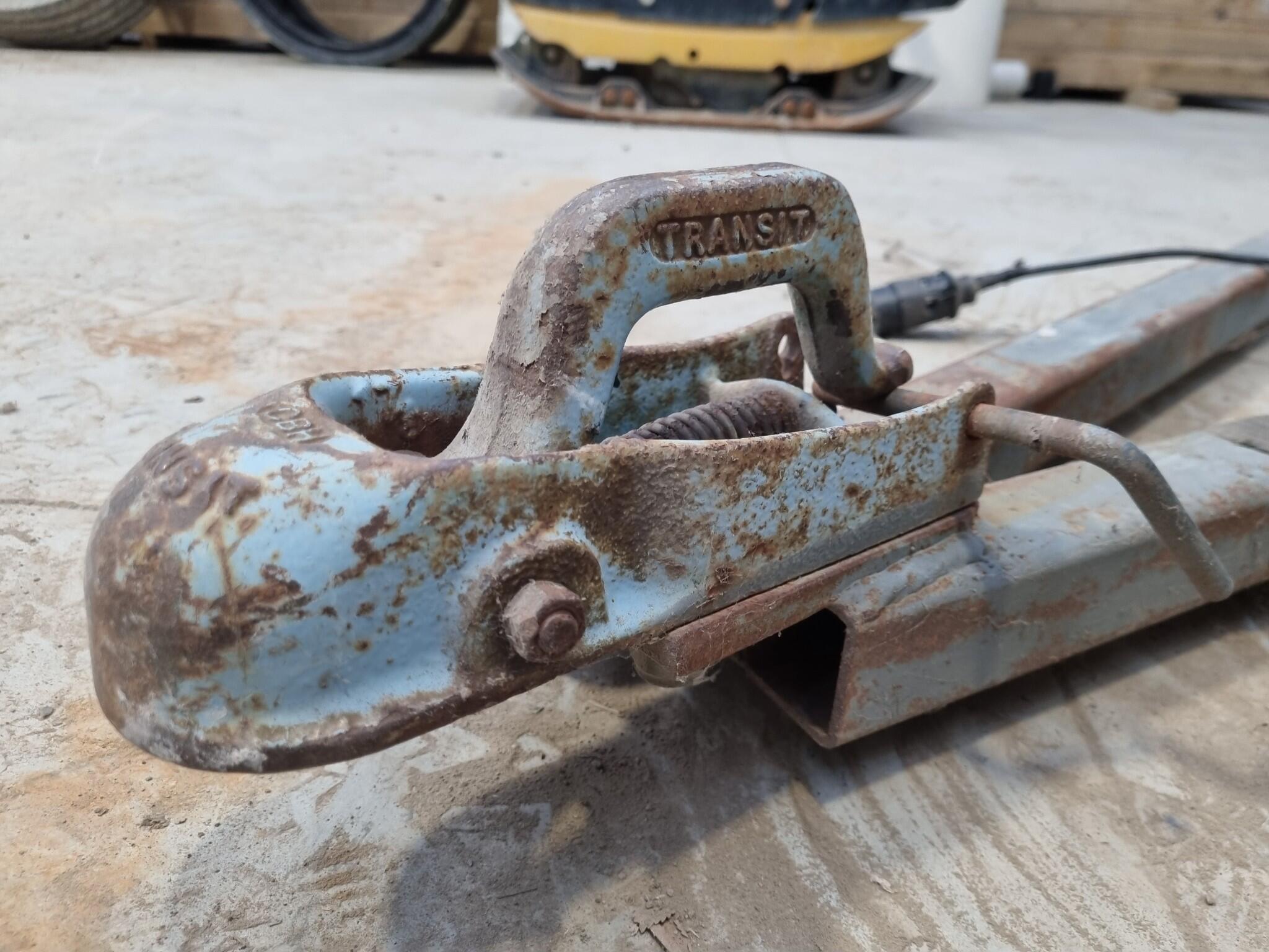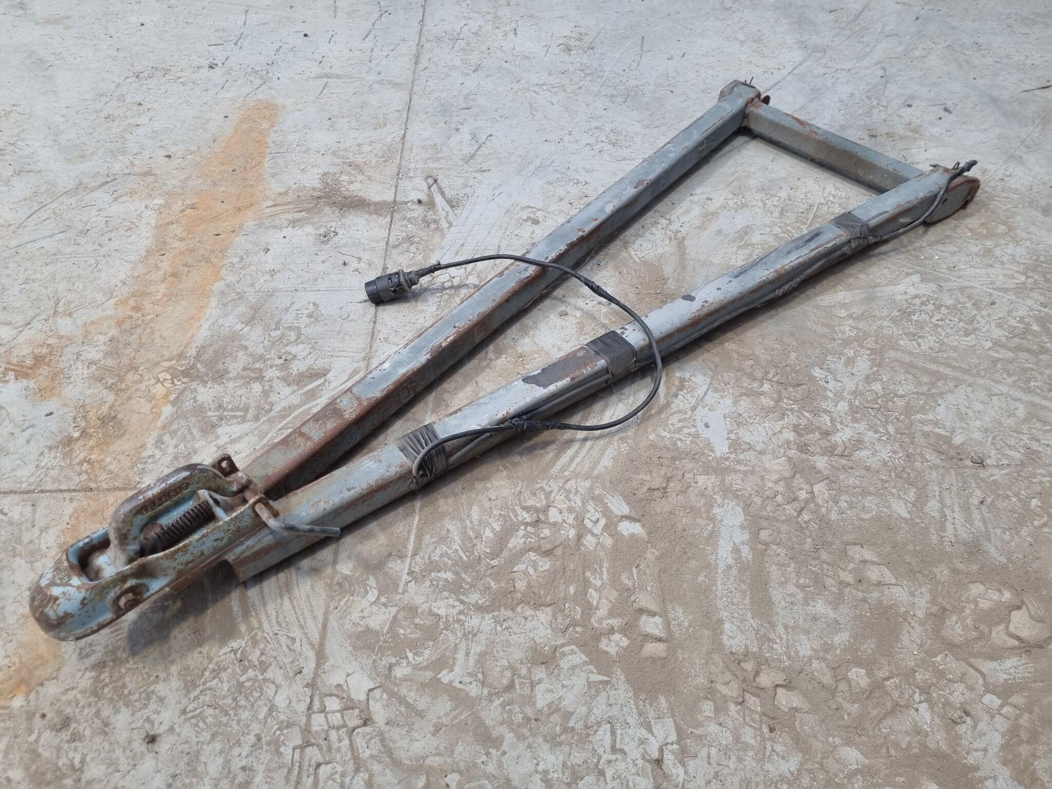 A-Frame Towing Bar Assembly. Transit branded 50mm ball socket Assembly. Mounting pins spacing 460mm wide. Circular power plug. Note that power plug cord shows cuts and damage to outer casing.