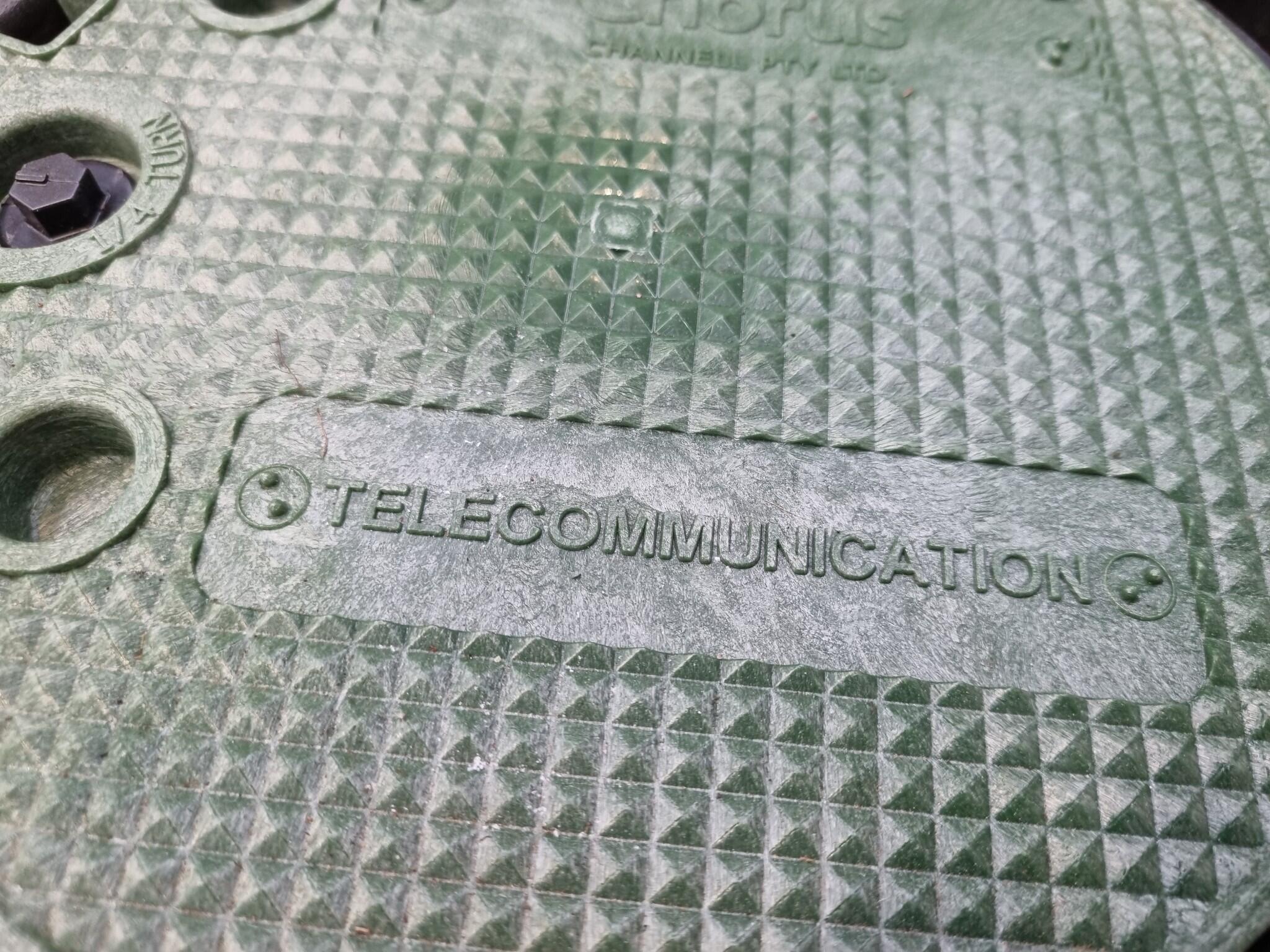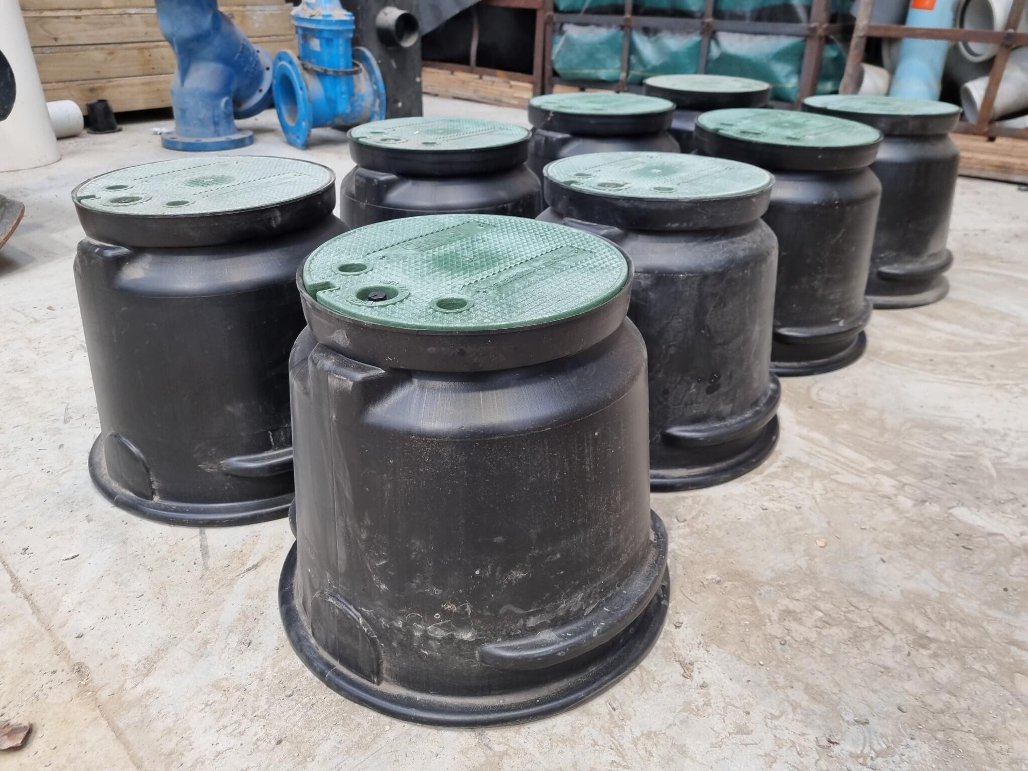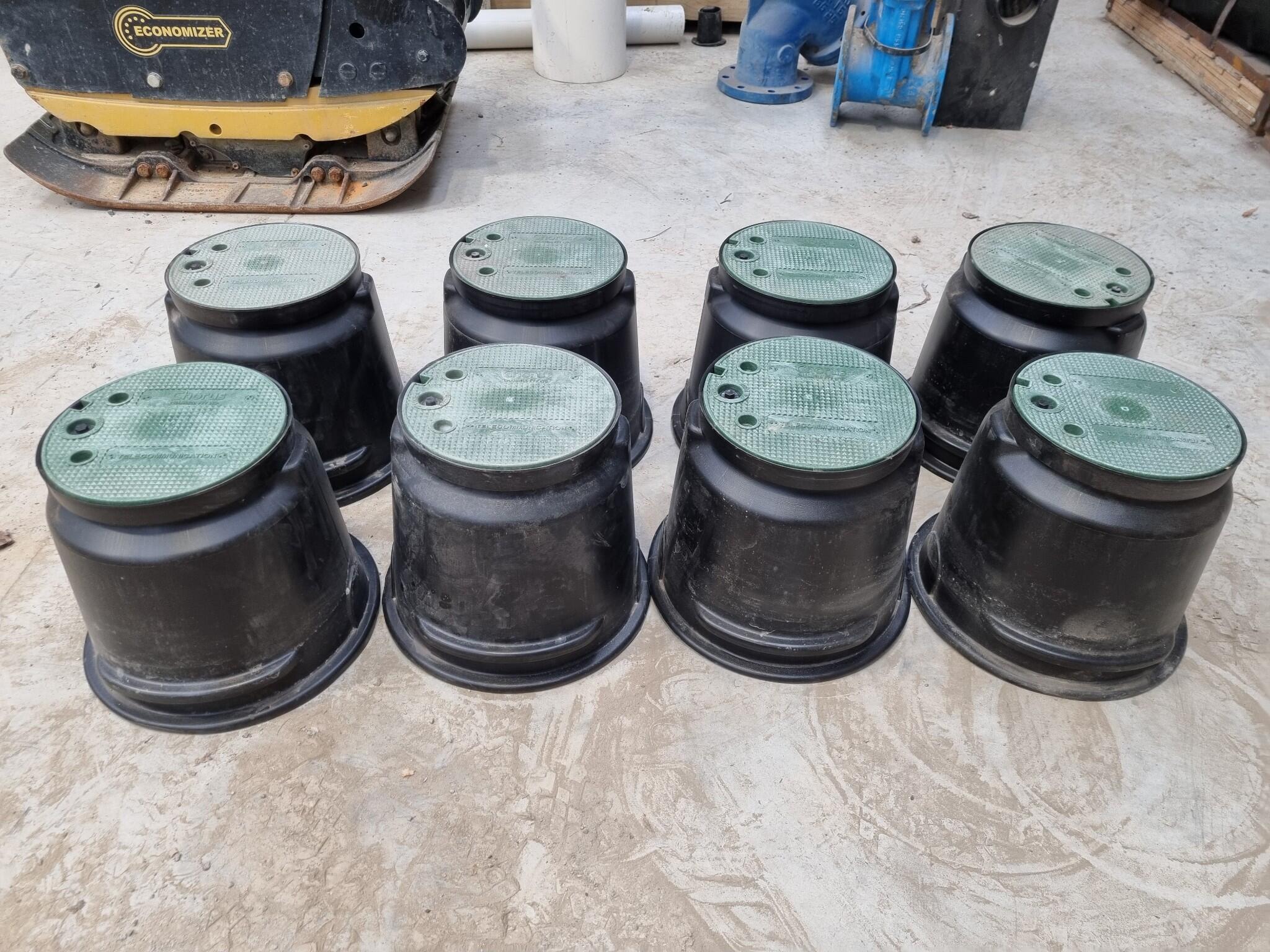 8x In-Ground Telecommunications or Irrigation Junction Boxes. Chorus branded lids 240mm diameter. Base diameters 360mm. Heights 310mm. Plastic construction. Items appear unused, dusty from Workshop storage.