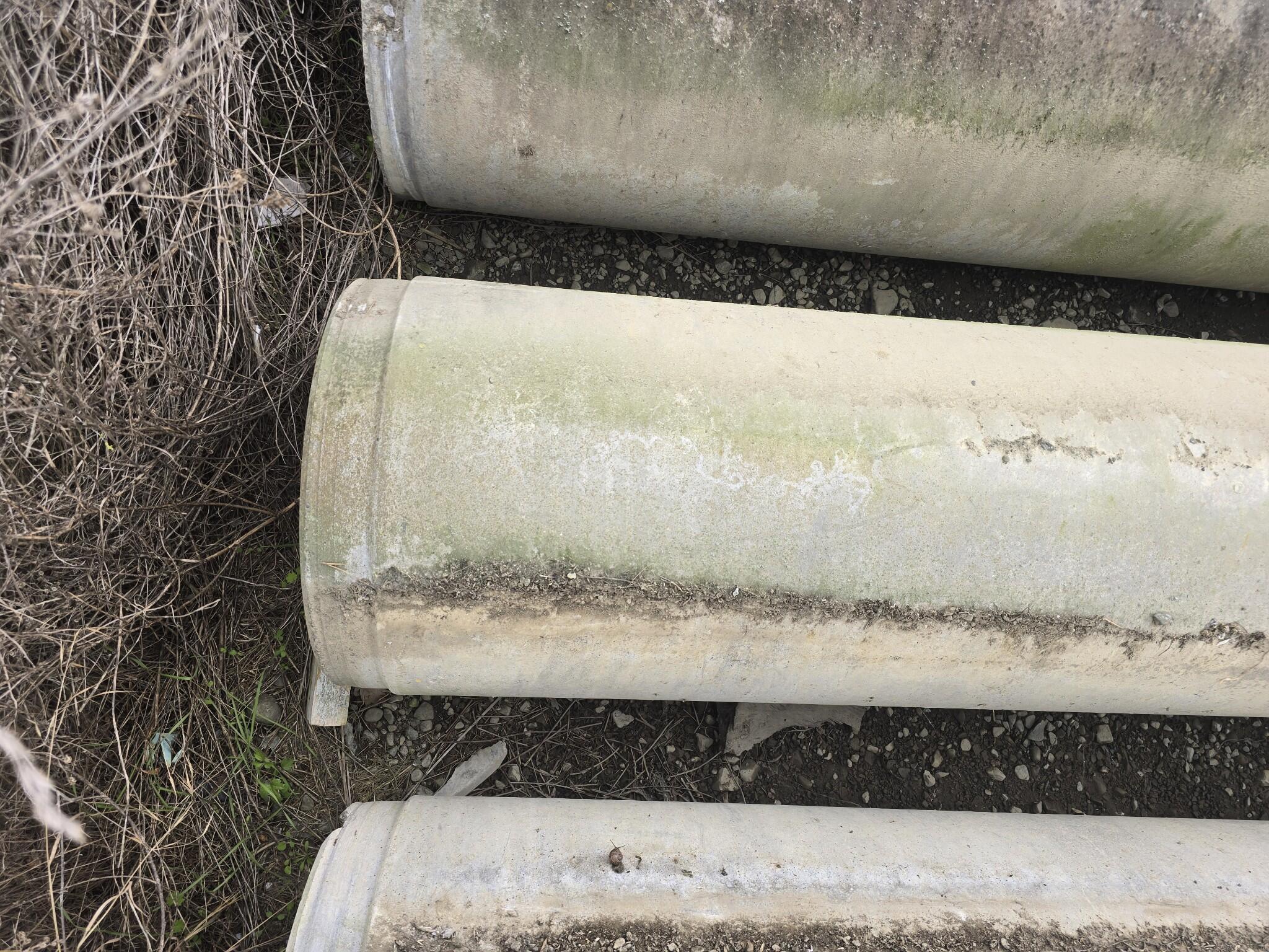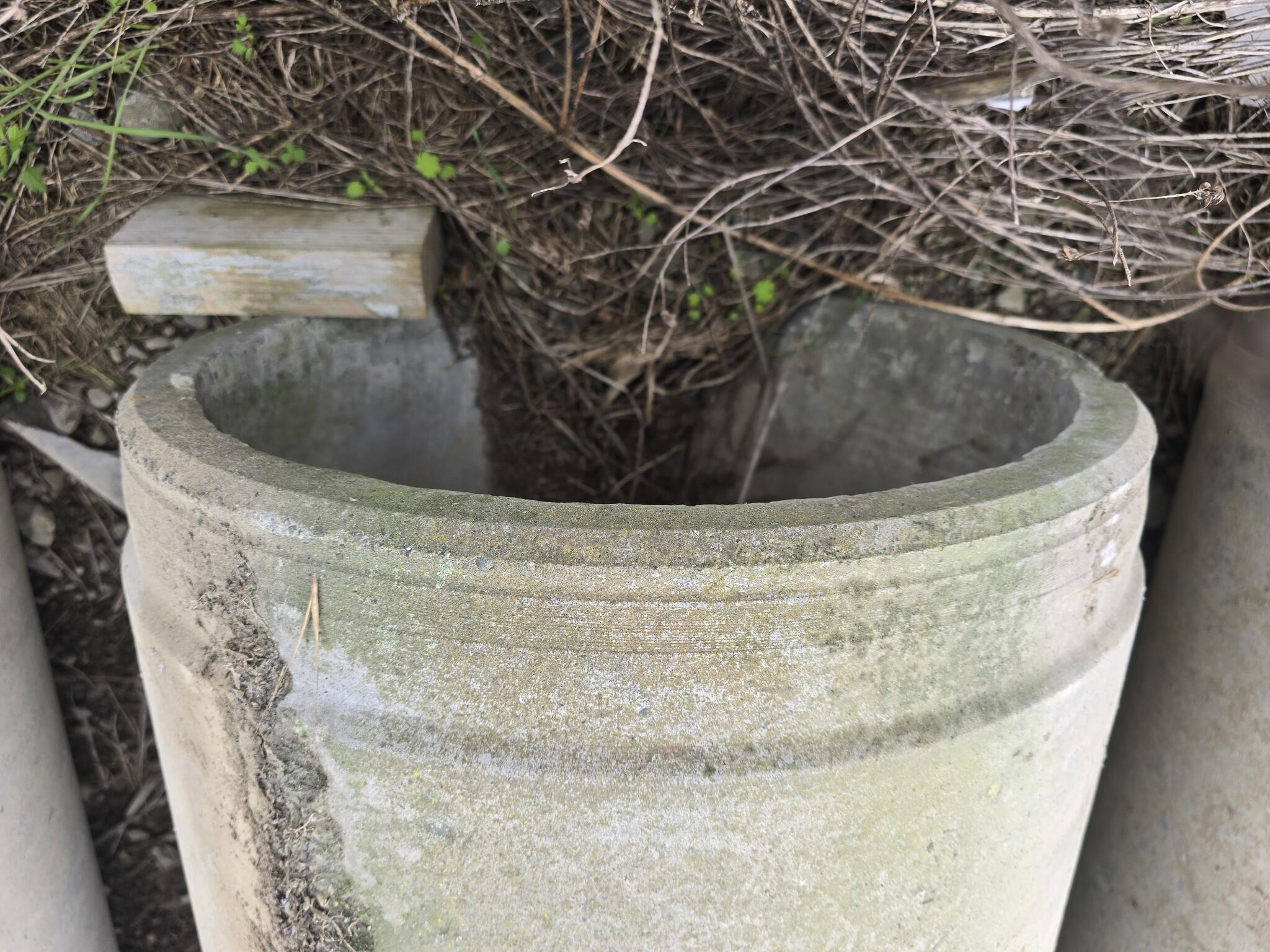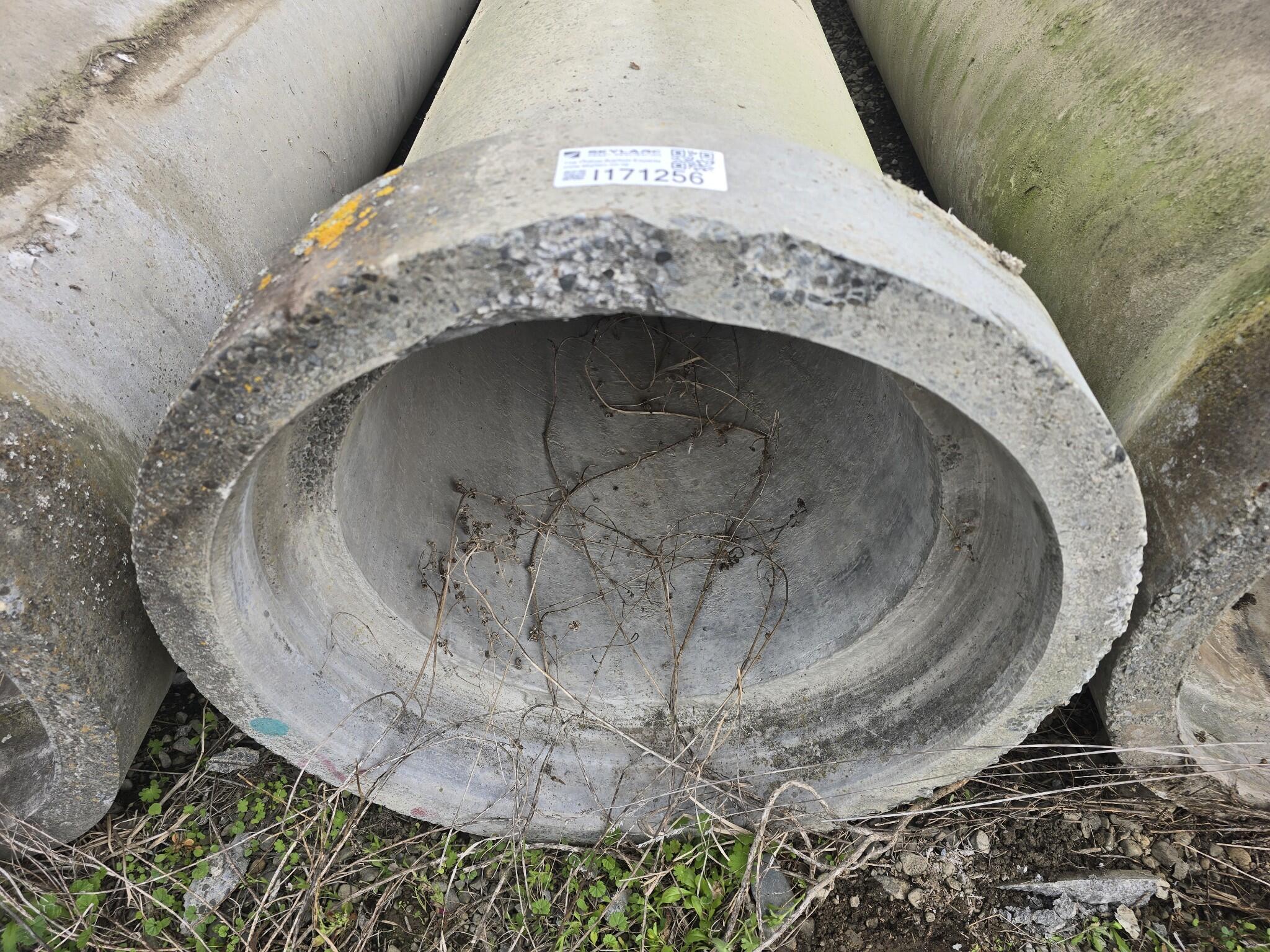 Concrete pipe section. Tapered bell end on one side. 530mm outside diameter at the narrow end. 640mm outside diameter at the wide end.