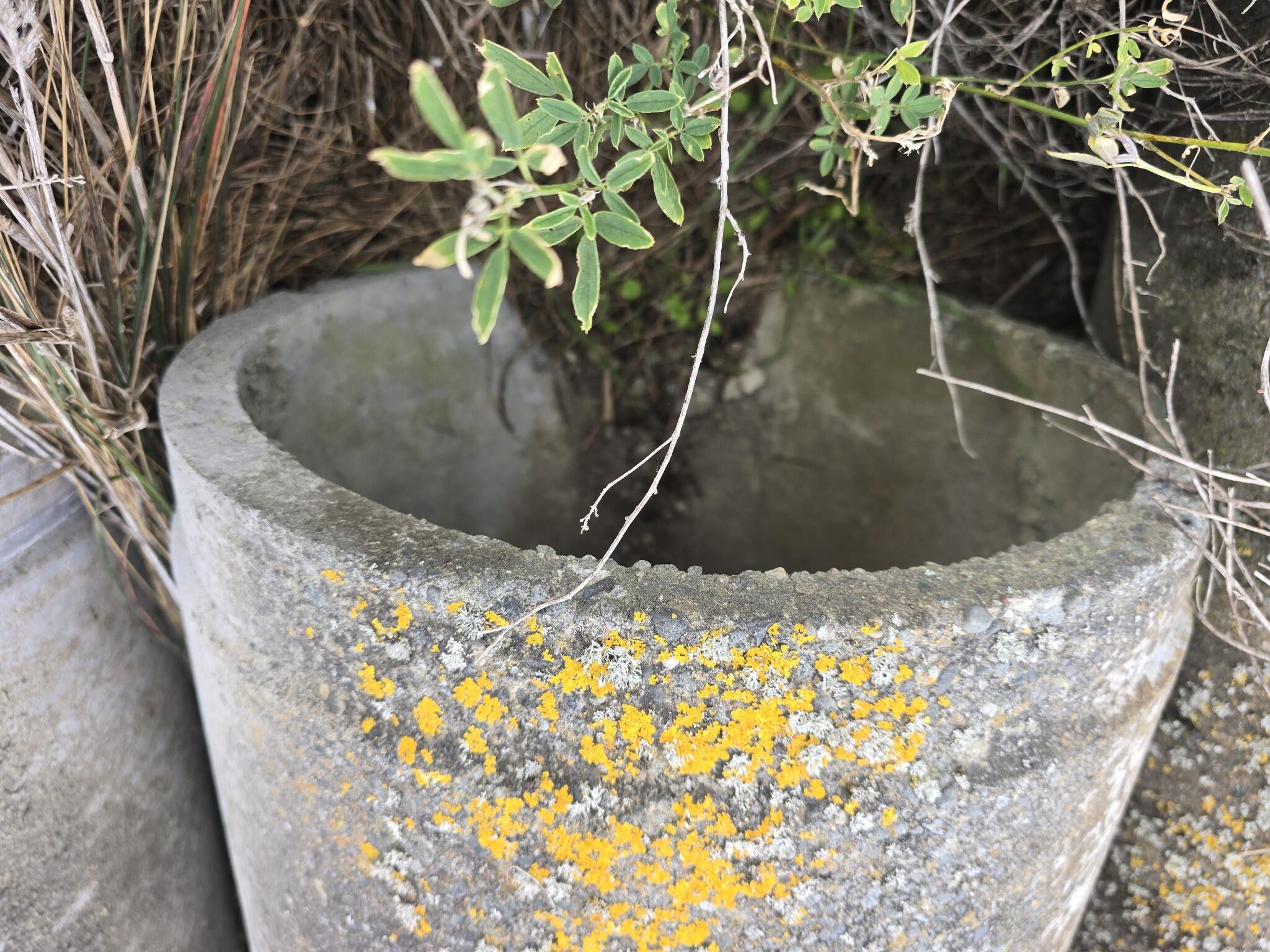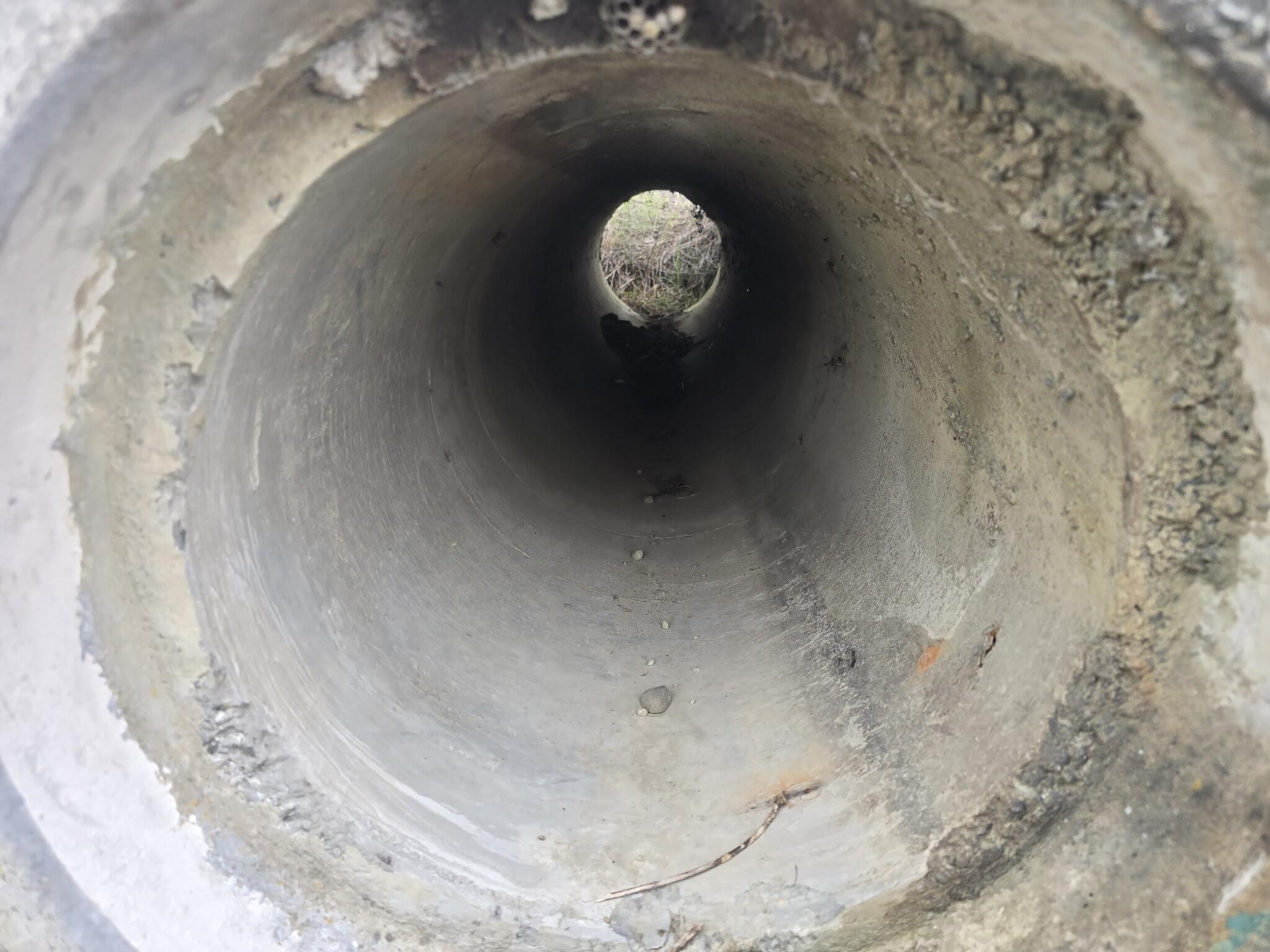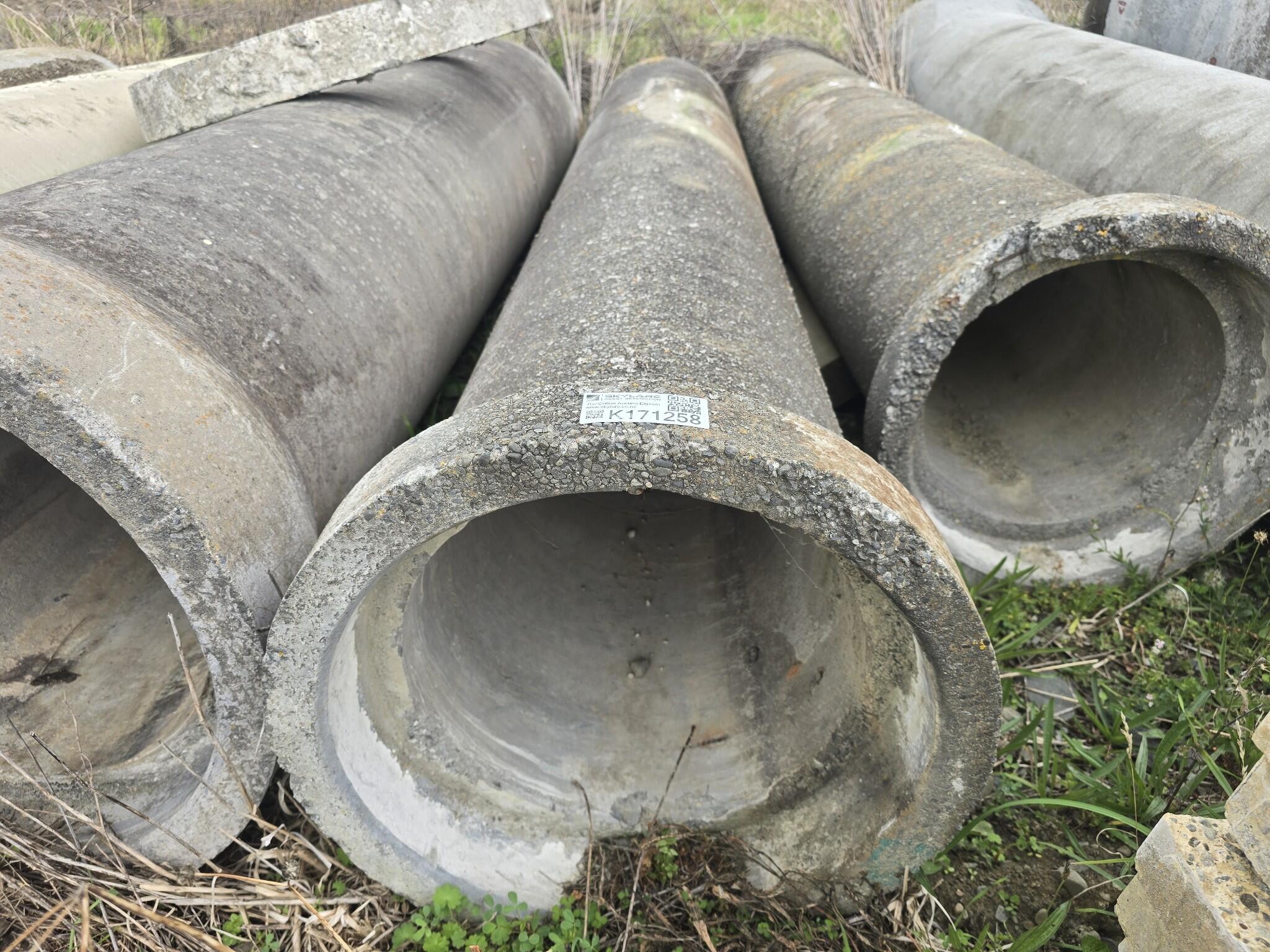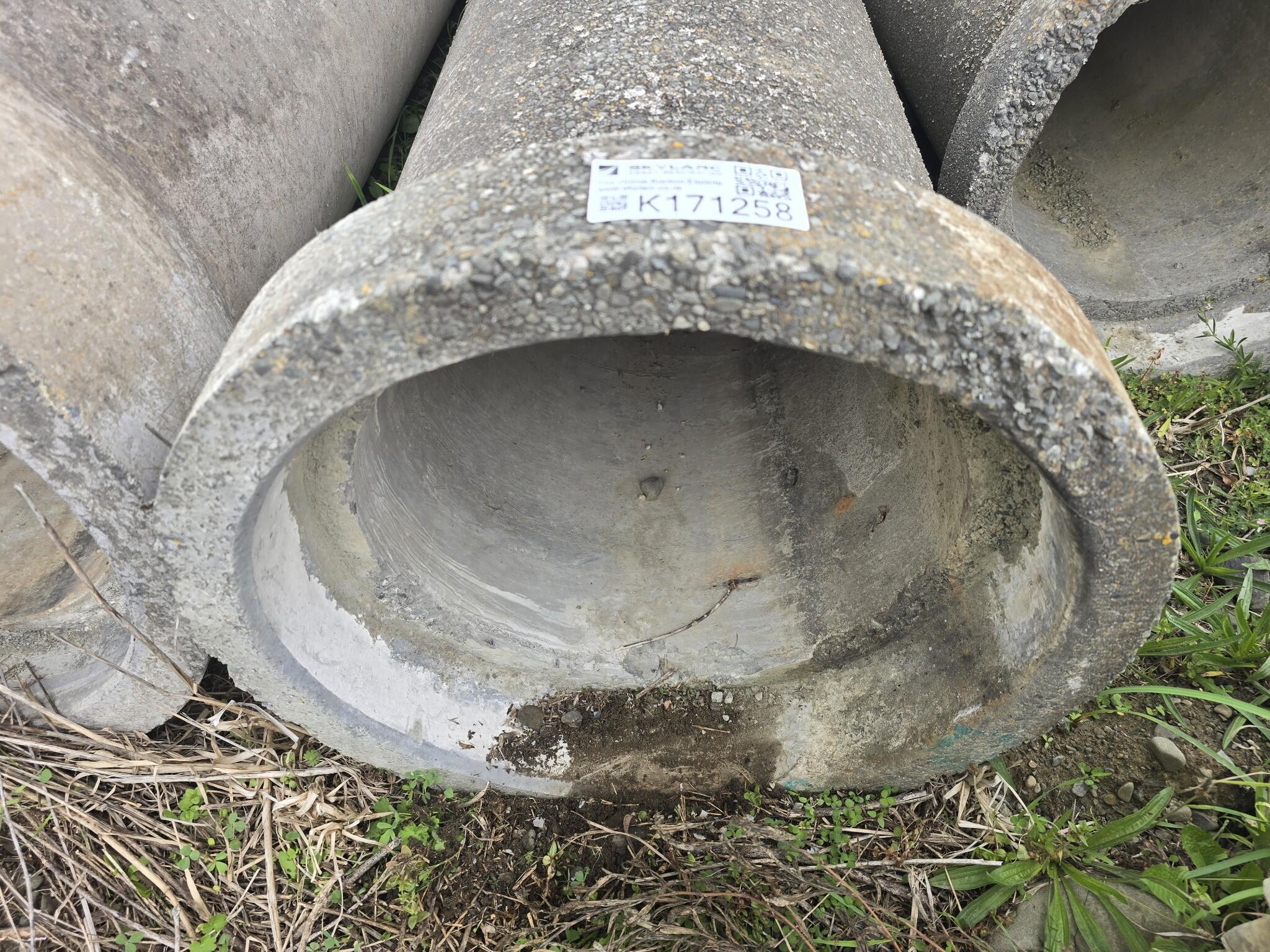 Concrete pipe section. Tapered bell end on one side. 440mm outside diameter at the narrow end. 540mm outside diameter at the wide end.