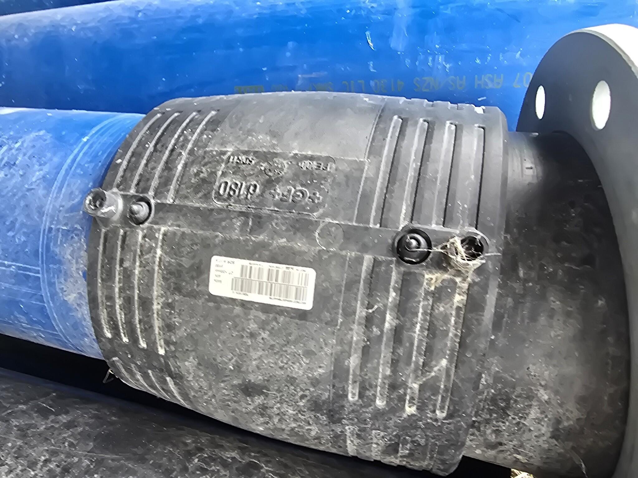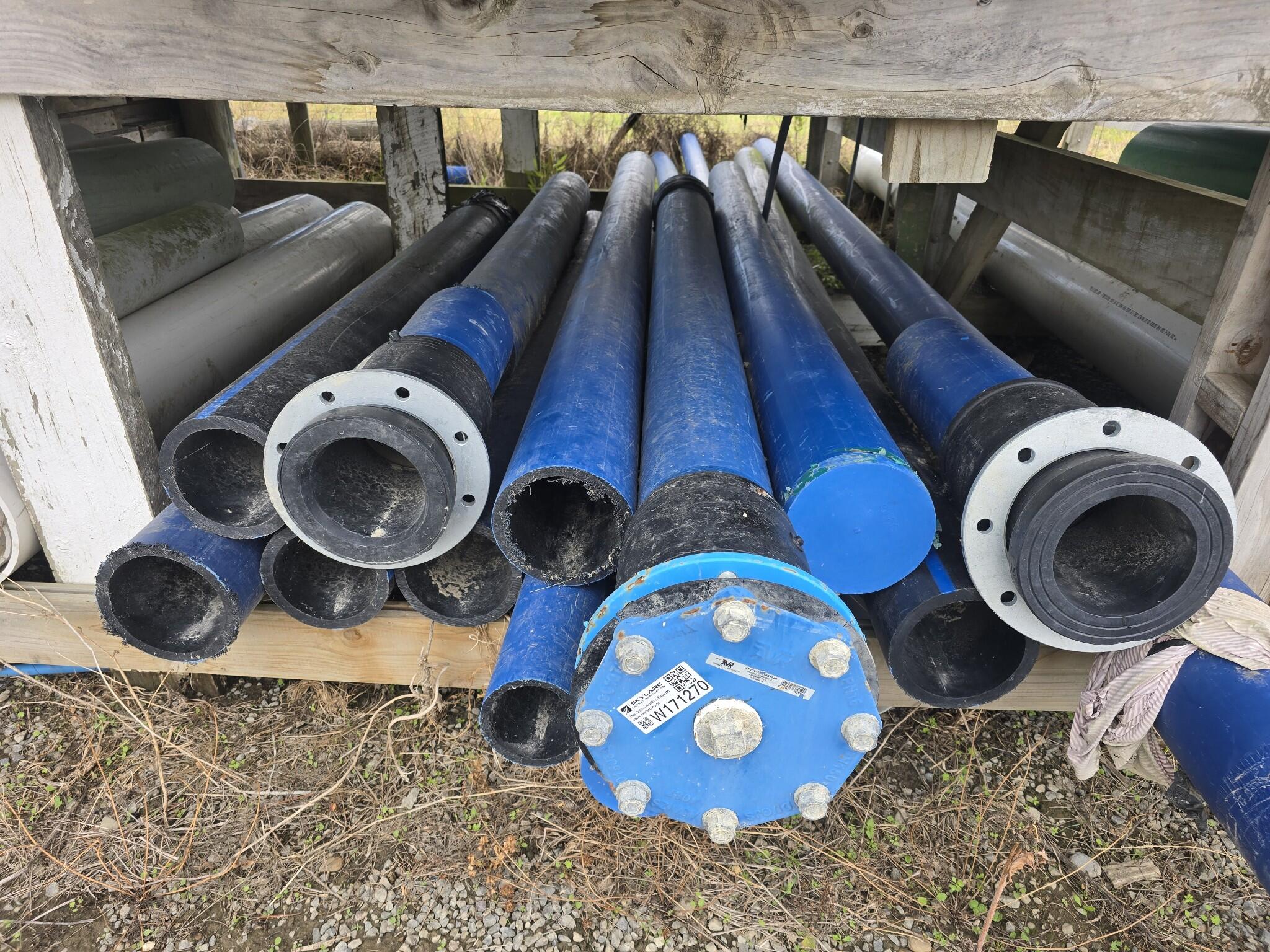 Assorted blue plastic pipe sections. Some sections have black plastic end fittings. Some sections have round flanged ends with bolt holes. Some sections have flat blue end caps. Mainly 180mm outside diameter