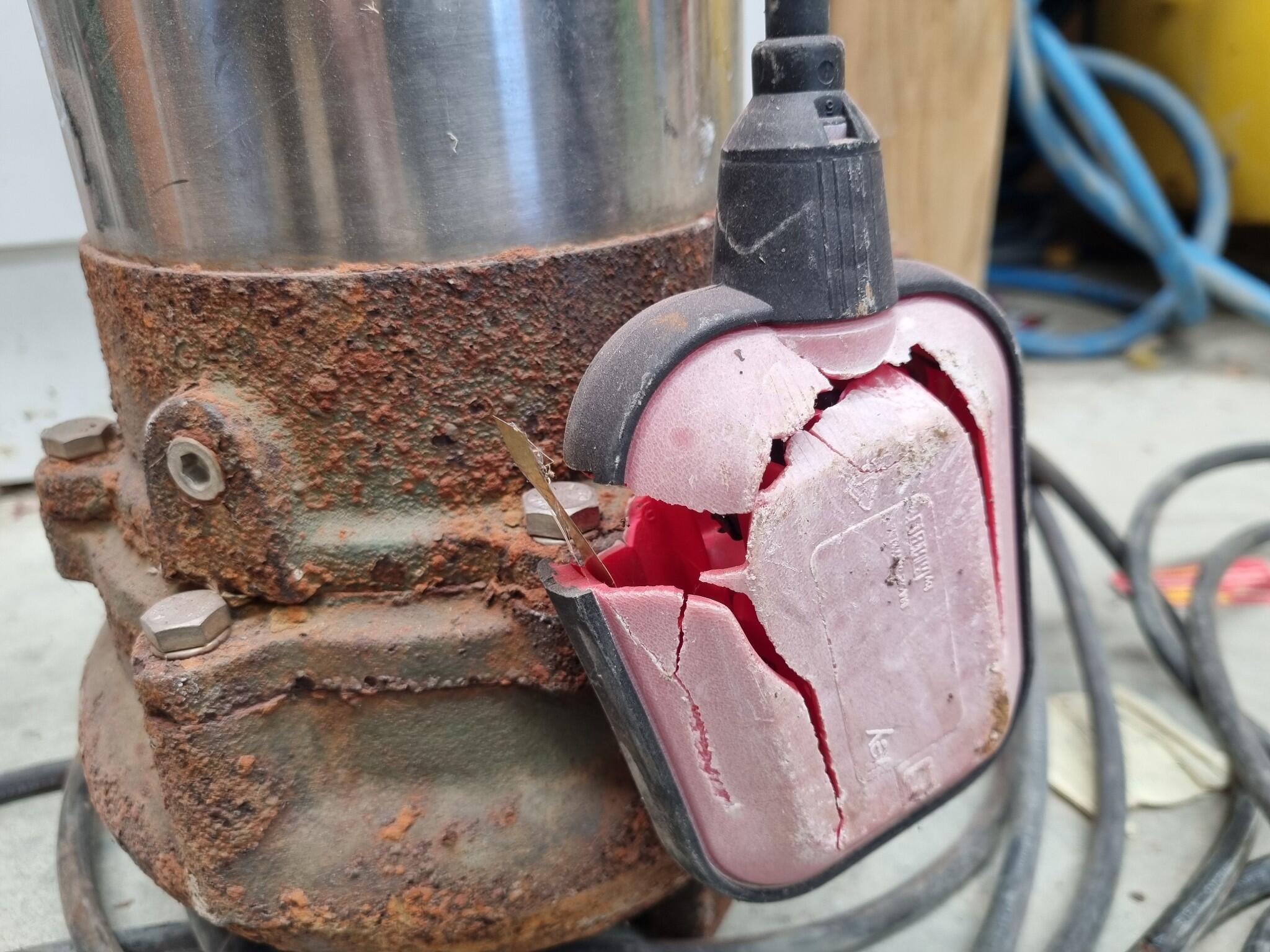 Powers on when plugged in, even when the float is hanging downwards. Float is damaged, see photos