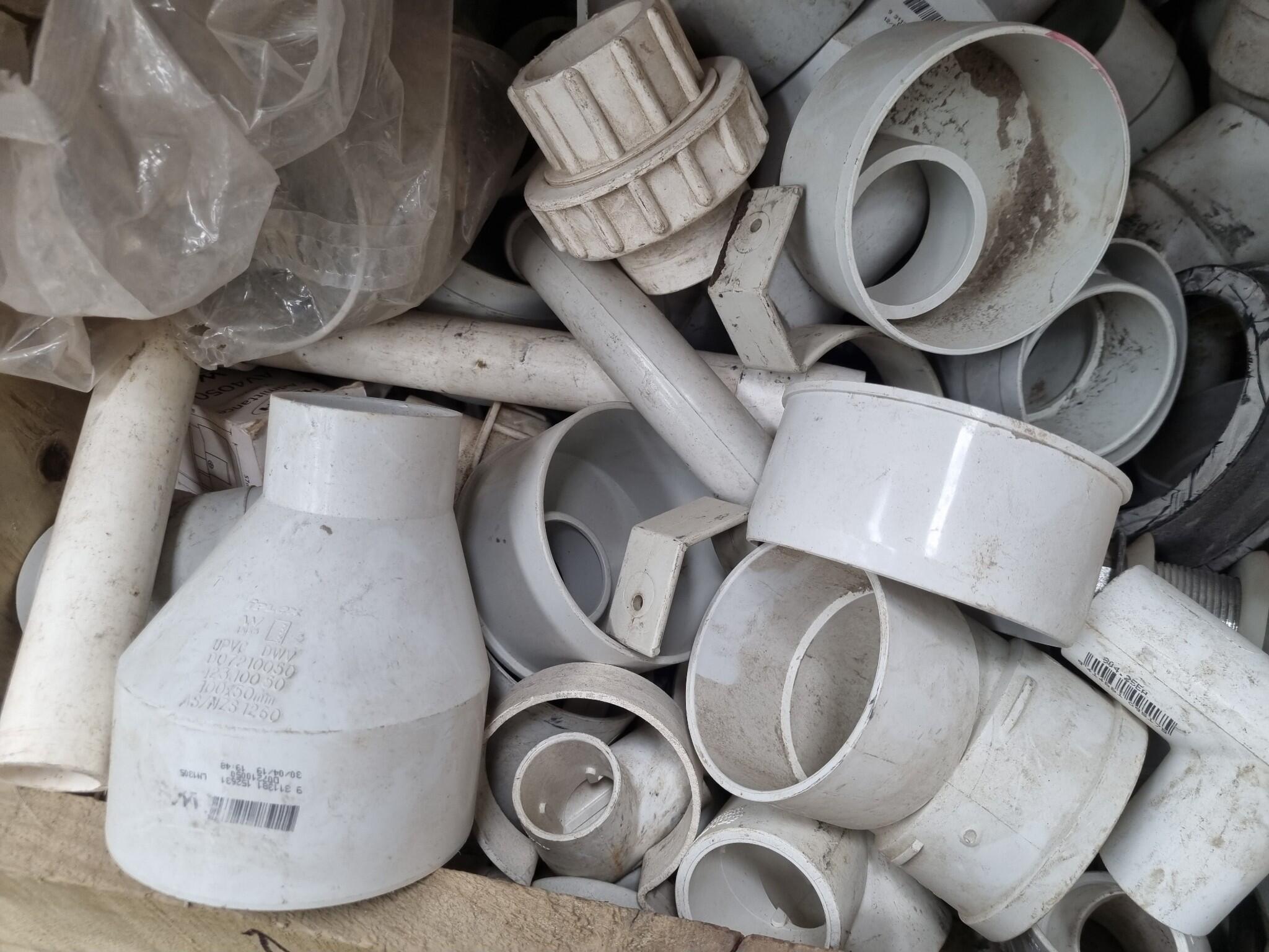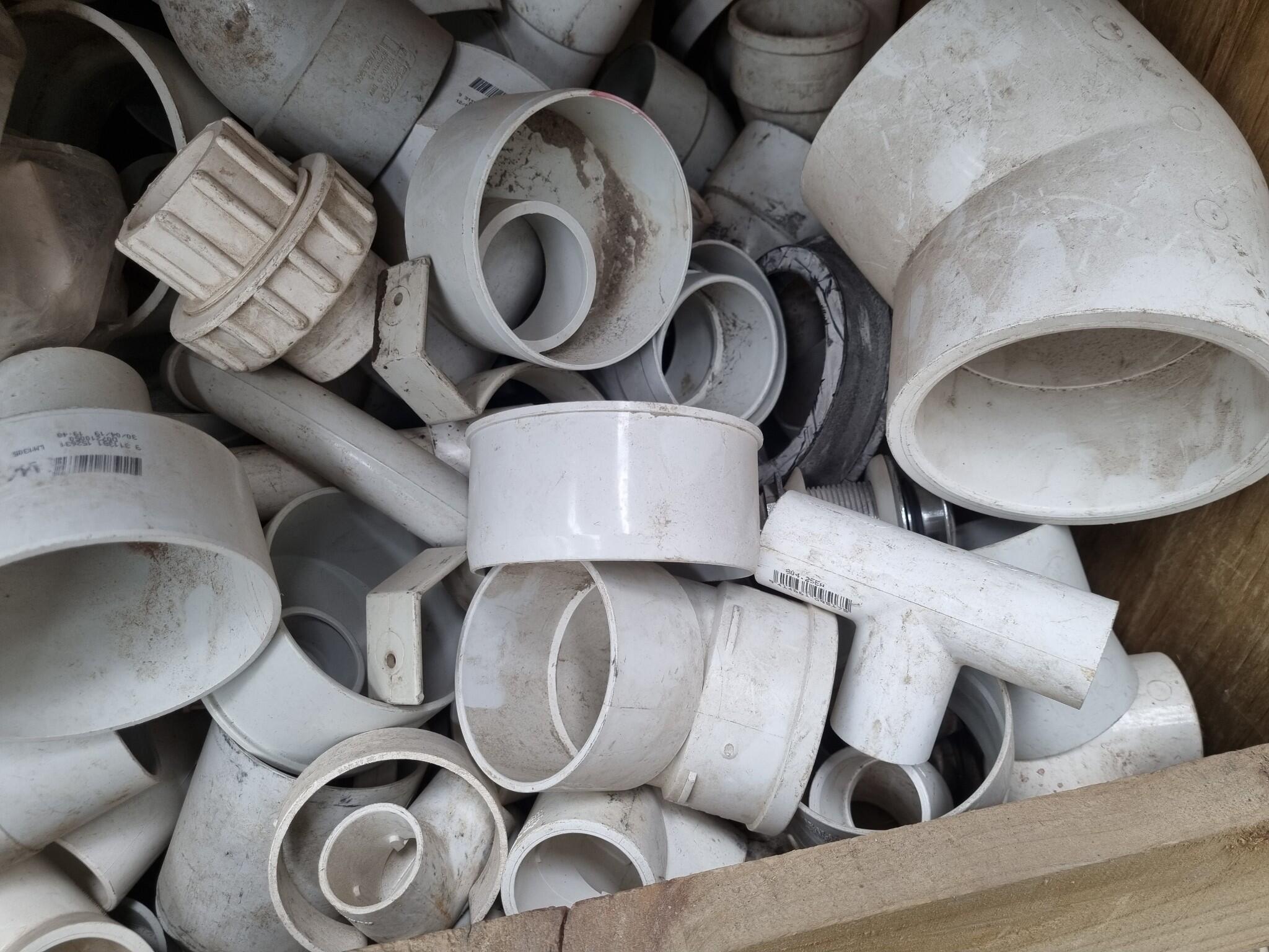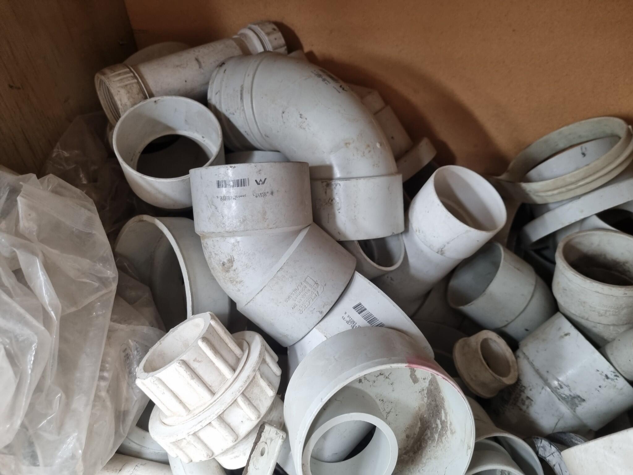 Assorted PVC Pipe Couplings, Fittings, & More. Diameters range up to 110mm. Approx 50+ items in auction. Leftover workshop parts supply stock.