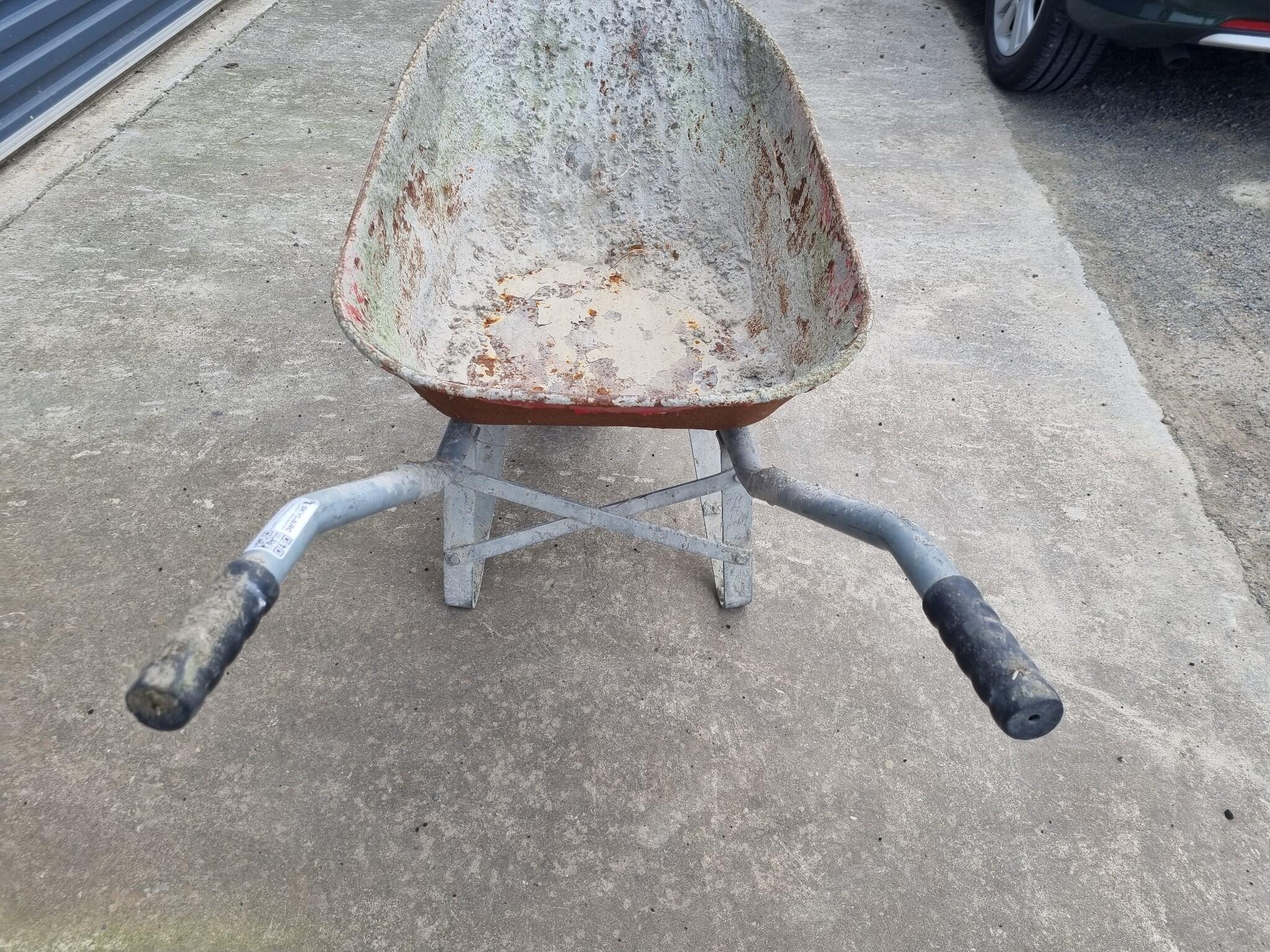 Greens Wheelbarrow. Steel basin approx 960x550x230mm. Galvanised Steel frame. Pneumatic tyre very low on air. Previously used in concrete mixing. Rusty steel basin.